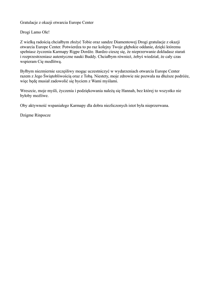Gratulacje z okazji otwarcia Europe Center Drogi Lamo Ole! Z wielką radością chciałbym złożyć Tobie oraz sandze Diamentowej Drogi gratulacje z okazji otwarcia Europe Center. Potwierdza to po raz kolejny Twoje głębokie oddanie, dzięki któremu spełniasz życzenia Karmapy Rigpe Dordże. Bardzo cieszę się, że nieprzerwanie dokładasz starań i rozprzestrzeniasz autentyczne nauki Buddy. Chciałbym również, żebyś wiedział, że cały czas wspieram Cię modlitwą. Byłbym niezmiernie szczęśliwy mogąc uczestniczyć w wydarzeniach otwarcia Europe Center razem z Jego Świątobliwością oraz z Tobą. Niestety, moje zdrowie nie pozwala na dłuższe podróże, więc będę musiał zadowolić się byciem z Wami myślami. Wreszcie, moje myśli, życzenia i podziękowania należą się Hannah, bez której to wszystko nie byłoby możliwe. Oby aktywność wspaniałego Karmapy dla dobra niezliczonych istot była nieprzerwana. Dzigme Rinpocze