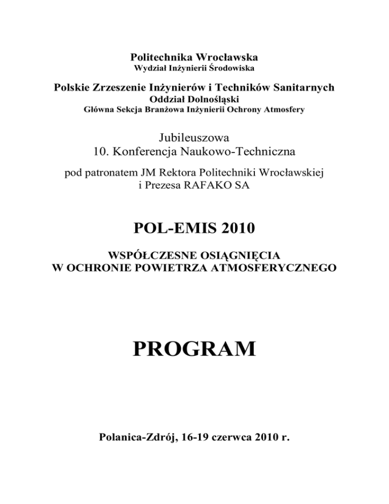 Politechnika Wrocławska Wydział Inżynierii Środowiska Polskie Zrzeszenie Inżynierów i Techników Sanitarnych Oddział Dolnośląski Główna Sekcja Branżowa Inżynierii Ochrony Atmosfery Jubileuszowa 10. Konferencja Naukowo-Techniczna pod patronatem JM Rektora Politechniki Wrocławskiej i Prezesa RAFAKO SA POL-EMIS 2010 WSPÓŁCZESNE OSIĄGNIĘCIA W OCHRONIE POWIETRZA ATMOSFERYCZNEGO PROGRAM Polanica-Zdrój, 16-19 czerwca 2010 r. Komitet Naukowy Przewodniczący: Prof. Jan D. Rutkowski – Politechnika Wrocławska Członkowie: Dr hab. inż. Jan DANIELEWICZ, prof. Politechniki Wrocławskiej Dr hab. inż. Michał GŁOMBA – prof. Politechniki Wrocławskiej Prof. Mieczysław Adam GOSTOMCZYK – Politechnika Wrocławska Prof. Jan KONIECZYŃSKI – IPIŚ PAN Zabrze Prof. Włodzimierz KORDYLEWSKI – Politechnika Wrocławska Prof. Marian MAZUR – AGH Kraków Dr hab. inż. Anna MUSIALIK-PIOTROWSKA – Politechnika Wrocławska Mgr inż. Wiesław RÓŻACKI – RAFAKO SA Prof. Jerzy STRASZKO – Politechnika Szczecińska Prof. Krzysztof WARMUZIŃSKI – IIC PAN Gliwice Prof. Jerzy ZABRZESKI – Politechnika Wrocławska Prof. Roman ZARZYCKI –Politechnika Łódzka Prof. Jerzy ZWOŹDZIAK – Politechnika Wrocławska Komitet Organizacyjny Przewodniczący: Prof. Jan D. RUTKOWSKI Dr inż. Anna MUSIALIK-PIOTROWSKA Dr hab. inż. Michał GŁOMBA, prof. PWr Mgr inż. Piotr KARAŚ – FK RAFAKO SA Dr inż. Józef KUROPKA Dr inż. Marta CZEKAJ Mgr inż. Hanna CYBULSKA-SZULC Mgr inż. Elżbieta SZMIGIELSKA Mgr inż. Franciszek KNOP PROGRAM Środa, 16 czerwca 2010 r. 16oo – otwarcie Biura Konferencji 18oo – kolacja 20oo – powitanie uczestników 10. Konferencji POL-EMIS 2010 Czwartek, 17 czerwca 2010 r. 8oo – śniadanie 900 – otwarcie Konferencji 915–1245 I Sesja Plenarna 915 – Jerzy MIROSŁAW, Jarosław KARKOCHA, Piotr KNURA: Aktualne trendy i możliwości techniczne oczyszczania spalin z instalacji termicznego przekształcania odpadów komunalnych w świetle obowiązujących standardów emisyjnych 930 – Włodzisław ĆWIĄKALSKI, Jerzy SKRZYPSKI: Rola błędów w prowadzeniu instalacji do termicznego przekształcania odpadów w generowaniu nadmiernych misji zanieczyszczeń powietrza 945 – Wojciech MOKROSZ: Ekologiczne aspekty oczyszczania spalin ze spalarni odpadów komunalnych i przemysłowych 10oo – Krzysztof FILIPOWSKI: Doświadczenia firmy CODEL i PENTOL w zakresie realizacji systemów ciągłego monitoringu emisji spalin z kotłów, turbin gazowych, cementowni i innych obiektów 1015 – Michał GŁOMBA, Jerzy MAZUREK: Wpływ parametrów pracy instalacji na skuteczność odsiarczania spalin według mokrej metody wapiennej 1030 – Peter SLADEK: Systemy odkraplaczy stosowane w oczyszczaniu gazów odlotowych w instalacjach odsiarczania spalin (IOS) metodą mokrą 1045 – przerwa na kawę 1115 – Mieczysław Adam GOSTOMCZYK: Badania pełnoprzemysłowe nad ograniczaniem emisji NOx, SO2 i Hg z kotła OP-650 1130 – Janusz LICKI, Anna OSTAPCZUK, Andrzej G. CHMIELEWSKI: Zintegrowana redukcja stężeń wielu gazowych zanieczyszczeń w spalinach napromieniowanych wiązką elektronów z akceleratora 1145 – Robert OLENIACZ: Współspalanie odpadów w suchym piecu cementowym a emisja dwutlenku siarki i chlorowodoru 1200 – Tomasz HARDY, Anna MUSIALIK-PIOTROWSKA, Joanna CIOŁEK, Krzysztof MOŚCICKI, Włodzimierz KORDYLEWSKI: Negatywne efekty związane ze spalaniem i współspalaniem biomasy w kotłach 1215 – Grzegorz WIELGOSIŃSKI, Patrycja ŁECHTAŃSKA: Emisja zanieczyszczeń z procesu spalania biomasy 1230 – Marek JUSZCZAK: Stężenie zanieczyszczeń z kotła o mocy 15 kW zasilanego peletami z łusek słonecznika 1245 – Roman ZARZYCKI: Metody dyfuzyjne w opisie procesów ochrony środowiska – rys historyczny 1300–1400 – obiad 1430–1600 Sesja Posterowa POSTERY 1. Bogdan AMBROŻEK: Odzyskiwanie toluenu z powietrza w cyklicznym układzie TSA z nieruchomym złożem adsorbentu polimerowego 2. Jarosław BIELEWSKI, Iwona GROMBIK, Ireneusz ŚLIWKA, Krzysztof BARAN: Pomiar stężeń wybranych gazów śladowych w powietrzu Krakowa 3. Marek BOGACKI, Robert OLENIACZ, Marian MAZUR, Przemysław SZCZYGŁOWSKI: Emisja zanieczyszczeń pyłowo-gazowych z procesu wypalania półproduktów grafitowych w piecu tunelowym 4. Kazimierz GAJ, Franciszek KNOP, Hanna CYBULSKA-SZULC: Metody i problemy analityczne oceny jakości biogazu 5. Michał GŁOMBA, Elżbieta SZMIGIELSKA: Wpływ stopnia przemiału wapienia na wartość pH i objętość zbiornika zawiesiny absorpcyjnej w IOS według mokrej metody wapiennej 6. Mieczysław A. GOSTOMCZYK, Maria JĘDRUSIK, Arkadiusz ŚWIERCZOK: Ograniczenie emisji rtęci z procesów spalania węgla 7. Szymon HOFFMAN, Rafał JASIŃSKI: Algorytm uzupełniania brakujących danych w zbiorach rejestrowanych na stacjach monitoringu powietrza 8. Józef KUROPKA: Usuwanie tlenków azotu z przemysłowych gazów odlotowych 9. Barbara KUCHARCZYK, Włodzimierz TYLUS: Wpływ rodzaju promotora i dodatku reduktorów na aktywność katalizatorów palladowych w utlenianiu metanu w powietrzu wentylacyjnym kopalń 10. Grzegorz KUSZA, Zygmunt STRZYSZCZ, Beata GOŁUCHOWSKA: Podatność magnetyczna pyłów cementowo-wapienniczych Opolszczyzny i jej wykorzystania w monitoringu zagrożeń środowiska glebowego 11. Krystyna LECH-BRZYK, Adam SIKORA: Badania instalacji do adsorpcji zanieczyszczeń organicznych emitowanych w zakładzie produkcji papy w aspekcie ograniczenia uciążliwości zapachowej 12. Anna MUSIALIK-PIOTROWSKA, Tomasz BUKATA: Wpływ dodatków paliwowych na skład spalin silników o zapłonie samoczynnym 13. Halina PYTA, Rafał ZAJUSZ: Lotne związki organiczne w powietrzu obszarów zurbanizowanych na przykładzie Zabrza 14. Izabela SÓWKA, Paweł ZWOŹDZIAK, Mirosław SZKLARCZYK, Jerzy ZWOŹDZIAK, Alicja NYCH: Biofiltracja jako metoda dezodoryzacji gazów odlotowych wyzwalanych ze ścieków browarniczych 15. Mirosław SZKALRCZYK, Waldemar ADAMIAK, Paweł ZWOŹDZIAK: Wpł