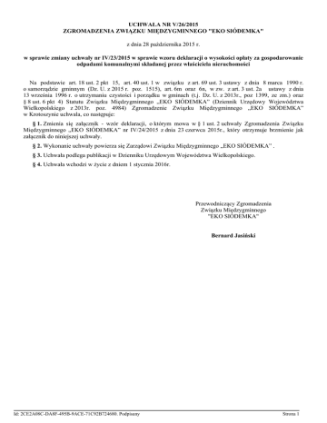 UCHWAŁA NR V/26/2015 ZGROMADZENIA ZWIĄZKU MIĘDZYGMINNEGO "EKO SIÓDEMKA" z dnia 28 października 2015 r. w sprawie zmiany uchwały nr IV/23/2015 w sprawie wzoru deklaracji o wysokości opłaty za gospodarowanie odpadami komunalnymi składanej przez właściciela nieruchomości Na podstawie art. 18 ust. 2 pkt 15, art. 40 ust. 1 w związku z art. 69 ust. 3 ustawy z dnia 8 marca 1990 r. o samorządzie gminnym (Dz. U. z 2015 r. poz. 1515), art. 6m oraz 6n, w zw. z art. 3 ust. 2a ustawy z dnia 13 września 1996 r. o utrzymaniu czystości i porządku w gminach (t.j. Dz. U. z 2013r., poz 1399, ze zm.) oraz § 8 ust. 6 pkt 4) Statutu Związku Międzygminnego „EKO SIÓDEMKA” (Dziennik Urzędowy Województwa Wielkopolskiego z 2013r. poz. 4984) Zgromadzenie Związku Międzygminnego „EKO SIÓDEMKA” w Krotoszynie uchwala, co następuje: § 1. Zmienia się załącznik - wzór deklaracji, o którym mowa w § 1 ust. 2 uchwały Zgromadzenia Związku Międzygminnego „EKO SIÓDEMKA” nr IV/24/2015 z dnia 23 czerwca 2015r., który otrzymuje brzmienie jak załącznik do niniejszej uchwały. § 2. Wykonanie uchwały powierza się Zarządowi Związku Międzygminnego „EKO SIÓDEMKA” . § 3. Uchwała podlega publikacji w Dzienniku Urzędowym Województwa Wielkopolskiego. § 4. Uchwała wchodzi w życie z dniem 1 stycznia 2016r. Przewodniczący Zgromadzenia Związku Międzygminnego "EKO SIÓDEMKA" Bernard Jasiński Id: 2CE2A08C-DA8F-495B-9ACE-71C92B724680. Podpisany Strona 1 Załącznik do Uchwały Nr V/26/2015 Zgromadzenia Związku Międzygminnego EKO SIÓDEMKA z dnia 28 października 2015 r. DEKLARACJA O WYSOKOŚCI OPŁATY ZA GOSPODAROWANIE ODPADAMI KOMUNALNYMI Podstawa prawna: Ustawa z dnia 13 września 1996 r. o utrzymaniu czystości i porządku w gminach (tekst jedn. Dz. U. z 2013 r. poz.1399 ze zm.) Zobowiązany do złożenia deklaracji: Deklarację zobowiązani są złożyć właściciele nieruchomości zamieszkałych oraz właściciele nieruchomości niezamieszkałych (na terenie których powstają odpady komunalne), położonych na terenie Związku Międzygminnego „EKO SIÓDEMKA”. Za właściciela uważa się także współwłaściciela, użytkownika wieczystego, osobę posiadającą nieruchomość w zarządzie lub użytkowaniu a także inne podmioty władające nieruchomością Miejsce składania: Związek Międzygminny „EKO SIÓDEMKA” ul. Kołłątaja 7, 63-700 Krotoszyn Termin złożenia deklaracji: a) pierwszą deklarację - 14 dni od dnia zamieszkania na danej nieruchomości pierwszego mieszkańca lub powstania na danej nieruchomości odpadów komunalnych, b) 14 dni od nastąpienia zmiany danych będących podstawą ustalenia wysokości należnej opłaty za gospodarowanie odpadami komunalnymi lub od zmiany określonej w deklaracji ilości odpadów komunalnych powstających na danej nieruchomości. Opłatę za gospodarowanie odpadami komunalnymi w zmienionej wysokości uiszcza się za miesiąc, w którym nastąpiła zmiana. Organ właściwy do złożenia deklaracji: Zarząd Związku Międzygminnego „EKO SIÓDEMKA” WYPEŁNIAĆ NALEŻY JASNE POLA DUŻYMI, DRUKOWANYMI LITERAMI, KOLOREM CZARNYM LUB NIEBIESKIM, ODPOWIEDNIE POLE „" OZNACZYĆ, STAWIAJĄC ZNAK „X” A. OKOLICZNOŚCI POWODUJĄCE OBOWIĄZEK ZŁOŻENIA DEKLARACJI Złożenie pierwszej deklaracji Zmiana danych zawartych w deklaracji Zmiana danych zawartych w deklaracji mająca wpływ na wysokość opłaty niewpływająca na wysokość opłaty B. SKŁADAJĄCY DEKLARACJĘ Właściciel, posiadacz nieruchomości Współwłaściciel, współposiadacz nieruchomości (liczba współwłaścicieli ………….) Użytkownik wieczysty nieruchomości Zarządca nieruchomości (w przypadku, gdy nieruchomość jest zabudowana budynkami wielolokalowymi, w których ustanowiono odrębną własność lokali) Podmiot wyznaczony na podstawie umowy poprzez kilka podmiotów do władania nieruchomością Rok i miesiąc, w którym nastąpiła zmiana będąca podstawą ustalenia wysokości należnej opłaty za gospodarowanie odpadami komunalnymi 2 0 1 2 3 4 5 6 7 8 9 10 11 12 C. DANE SKŁADAJĄCEGO DEKLARACJE / DANE NIERUCHOMOŚCI Osoba fizyczna Osoba prawna Jednostka organizacyjna nie posiadająca osobowości prawnej Imię, Nazwisko / Pełna nazwa PESEL REGON C.1. Adres nieruchomości z której odbierane będą odpady komunalne (dla każdej nieruchomości należy złożyć oddzielną deklarację) Miejscowość Ulica Nr domu Nr lokalu Nr ewidencyjny nieruchomości w rejestrze gruntów (w przypadku braku nadania nr domu) Str. 1 / 4 Id: 2CE2A08C-DA8F-495B-9ACE-71C92B724680. Podpisany Strona 1 C.2. Adres zamieszkania (lub adres siedziby składającego deklarację) Gmina Miejscowość - Kod pocztowy Poczta Ulica Nr domu Nr lokalu C.3. Adres do korespondencji (wypełnić, jeżeli adres do korespondencji jest inny niż w części C.2) Gmina Miejscowość - Kod pocztowy Poczta Ulica Nr lokalu Nr domu C.4. Dane kontaktowe (dane dobrowolne) Nr telefonu Adres e-mail C.5. Oświadczam, że na terenie nieruchomości wskazanej w części C.1. odpady będą zbierane w sposób selektywny, zgodnie z regulaminem utrzymania czystości i porządku na terenie Związku Międzygminnego „EKO SIÓDEMKA”. tak Nie CZĘŚĆ DOTYCZĄCA OPŁATY ZA GOSPODAROWANIE ODPADAMI KOMUNALNYMI UWAGA: właściciel nieruchomości zamieszkałej wypełnia część D, właściciel nieruchomości niezamieszkałej (na której powstają odpady komunalne) wypełnia część E, właściciel nieruchomości w części zamieszkałej, a w części niezamieszkałej (na terenie której powstają odpady komunalne) wypełnia części D i E. CZĘŚĆ D - DOTYCZĄCA NIERUCHOMOŚCI ZAMIESZKAŁEJ D.1. Deklaruję następującą ilość osób zamieszkujących nieruchomość wskazaną w części C.1. niniejszej deklaracji osób (należy podać liczbę mieszkańców) 1 - miejscem zamieszkania, jest nieruchomość, w której osoba przebywa z zamiarem stałego pobytu, niezależnie od miejsca zameldowa