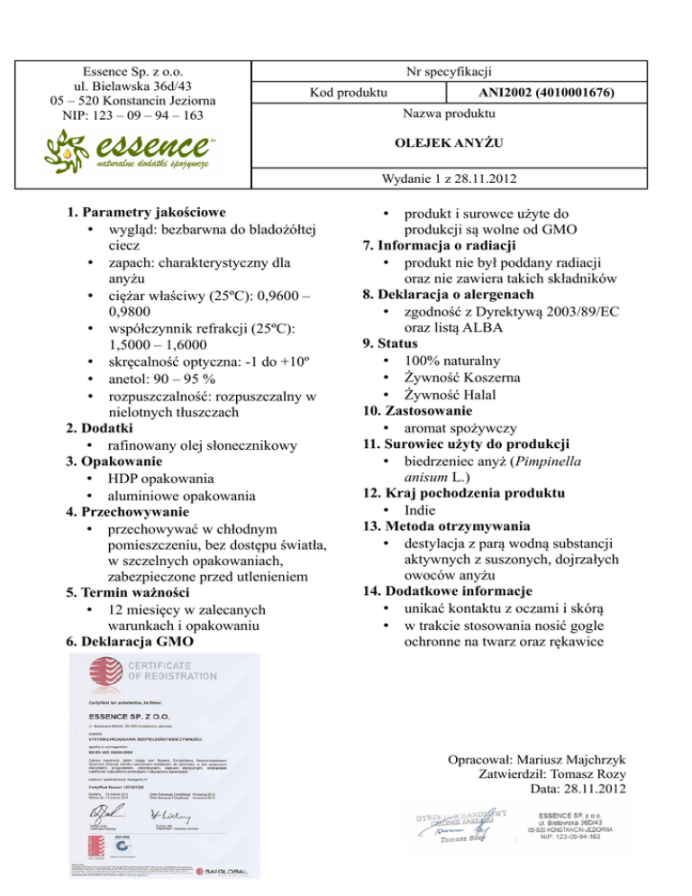 Essence Sp. z o.o. ul. Bielawska 36d/43 05 – 520 Konstancin Jeziorna NIP: 123 – 09 – 94 – 163 Nr specyfikacji Kod produktu ANI2002 (4010001676) Nazwa produktu OLEJEK ANYŻU Wydanie 1 z 28.11.2012 1. Parametry jakościowe • wygląd: bezbarwna do bladożółtej ciecz • zapach: charakterystyczny dla anyżu • ciężar właściwy (25ºC): 0,9600 – 0,9800 • współczynnik refrakcji (25ºC): 1,5000 – 1,6000 • skręcalność optyczna: -1 do +10º • anetol: 90 – 95 % • rozpuszczalność: rozpuszczalny w nielotnych tłuszczach 2. Dodatki • rafinowany olej słonecznikowy 3. Opakowanie • HDP opakowania • aluminiowe opakowania 4. Przechowywanie • przechowywać w chłodnym pomieszczeniu, bez dostępu światła, w szczelnych opakowaniach, zabezpieczone przed utlenieniem 5. Termin ważności • 12 miesięcy w zalecanych warunkach i opakowaniu 6. Deklaracja GMO produkt i surowce użyte do produkcji są wolne od GMO 7. Informacja o radiacji • produkt nie był poddany radiacji oraz nie zawiera takich składników 8. Deklaracja o alergenach • zgodność z Dyrektywą 2003/89/EC oraz listą ALBA 9. Status • 100% naturalny • Żywność Koszerna • Żywność Halal 10. Zastosowanie • aromat spożywczy 11. Surowiec użyty do produkcji • biedrzeniec anyż (Pimpinella anisum L.) 12. Kraj pochodzenia produktu • Indie 13. Metoda otrzymywania • destylacja z parą wodną substancji aktywnych z suszonych, dojrzałych owoców anyżu 14. Dodatkowe informacje • unikać kontaktu z oczami i skórą • w trakcie stosowania nosić gogle ochronne na twarz oraz rękawice • Opracował: Mariusz Majchrzyk Zatwierdził: Tomasz Rozy Data: 28.11.2012