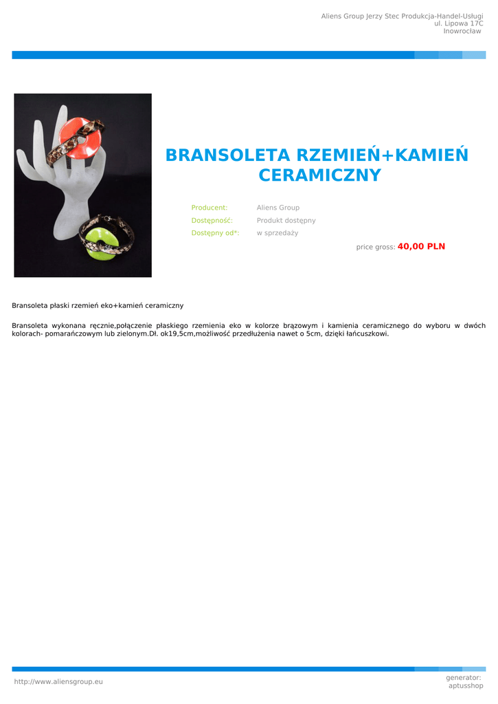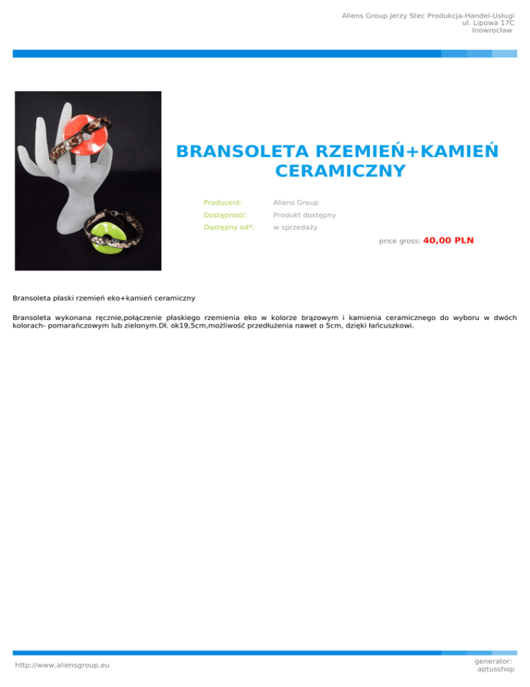 Aliens Group Jerzy Stec Produkcja-Handel-Usługi ul. Lipowa 17C Inowrocław BRANSOLETA RZEMIEŃ+KAMIEŃ CERAMICZNY Producent: Aliens Group Dostępność: Produkt dostępny Dostępny od*: w sprzedaży price gross: 40,00 PLN Bransoleta płaski rzemień eko+kamień ceramiczny Bransoleta wykonana ręcznie,połączenie płaskiego rzemienia eko w kolorze brązowym i kamienia ceramicznego do wyboru w dwóch kolorach- pomarańczowym lub zielonym.Dł. ok19,5cm,możliwość przedłużenia nawet o 5cm, dzięki łańcuszkowi. http://www.aliensgroup.eu generator: aptusshop