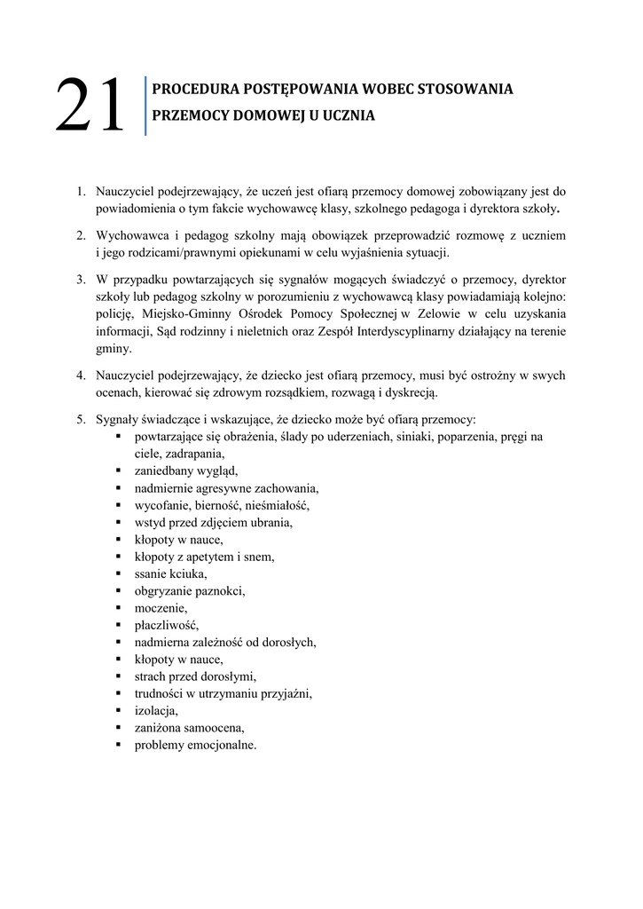21 PROCEDURA POSTĘPOWANIA WOBEC STOSOWANIA PRZEMOCY DOMOWEJ U UCZNIA 1. Nauczyciel podejrzewający, że uczeń jest ofiarą przemocy domowej zobowiązany jest do powiadomienia o tym fakcie wychowawcę klasy, szkolnego pedagoga i dyrektora szkoły. 2. Wychowawca i pedagog szkolny mają obowiązek przeprowadzić rozmowę z uczniem i jego rodzicami/prawnymi opiekunami w celu wyjaśnienia sytuacji. 3. W przypadku powtarzających się sygnałów mogących świadczyć o przemocy, dyrektor szkoły lub pedagog szkolny w porozumieniu z wychowawcą klasy powiadamiają kolejno: policję, Miejsko-Gminny Ośrodek Pomocy Społecznej w Zelowie w celu uzyskania informacji, Sąd rodzinny i nieletnich oraz Zespół Interdyscyplinarny działający na terenie gminy. 4. Nauczyciel podejrzewający, że dziecko jest ofiarą przemocy, musi być ostrożny w swych ocenach, kierować się zdrowym rozsądkiem, rozwagą i dyskrecją. 5. Sygnały świadczące i wskazujące, że dziecko może być ofiarą przemocy: powtarzające się obrażenia, ślady po uderzeniach, siniaki, poparzenia, pręgi na ciele, zadrapania, zaniedbany wygląd, nadmiernie agresywne zachowania, wycofanie, bierność, nieśmiałość, wstyd przed zdjęciem ubrania, kłopoty w nauce, kłopoty z apetytem i snem, ssanie kciuka, obgryzanie paznokci, moczenie, płaczliwość, nadmierna zależność od dorosłych, kłopoty w nauce, strach przed dorosłymi, trudności w utrzymaniu przyjaźni, izolacja, zaniżona samoocena, problemy emocjonalne.