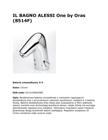 IL BAGNO ALESSI One by Oras (8514F) Bateria umywalkowa, 6 V Kolor: Chrom EAN code: 6414150064586 Opis: Bezdotykowa bateria umywalkowa z uchwytem regulującym temperaturę oraz z przyciskowym zaworem spustowym, zasilana 6 V baterią litową. Bateria bezdotykowa Oras Alessi jest wyposażona w filtry siatkowe, zawory zwrotne oraz technologię Autofocus sensor, dzięki której nie wymaga jakichkolwiek regulacji przy instalacji. Sterowany impulsami zawór trzpienia gwarantuje długą żywotność baterii zasilającej. Regulator przepływu (6 l/min) umożliwia małe zużycie wody. Dane techniczne Klasa głośności Woda ciepła zasilająca Max czas przepływu Inteligentne opóźnienie zamknięcia Klasa bezpieczeństwa Zasięg działania Bateria EMC Directive Ciśnienie robocze Spadek ciśnienia dla przepływu (0.1 l/s) Natężenie przepływu przy 300 kPa (Z regulatorem przepływu) Wymiary I (ISO 3822) max. 70°C 2 min 2s ± 1s IP 67 optimally preset Lithium 2CR5 2004/108/EY 100 - 1000 kPa 200 kPa 0.1 l/s
