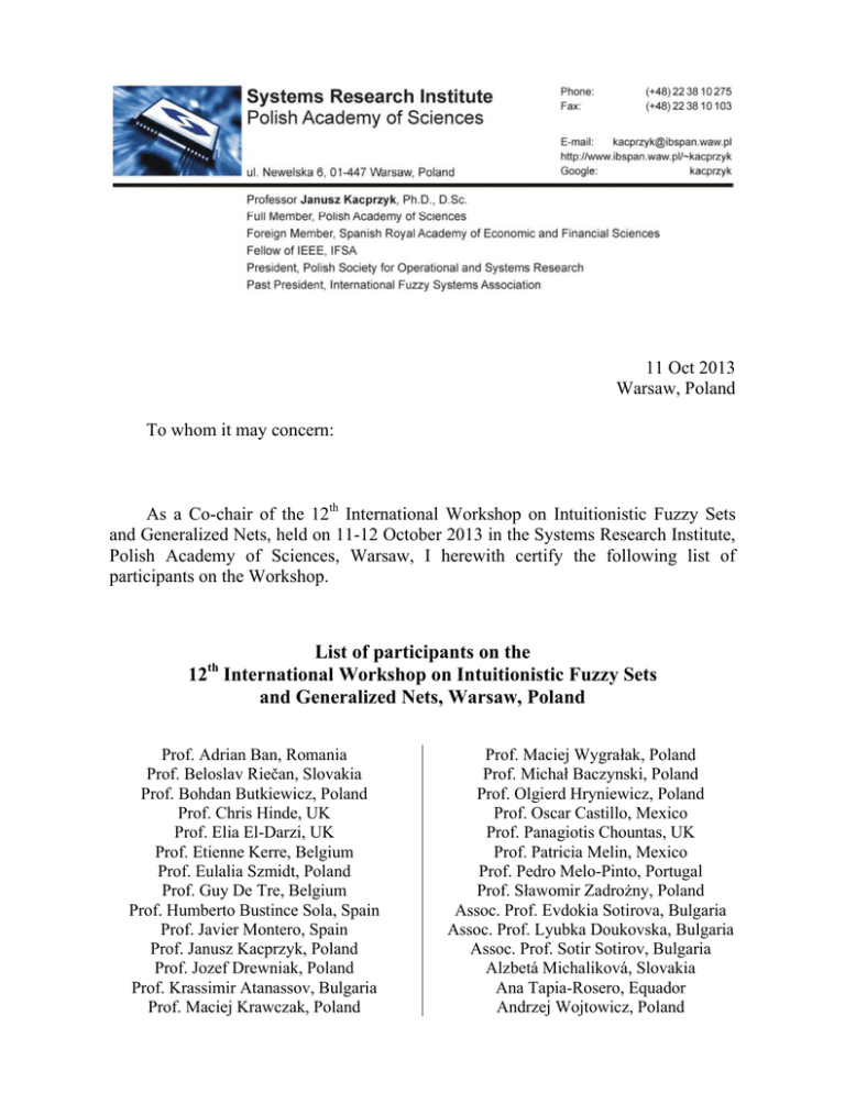 11 Oct 2013 Warsaw, Poland To whom it may concern: As a Co-chair of the 12th International Workshop on Intuitionistic Fuzzy Sets and Generalized Nets, held on 11-12 October 2013 in the Systems Research Institute, Polish Academy of Sciences, Warsaw, I herewith certify the following list of participants on the Workshop. List of participants on the 12 International Workshop on Intuitionistic Fuzzy Sets and Generalized Nets, Warsaw, Poland th Prof. Adrian Ban, Romania Prof. Beloslav Riečan, Slovakia Prof. Bohdan Butkiewicz, Poland Prof. Chris Hinde, UK Prof. Elia El-Darzi, UK Prof. Etienne Kerre, Belgium Prof. Eulalia Szmidt, Poland Prof. Guy De Tre, Belgium Prof. Humberto Bustince Sola, Spain Prof. Javier Montero, Spain Prof. Janusz Kacprzyk, Poland Prof. Jozef Drewniak, Poland Prof. Krassimir Atanassov, Bulgaria Prof. Maciej Krawczak, Poland Prof. Maciej Wygrałak, Poland Prof. Michał Baczynski, Poland Prof. Olgierd Hryniewicz, Poland Prof. Oscar Castillo, Mexico Prof. Panagiotis Chountas, UK Prof. Patricia Melin, Mexico Prof. Pedro Melo-Pinto, Portugal Prof. Sławomir Zadrożny, Poland Assoc. Prof. Evdokia Sotirova, Bulgaria Assoc. Prof. Lyubka Doukovska, Bulgaria Assoc. Prof. Sotir Sotirov, Bulgaria Alzbetá Michaliková, Slovakia Ana Tapia-Rosero, Equador Andrzej Wojtowicz, Poland Anna Stachowiak, Poland Evgeniy Marinov, Bulgaria George Shahpazov, Bulgaria Jakub Wajda, Poland Katarzyna Kaczmarek, Poland Lech Krus, Poland Magdalená Rencová, Slovakia Marcelo Loor, Equador Mohammedsharaf Alzebdi, UK Paweł Drygas, Poland Paweł Ładyẓynsky, Poland Peter Vasilev, Bulgaria Simeon Ribagin, Bulgaria Vassia Atanassova, Bulgaria Velin Andonov, Bulgaria Urszuła Bentkowska, Poland Sincerely yours, Academician Janusz Kacprzyk, Prof., Ph.D., D.Sc. Fellow of IEEE, IFSA Co-chair of 12th IWIFSGN