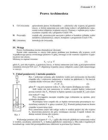 Ćwiczenie T - 5 Prawo Archimedesa I. Cel ćwiczenia: II. Przyrządy: III. Literatura: sprawdzenie prawa Archimedesa − zależności siły wyporu od gęstości cieczy, w której zanurzone jest ciało (tutaj walec) i od głębokości zanurzenia walca (objętości wypartej cieczy). Pomiary z wpisem przy wykorzystaniu czujnika siły i programu Coach 5 PL czujnik siły, przezroczyste naczynie z pleksi w kształcie cylindra, walec metalowy (aluminiowy), statyw, komputer z programem Coach 5 PL. instrukcja do ćwiczenia. IV. Wstęp Prawo Archimedesa można sformułować słowami: Każde ciało zanurzone w cieczy (lub gazie) poddane jest działaniu siły wyporu, czyli wypadkowego parcia zwróconego pionowo w górę, równego co do wartości ciężarowi wypartej przez nie cieczy. Możemy to zapisać wzorem: Fw = ρ ⋅ g ⋅ V (1) gdzie Fw jest siłą wyporu, ρ gęstością cieczy, w której zanurzone jest ciało, g przyspieszeniem ziemskim równym 9,81 m/s2, V objętością wypartej cieczy (objętość części ciała zanurzonego w cieczy). V. Układ pomiarowy i metoda pomiaru Rys. 1 pokazuje sytuację, gdy metalowy walec jest zawieszony na haczyku czujnika siły i częściowo zanurzony w wodzie na głębokość x. Na haczyk czujnika działa wówczas siła F równa: F F = P − Fw (2) gdzie P = mg jest ciężarem walca, Fw siłą wyporu działającą na walec. Jeśli walec nie jest zanurzony w wodzie, czujnik będzie wskazywał pewną wartość siły Fo. Wartość ta będzie ujemna a jej moduł Fo jest ciężarem walca P = mg. Przy rozciąganiu zaczepu czujnika jego wskazania są ujemne, przy • ściskaniu dodatnie. P Wyzerujmy teraz czujnik siły co będzie równoważne przesunięciu wyświetlanej wartości F w górę o wartość Fo . Wartość pokazywana na ikonie Fw • x czujnika wynosi teraz zero. Przy zanurzeniu części lub całego walca w wodzie pojawi się siła wyporu Fw skierowana pionowo do góry (ściskająca zaczep). Czujnik wskaże dodatnią wartość równą sile wyporu: Rys. 1 F = Fw (3) Wykonując pomiary siły wyporu F = Fw = ρgSx dla różnych głębokości zanurzenia walca w wodzie, uzyskamy zależność Fw w funkcji głębokości zanurzenia x. Dla ciała o regularnych kształtach np. walca lub prostopadłościanu zależność ta powinna być liniowa. T – 5 Prawo Archimedesa VI. Wykonanie pomiarów. 1. Uruchom program Coach 5 PL. 2. Wybierz z biblioteki czujnik siły z dwoma zakresami (0362bt) (CMA) (-5…5N): kliknij prawym przyciskiem myszy pusty kwadrat palety z czujnikami z lewej strony w dolnej części ekranu. Kliknij opcję menu Dodaj z biblioteki i z okienka wybierz odpowiedni czujnik. 3. Przeciągnij ikonę czujnika na odpowiednie gniazdo konsoli np. do oznaczonego nr 1. 4. W pasku narzędzi (góra) kliknij ikonę Nastawienie pomiaru. Można także wybrać ją z linijki menu Narzędzia. W otworzonym oknie ustaw częstotliwość na ręcznie. Kliknij OK. 5. Kliknij ikonę czujnika prawym przyciskiem myszy, z menu wybierz Prezentuj tabelę i umieść ją np. w lewej górnej części ekranu, klikając lewym przyciskiem myszy w tej części ekranu. 6. Kliknij myszą (lewym przyciskiem ikonę młotka w części ekranu z tabelą. Z otwartego menu wybierz Tworzenie /Edycja tabeli. 7. W otworzonym oknie Tworzenie /Edycja tabeli wybierz: Zbiór danych: C1 (przeważnie kursor podświetla to pole) Źródło danych: Wpis Wielkość: np. x (jeśli wpis jest długością) Jednostka: m (metr) Zatwierdź klikając OK. 8. Kliknij ikonę młotka (w oknie tabeli). Wybierz z menu Prezentuj na wykresie i umieść wykres w drugim oknie (klikając w tym oknie lewym przyciskiem myszy). 9. Kliknij ikonę młotka w oknie wykresu. Z menu wybierz Tworzenie/Edycja wykresu. Ustaw odpowiednie parametry dla zbiorów danych C1, C2 . Mogą to być: C1 Min. 0, Max. 0,25 C2 Oś: pierwsza pionowa Kolor: wg uznania Znacznik: np. duża kropka Linia: brak Zatwierdź klikając OK. 10. Wyzeruj czujnik siły. 11. Zaczep walec na haczyku czujnika siły tak, by znalazł się w całości w naczyniu z pleksi i odczytaj wskazanie czujnika siły wyświetlane na ikonie czujnika i zapisz moduł tej wartości Fo . 12. Ponownie wyzeruj czujnik siły i sprawdź czy wyświetlana wartość na ikonie czujnika wynosi zero. 13. Kliknij lewym przyciskiem myszy zielony przycisk w pasku narzędziowym (u góry). Pojawi się nowy zielony przycisk z cyfrą 1 w środku, a z jego prawej strony czerwony przycisk. Kliknij lewym przyciskiem myszy zielony kwadrat (następuje pomiar wielkości, tutaj siły, przez czujnik). Pojawi się okienko wpisu. Wpisz odpowiednią wielkość, tutaj x i kliknij OK. Na wykresie powinien być widoczny pierwszy punkt. Uwaga: Pomiar wielkości mierzonej czujnikiem dokonywany jest w momencie naciśnięcia zielonego klawisza z cyferką „1”, a nie w chwili akceptacji wpisu przez OK. 14. Nalej wody destylowanej do naczynia z pleksi tak, by walec zanurzył się na pewną głębokość np. na 2 cm i przeprowadź pomiar wg punktu 13. 15. Dolewając wody zmieniaj głębokość zanurzenia walca i przeprowadź pomiary zgodnie z punktem 13. 2 T – 5 Prawo Archimedesa 16. Po zakończeniu wszystkich pomiarów kliknij lewym przyciskiem myszy czerwony kwadrat w pasku narzędziowym. 17. Po wykonaniu poleceń z punktów VII.1 i VII.2 (Opracowanie wyników – patrz niżej) wykonaj pomiary dla cieczy o innej gęstości. 18. Zmierz suwmiarką średnicę walca d. VII. Opracowanie wyników 1. Zapisz wyniki w programie Coach 5 w katalogu (projekcie) Pomiary w fizyce. Pozwoli to powracać wielokrotnie do tych danych w celu wykonania ich analizy. W tym celu: • najedź kursorem myszy na ikonę zapisu wyników (lewa strona górnej części ekranu) i kliknij ją lewym przyciskiem myszy. Otworzy się okno Zapisz wyniki jako. • w polu opis umieść swoją nazwę pliku danych, Zapisz również tabelę z danymi i wykres z ekranu w pliku Excel’a (po kliknięciu prawym przyciskiem myszki w polu wykresu wybierz Kopiuj do 