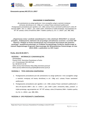 Oznaczenie sprawy WZ.272.3.1.2017 OGŁOSZENIE O ZAMÓWIENIU dla zamówienia na usługi społeczne i inne szczególne usługi o wartości mniejszej od kwoty określonej w art. 138g ust.1 ustawy Prawo zamówień publicznych Postępowanie prowadzone jest zgodnie z art. 138o ustawy Prawo zamówień publicznych z dnia 29 stycznia 2004 r. (Dz. U. z 2015 r., poz. 2164 z późn. zmianami) w trybie przetargu, wg przepisów art. 701-705 ustawy z dnia 23 kwietnia 1964 r. Kodeks cywilny (t.j. Dz. U. z 2016 r. poz. 380, 585). „Organizacja staży i praktyk zawodowych w roku szkolnym 2016/2017 w ramach projektu „Podniesienie zdolności do przyszłego zatrudnienia uczennic i uczniów ZSP Kłanino i PCKZiU w Pucku kształcących się w branżach kluczowych dla powiatu puckiego” współfinansowanego ze środków Europejskiego Funduszu Społecznego w ramach Regionalnego Programu Operacyjnego dla Województwa Pomorskiego na lata 2014-2020, z podziałem na XXV Części Pucka, dnia 02.02.2017 r. ROZDZIAŁ I INFORMACJE O ZAMAWIAJĄCYM. Zamawiający: Powiat Pucki- Starostwo Powiatowe w Pucku ul. E. Orzeszkowej 5 84-100 Puck fax +48 58 673 41 94 Adres strony internetowej: http://bip.starostwo.puck.pl/ Adres poczty elektronicznej [email protected] ROZDZIAŁ II TRYB UDZIELENIA ZAMÓWIENIA 1. Postępowanie prowadzone jest dla zamówienia na usługi społeczne i inne szczególne usługi o wartości mniejszej od kwoty określonej w art. 138g ust.1 ustawy Prawo zamówień publicznych. 2. Postępowanie prowadzone jest zgodnie z art. 138o ustawy Prawo zamówień publicznych z dnia 29 stycznia 2004 r. (Dz. U. z 2015 r., poz. 2164 z późn. zmianami), dalej „ustawa”, w trybie przetargu, wg przepisów art. 701-705 ustawy z dnia 23 kwietnia 1964 r. Kodeks cywilny (t.j. Dz. U. z 2016 r. poz. 380, 585).. ROZDZIAŁ III OPIS PRZEDMIOTU ZAMÓWIENIA. 1|Strona 1. Przedmiotem zamówienia jest: „Organizacja staży i praktyk zawodowych w roku szkolnym 2016/2017 dla 53 uczniów Powiatowego Centrum Kształcenia Zawodowego i Ustawicznego w Pucku, kształcących się w zawodach z branży: transport, logistyka i motoryzacja, oraz dla 55 uczniów Zespołu Szkół Ponadgimnazjalnych w Kłaninie, kształcących się w zawodach z branży: turystyka, sport i rekreacja”, w ramach projektu „Podniesienie zdolności do przyszłego zatrudnienia uczennic i uczniów ZSP Kłanino i PCKZiU w Pucku kształcących się w branżach kluczowych dla powiatu puckiego” współfinansowanego ze środków Europejskiego Funduszu Społecznego w ramach Regionalnego Programu Operacyjnego dla Województwa Pomorskiego na lata 2014-2020 z podziałem na XXV. 2. Określenie przedmiotu zamówienia za pomocą Kodów Cpv wg Wspólnego Słownika Zamówień: Główny przedmiot 80000000-4 Usługi edukacyjne i szkoleniowe 80210000-9 Usługi edukacji technicznej i zawodowej na poziomie szkoły średniej 5. Zamawiający żąda wskazania w ofercie części zamówienia, których wykonanie Wykonawca zamierza powierzyć podwykonawcy i podania nazw (firm) podwykonawców. 6. Zamawiający nie zastrzega obowiązku osobistego wykonania zamówienia przez Wykonawcę. 1) Wykonawcy, z którymi zostaną zawarte umowy na realizację zamówienia w każdej Części odrębnie zobowiązani będą do przestrzegania postanowień umowy o dofinansowanie projektu „Podniesienie zdolności do przyszłego zatrudnienia uczennic i uczniów ZSP Kłanino i PCKZiU w Pucku kształcących się w branżach kluczowych dla powiatu puckiego” współfinansowanego ze środków Europejskiego Funduszu Społecznego w ramach Regionalnego Programu Operacyjnego dla Województwa Pomorskiego na lata 2014-2020., zapisów Ogłoszenia o zamówieniu, nin. Zapytania oraz złożonej oferty. ROZDZIAŁ IV OFERTY WARIANTOWE i OFERTY CZĘŚCIOWE. 1. Zamawiający nie dopuszcza składania ofert wariantowych. 2. Zamawiający przewiduje składanie ofert częściowych – XXV Części 3. Szczegółowy opis przedmiotu zamówienia: 1) Przedmiotem zamówienia jest organizacja staży i praktyk zawodowych w roku szkolnym 2016/2017 dla 53 uczniów Powiatowego Centrum Kształcenia Zawodowego i Ustawicznego w Pucku, kształcących się w zawodach z branży: transport, logistyka i motoryzacja, tj. w zawodach: technik mechanik, technik logistyk i ślusarz, oraz dla 55 uczniów Zespołu Szkół Ponadgimnazjalnych w Kłaninie, kształcących się w zawodach z branży: turystyka, sport i rekreacja, tj. w zawodach: technik hotelarstwa, technik żywienia i usług gastronomicznych, technik technologii żywności, kucharz, piekarz, cukiernik. 2) Praktyki zawodowe i staże zawodowe organizowane są jako dodatkowy moduł kształcenia zawodowego praktycznego w ramach projektu pn.: „Podniesienie zdolności do przyszłego zatrudnienia uczennic i uczniów ZSP Kłanino i PCKZiU w Pucku kształcących się w branżach kluczowych dla powiatu puckiego” współfinansowanego ze środków Europejskiego Funduszu Społecznego w ramach Regionalnego Programu Operacyjnego dla Województwa Pomorskiego na lata 2014-2020. 2|Strona 3) Praktyki i staże, o których mowa w pkt. 1 wykraczają poza liczbę godzin praktyki zawodowej przewidzianej w podstawie programowej kształcenia w danym zawodzie. 4) Praktyki zawodowe organizowane są dla uczniów zasadniczych szkół zawodowych w celu zastosowania i pogłębienia zdobytej wiedzy i umiejętności zawodowych w rzeczywistych warunkach pracy i nie są formą praktycznej nauki zawodu, o której mowa w rozporządzeniu Ministra Edukacji Narodowej z dnia 15 grudnia 2010 r. w sprawie praktycznej nauki zawodu. 5) Staże zawodowe organizowane są dla uczniów techników w ramach kształcenia zawodowego praktycznego, które nie jest realizowane u pracodawców/przedsiębiorców ze względu na brak możliwości sfinansowania kosztów takiego kształcenia; w celu zwiększenia wymiaru praktyk zawodowych objętych podstawą programową nauczania danego zawodu jako wykraczające poza zakres kształcenia zawodowego praktyczn