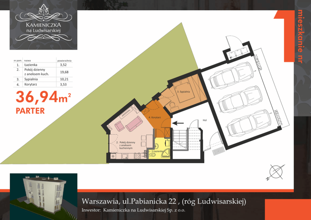 1. 2. 3. 4. Łazienka Pokój dzienny z aneksem kuch. Sypialnia Korytarz powierzchnia 3,52 19,68 10,21 3,53 1 mieszkanie nr ∞ nr pom. nazwa 3. Sypialnia 36,94m 2 PARTER 4. Korytarz Hol 2. Pokój dzienny z aneksem kuchennym 1.Łazienka N Warszawia, ul.Pabianicka 22 , (róg Ludwisarskiej) Inwestor: Kamieniczka na Ludwisarskiej Sp. z o.o.