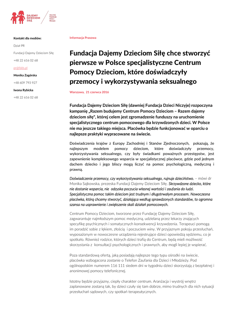 Kontakt dla mediów: Informacja Prasowa Dział PR Fundacji Dajemy Dzieciom Siłę +48 22 616 02 68 [email protected] Monika Zagórska +48 609 793 927 Iwona Rybicka Fundacja Dajemy Dzieciom Siłę chce stworzyć pierwsze w Polsce specjalistyczne Centrum Pomocy Dzieciom, które doświadczyły przemocy i wykorzystywania seksualnego Warszawa, 21 czerwca 2016 +48 22 616 02 68 Fundacja Dajemy Dzieciom Siłę (dawniej Fundacja Dzieci Niczyje) rozpoczyna kampanię „Razem budujemy Centrum Pomocy Dzieciom – Razem dajemy dzieciom siłę”, której celem jest zgromadzenie funduszy na uruchomienie specjalistycznego centrum pomocowego dla krzywdzonych dzieci. W Polsce nie ma jeszcze takiego miejsca. Placówka będzie funkcjonować w oparciu o najlepsze praktyki wypracowane na świecie. Doświadczenia krajów z Europy Zachodniej i Stanów Zjednoczonych, pokazują, że najlepszym modelem pomocy dzieciom, które doświadczyły przemocy, wykorzystywania seksualnego, czy były świadkami poważnych przestępstw, jest zapewnienie kompleksowego wsparcia w specjalistycznej placówce, gdzie pod jednym dachem dziecko i jego bliscy mogą liczyć na pomoc psychologiczną, medyczną i prawną. Doświadczenie przemocy, czy wykorzystywania seksualnego, rujnuje dzieciństwo. – mówi dr Monika Sajkowska, prezeska Fundacji Dajemy Dzieciom Siłę. Skrzywdzone dziecko, które nie dostanie wsparcia, nie odzyska poczucia własnej wartości i zaufania do ludzi. Specjalistyczna pomoc takim dzieciom jest trudnym i długotrwałym procesem. Nowoczesna placówka, którą chcemy stworzyć, działająca według sprawdzonych standardów, to ogromna szansa na usprawnienie i zwiększenie skali działań pomocowych. Centrum Pomocy Dzieciom, tworzone przez Fundację Dajemy Dzieciom Siłę, zagwarantuje najmłodszym pomoc medyczną, udzielaną przez lekarzy znających specyfikę psychicznych i somatycznych konsekwencji krzywdzenia. Terapeuci pomogą im poradzić sobie z lękiem, złością i poczuciem winy. W przyjaznym pokoju przesłuchań, wyposażonym w nowoczesne urządzenia rejestrujące dzieci opowiedzą sędziemu, co je spotkało. Również rodzice, których dzieci trafią do Centrum, będą mieli możliwość skorzystania z konsultacji psychologicznych i prawnych, aby mogli lepiej je wspierać. Poza standardową ofertą, jaką posiadają najlepsze tego typu ośrodki na świecie, placówka wzbogacona zostanie o Telefon Zaufania dla Dzieci i Młodzieży. Pod ogólnopolskim numerem 116 111 siedem dni w tygodniu dzieci skorzystają z bezpłatnej i anonimowej pomocy telefonicznej. Istotny będzie przyjazny, ciepły charakter centrum. Aranżacja i wystrój wnętrz zaplanowane zostaną tak, by dzieci czuły się tam dobrze, mimo trudnych dla nich sytuacji przesłuchań sądowych, czy spotkań terapeutycznych. Nie ma dziś takich miejsc w Polsce. Fundacja Dajemy Dzieciom Siłę chce to zmienić. Chcemy, by model pomocy dzieciom realizowany przez centrum, był inspiracją dla zmiany systemu wspierania dzieci, które doświadczyły przemocy i wykorzystywania seksualnego. Dążeniem fundacji jest, by w przyszłości w całym kraju powstały podobne placówki. – wyjaśnia Monika Sajkowska. Fundacja Dajemy Dzieciom Siłę posiada wieloletnie doświadczenie w pomocy krzywdzonym dzieciom – w tym wynikające ze współpracy z podobnymi centrami pomocy dzieciom krzywdzonym, które działają na świecie. Uruchomienie specjalistycznego centrum wymaga zgromadzenia funduszy na budynek, jego wyposażenie i profesjonalną ofertę pomocy. Placówka zostanie stworzona dzięki tzw. „cegiełkom”, czyli wsparciu indywidualnych darczyńców i firm, do których Fundacja zwraca się o pomoc. Ważne jest dla nas zapewnienie placówce stabilności i uniezależnienie jej od dotacji państwowych, których nie można zagwarantować. Terapie, jakie prowadzimy dla naszych podopiecznych, trwają nawet do 2 lat i nie możemy ryzykować konieczności ich przerwania z powodu braku decyzji o przyznaniu środków, lub innych przyczyn niezależnych od nas. – dodaje Monika Sajkowska. Partnerem strategicznym przedsięwzięcia jest Grupa Onet – RAS Polska, która zapewnia wsparcie merytoryczne i medialne przy prowadzonej kampanii. Misją mediów jest informowanie o wydarzeniach i jako Grupa, skupiająca największe tytuły prasowe i portale internetowe, robimy to każdego dnia. Niestety, często są to treści, które donoszą o przemocy, krzywdzie, zbrodni. Przemilczanie takich zdarzeń nie zmieni rzeczywistości, ale współpracując z Fundacją Dajemy Dzieciom Siłę, możemy mieć realny wpływ na zapobieganie przestępstwom i pomaganie ich ofiarom - w tym przypadku dzieciom, które doświadczyły przemocy. – mówi Anna Marucha, odpowiedzialna za CSR w Grupie Onet RAS Polska. Dlatego aktywnie włączyliśmy się w kampanię „Razem budujemy Centrum Pomocy Dzieciom – Razem dajemy dzieciom siłę”, dzieląc się tym, co mamy – naszymi łamami, wiedzą, zawodowymi kompetencjami w wielu obszarach – od dziennikarstwa po biznes. Jesteśmy przekonani, że wspólnie uda nam się nagłośnić ideę budowy Centrum Pomocy Dzieciom, które będzie pomagać skrzywdzonym dzieciom odzyskać dzieciństwo, bo tak właśnie rozumiemy społeczną odpowiedzialność mediów. Kampania „Razem budujemy Centrum Pomocy Dzieciom” inauguruje działania fundacji, które mają być realizowane pod zbiorczych hasłem „Razem dajemy dzieciom siłę!”. Hasło „Razem dajemy dzieciom siłę!” to zaproszenie do współpracy wszystkich, którzy chcą dać skrzywdzonym dzieciom szansę na lepsze dzieciństwo. Więcej informacji o kampanii „Razem budujemy Centrum Pomocy Dzieciom – Razem dajemy dzieciom siłę” można znaleźć na stronie: fdds.pl/razem. O Fundacji Dajemy Dzieciom Siłę: Fundacja Dajemy Dzieciom Siłę (dawniej Fundacja Dzieci Niczyje) dąży do tego, by wszystkie dzieci miały bezpieczne dzieciństwo i były traktowane z poszanowaniem ich godno