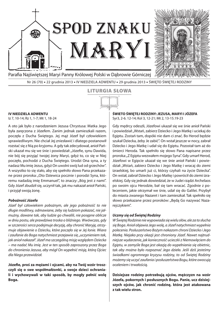 SPOD ZNAKU MARYI Parafia Najświętszej Maryi Panny Królowej Polski w Dąbrowie Górniczej Nr 26 (70) • 22 grudnia 2013 • IV NIEDZIELA ADWENTU • 29 grudnia 2013 • ŚWIĘTO ŚWIĘTEJ RODZINY LITURGIA SŁOWA IV NIEDZIELA ADWENTU Iz 7, 10-14; Rz 1, 1-7; Mt 1, 18-24 | A oto jak było z narodzeniem Jezusa Chrystusa: Matka Jego była zaręczona z Józefem. Zanim jednak zamieszkali razem, poczęła z Ducha Świętego. Jej mąż Józef był człowiekiem sprawiedliwym. Nie chciał Jej zniesławić i dlatego postanowił rozstać się z Nią po kryjomu. A gdy tak zdecydował, anioł Pański ukazał mu się we śnie i powiedział: „Józefie, synu Dawida, nie bój się przyjąć twojej żony Maryi, gdyż to, co się w Niej poczęło, pochodzi z Ducha Świętego. Urodzi Ona syna, a ty nadasz Mu imię Jezus, gdyż On uwolni swój lud od grzechów”. A wszystko to się stało, aby się spełniło słowo Pana przekazane przez proroka: „Oto Dziewica pocznie i porodzi Syna, któremu nadadzą imię Emmanuel”, to znaczy: „Bóg jest z nami”. Gdy Józef zbudził się, uczynił tak, jak mu nakazał anioł Pański, i przyjął swoją żonę. Pobożność Józefa Józef był człowiekiem pobożnym, ale jego pobożność to nie długie modlitwy, odmawiane, żeby się ludziom pokazać, nie jałmużny, dawane tak, aby ludzie go chwalili, nie posępne oblicze w dniu postu, ale prawdziwa troska o bliźniego. Wwówczas, gdy w szczerości serca podejmuje decyzję, aby chronić Maryję, otrzymuje objawienie o Dziecku, które poczęło się w Jej łonie. Wiara i zaufanie do Boga natychmiast przejawia się „uczynieniem tak, jak anioł nakazał”. Józef ma szczególną misję względem Dziecka – ma nadać Mu imię. Jest w ten sposób zaproszony przez Boga do chronienia Jezusa, aby mógł On wypełnić misję, którą Ojciec dla Niego przewidział. Józefie, proś za mężami i ojcami, aby na Twój wzór troszczyli się o swe współmałżonki, a swoje dzieci ochraniali i wychowywali w taki sposób, by mogły pełnić wolę Boga. ŚWIETO ŚWIĘTEJ RODZINY: JEZUSA, MARYI I JÓZEFA Syr3, 2-6. 12-14; Kol 3, 12-21; Mt 2, 13-15.19-23 Gdy mędrcy odeszli, Józefowi ukazał się we śnie anioł Pański i powiedział: „Wstań, zabierz Dziecko i Jego Matkę i uciekaj do Egiptu. Zostań tam, dopóki nie dam ci znać. Bo Herod będzie szukał Dziecka, żeby Je zabić”. On wstał jeszcze w nocy, zabrał Dziecko i Jego Matkę i udał się do Egiptu. Pozostał tam aż do śmierci Heroda. Tak spełniło się słowo Pana napisane przez proroka: „Z Egiptu wezwałem mojego Syna”. Gdy umarł Herod, Józefowi w Egipcie ukazał się we śnie anioł Pański i powiedział: „Wstań, zabierz Dziecko i Jego Matkę i wracaj do ziemi izraelskiej, bo umarli już ci, którzy czyhali na życie Dziecka”. On wstał, zabrał Dziecko i Jego Matkę i powrócił do ziemi izraelskiej. Gdy się jednak dowiedział, że w Judei rządzi Archelaos po swoim ojcu Herodzie, bał się tam wracać. Zgodnie z poleceniem, jakie otrzymał we śnie, udał się do Galilei. Przybył do miasta zwanego Nazaret i tam zamieszkał. Tak spełniło się słowo przekazane przez proroków: „Będą Go nazywać Nazarejczykiem”. Uczmy się od Świętej Rodziny W Świętej Rodzinie nie wypowiada się wielu słów, ale za to słucha się Boga. Anioł objawia Jego wolę, a Józef natychmiast wypełnia polecenia. Posłuszeństwo Bożym nakazom chroni Dziecko i Jego Matkę. Niejako przy okazji jest chroniony Józef. Nawet najtrudniejsze wydarzenie, jak konieczność ucieczki z Niemowlęciem do Egiptu, w zamyśle Boga jest okazją do wypełniania się obietnic, tak aby można było rozpoznać Jego dzieła. Jeśli dziś jesteśmy świadkami ogromnego kryzysu rodziny, to od Świętej Rodziny możemy się uczyć zaufania i posłuszeństwa Bogu, które owocują ocaleniem i trwałością. Dzisiejsze rodziny potrzebują ojców, mężczyzn na wzór Józefa, pokornych i posłusznych Bogu. Panie, ucz dzisiejszych ojców, jak chronić rodzinę, która jest atakowana z tak wielu stron. OSIEM BŁOGOSŁAWIEŃSTW Wizyta Duszpasterska 2014 4) Błogosławieni którzy łakną i pragną sprawiedliwości, albowiem oni będą nasyceni. Sprawiedliwość w Piśmie Świętym nie oznacza karania za grzechy albo nagradzania dobrych czynów, ale realizację woli Boga. Sprawiedliwym jest ten, kto jest posłuszny Bogu. Sprawiedliwe jest to, co się dzieje zgodnie z wolą Boga. Pragnienie Boga ukazują nam przykazania oraz Jego obietnice. Człowiek pragnący sprawiedliwości stara się realizować przykazania Boga, oraz czeka na realizację Jego obietnic. Zna on swoją słabość, fakt, że nie jest w stanie w pełni zrealizować przykazań Bożych, ale się tym nie smuci i nie popada z tego powodu w rozpacz, gdyż całą swoją nadzieję pokłada w obietnicach Bożych, których realizacja nie jest uzależniona od dobroci człowieka, ale od wierności Boga. Największą obietnicą Boga jest Jego Królestwo. Realizacja tej obietnicy jest największą sprawiedliwością, którą ludzie „łaknący sprawiedliwości” pragną ponad wszystko. Jezus był człowiekiem sprawiedliwym, ponieważ pragnął przede wszystkim realizacji Królestwa Bożego. To była Jego największa troska, Jego największe pragnienie. Przeciwieństwem do łaknących sprawiedliwości są faryzeusze. Liczyli oni jedynie na swoje siły. Nie łaknęli sprawiedliwości, gdyż byli przekonani, że sami doskonale ją realizują. Byli nasyceni przekonaniem o własnej sprawiedliwości, a Bóg był im jedynie potrzebny do jej uznania oraz wynagrodzenia, a raczej wypłacenia tego, co w ich przekonaniu słusznie im się należało. Po Bożym Narodzeniu rozpoczyna się wizyta duszpasterskich w naszych domach, czyli tak zwana kolęda. Wizyta duszpasterska to nie tylko błogosławieństwo, ale spotkanie kapłana z parafianami. Jeżeli jest to możliwe, niech w czasie kolędy wszyscy domownicy będą obecni. Przygotowanie do k