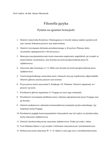 Prof. nadzw. dr hab. Janusz Maciaszek Filozofia języka Pytania na egzamin licencjacki 1. Omówić stanowiska Kratylosa i Hermogenesa w kwestii statusu znaków językowych oraz zarzuty Sokratesa przeciw tym stanowiskom. 2. Omówić rozwiązanie dylematu przedstawionego w Kratylosie Platona, które Arystoteles zaproponował w Hermeneutyce. 3. Ideacyjna (asocjacjonistyczna) teoria znaczenia empirystów angielskich, jej związki ze stanowiskiem Arystotelesa, oraz krytyka tej teorii przeprowadzona przez K. Ajdukiewicza 4. Znaczenie jako konotacja u J. S. Milla oraz krytyka tej teorii przeprowadzona przez Ajdukiewicza 5. Teoria bezpośredniego oznaczania nazw własnych oraz jej współczesne odpowiedniki. Omówić główne zarzuty przeciw tym teoriom 6. Przyczynowa teoria nazywania S. Kripkego i H. Putnama. Omówić argumenty za i przeciw tej teorii. 7. Przedstawić główne argumenty G. Fregego na rzecz jego semantyki . 8. Przedstawić rozwiązanie problemu mowy zaleŜnej zaproponowane przez Fregego oraz jej krytykę 9. Omówić podstawowe załoŜenia teoriomodelowej semantyki języka naturalnego i jej inspiracje teorią Fregego. 10. Przedstawić poglądy konwencjonalistów francuskich oraz ich wpływ na dyrektywalną teorię znaczenia Ajdukiewicza. 11. Omówić dyrektywalną teorię znaczenia Ajdukiewicza. Podać jej wady i zalety. 12. Teza Duhema-Quine’a i jej związki z holizmem znaczeniowym i przekonaniowym. 13. Holistyczna teoria znaczenia W. V. O. Quine’a oraz jego tezy o niezdeterminowaniu. 14. Weryfikacjonistyczna teoria znaczenia i jej krytyka w „Dwóch dogmatach” Quine’a. 15. Przedstawić B. Russella rozwiązanie problemu zdań, których podmiot odnosi się do obiektu „nieistniejącego” oraz problemu negatywnych zdań egzystencjalnych 16. Omówić problem zdań toŜsamościowych i zdań wyraŜających postawy propozycjonalne oraz B. Russella rozwiązanie tych problemów. 17. Omówić związek semantyki światów moŜliwych S. Kripkego z przyczynową teorią nazywania. 18. Omówić wykorzystanie zaproponowanej przez R. Stalnakera dwuwymiarowej semantyki światów moŜliwych w filozofii języka. 19. Omówić argumenty na rzecz stanowiska deskrycjonistycznego w kwestii nazw własnych oraz zarzuty wobec tego stanowiska 20. Omówić teorię prawdy Tarskiego oraz jej filozoficzne implikacje w kwestii prawdy i języka. 21. Przedstawić teorię znaczenia i interpretacji D. Davidsona. 22. Omówić teorię gier językowych u L. Wittgensteina. 23. Omówić teorię wyraŜeń performatywnych J. L.Austina. 24. Omówić teorię aktów mowy J. Searle’a. 25. Omówić maksymy konwersacyjne H. P. Grice’a i ich konsekwencje. 26. Na czym polega analiza parataktyczna Davidsona? Podać przykłady zastosowania. 27. Porównać teorię metafory J. Searle’a oraz teorię metafory D. Davidsona. 28. Omówić rozwiązanie problemu psychofizycznego zaproponowane przez D.Davidsona na gruncie filozofii języka.