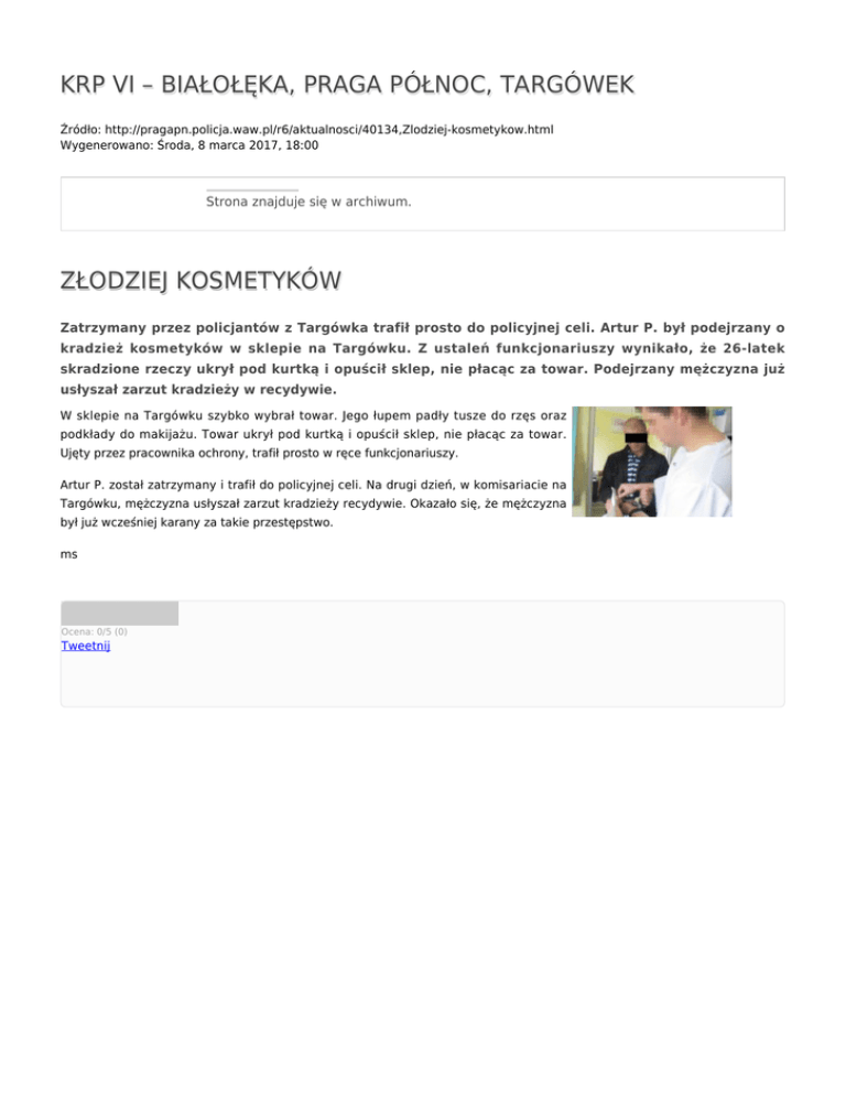 KRP VI – BIAŁOŁĘKA, PRAGA PÓŁNOC, TARGÓWEK Źródło: http://pragapn.policja.waw.pl/r6/aktualnosci/40134,Zlodziej-kosmetykow.html Wygenerowano: Środa, 8 marca 2017, 18:00 Strona znajduje się w archiwum. ZŁODZIEJ KOSMETYKÓW Zatrzymany przez policjantów z Targówka trafił prosto do policyjnej celi. Artur P. był podejrzany o kradzież kosmetyków w sklepie na Targówku. Z ustaleń funkcjonariuszy wynikało, że 26-latek skradzione rzeczy ukrył pod kurtką i opuścił sklep, nie płacąc za towar. Podejrzany mężczyzna już usłyszał zarzut kradzieży w recydywie. W sklepie na Targówku szybko wybrał towar. Jego łupem padły tusze do rzęs oraz podkłady do makijażu. Towar ukrył pod kurtką i opuścił sklep, nie płacąc za towar. Ujęty przez pracownika ochrony, trafił prosto w ręce funkcjonariuszy. Artur P. został zatrzymany i trafił do policyjnej celi. Na drugi dzień, w komisariacie na Targówku, mężczyzna usłyszał zarzut kradzieży recydywie. Okazało się, że mężczyzna był już wcześniej karany za takie przestępstwo. ms Ocena: 0/5 (0) Tweetnij