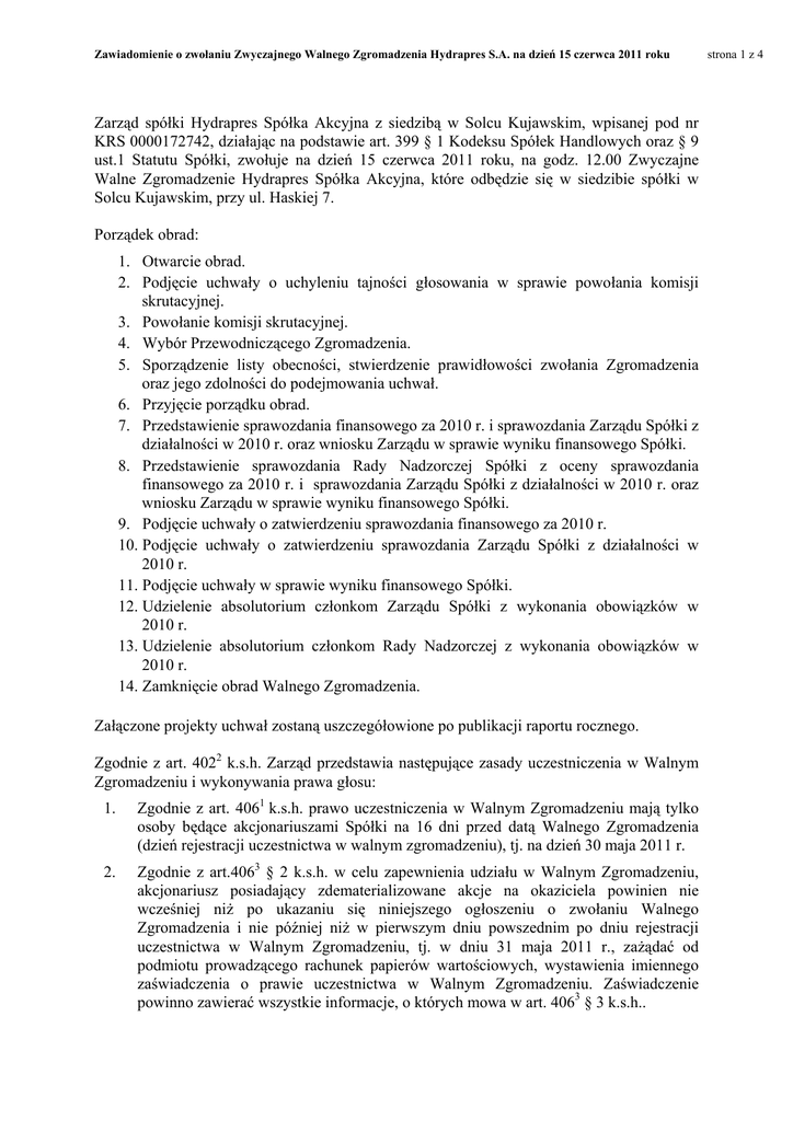 Zawiadomienie o zwołaniu Zwyczajnego Walnego Zgromadzenia Hydrapres S.A. na dzień 15 czerwca 2011 roku Zarząd spółki Hydrapres Spółka Akcyjna z siedzibą w Solcu Kujawskim, wpisanej pod nr KRS 0000172742, działając na podstawie art. 399 § 1 Kodeksu Spółek Handlowych oraz § 9 ust.1 Statutu Spółki, zwołuje na dzień 15 czerwca 2011 roku, na godz. 12.00 Zwyczajne Walne Zgromadzenie Hydrapres Spółka Akcyjna, które odbędzie się w siedzibie spółki w Solcu Kujawskim, przy ul. Haskiej 7. Porządek obrad: 1. Otwarcie obrad. 2. Podjęcie uchwały o uchyleniu tajności głosowania w sprawie powołania komisji skrutacyjnej. 3. Powołanie komisji skrutacyjnej. 4. Wybór Przewodniczącego Zgromadzenia. 5. Sporządzenie listy obecności, stwierdzenie prawidłowości zwołania Zgromadzenia oraz jego zdolności do podejmowania uchwał. 6. Przyjęcie porządku obrad. 7. Przedstawienie sprawozdania finansowego za 2010 r. i sprawozdania Zarządu Spółki z działalności w 2010 r. oraz wniosku Zarządu w sprawie wyniku finansowego Spółki. 8. Przedstawienie sprawozdania Rady Nadzorczej Spółki z oceny sprawozdania finansowego za 2010 r. i sprawozdania Zarządu Spółki z działalności w 2010 r. oraz wniosku Zarządu w sprawie wyniku finansowego Spółki. 9. Podjęcie uchwały o zatwierdzeniu sprawozdania finansowego za 2010 r. 10. Podjęcie uchwały o zatwierdzeniu sprawozdania Zarządu Spółki z działalności w 2010 r. 11. Podjęcie uchwały w sprawie wyniku finansowego Spółki. 12. Udzielenie absolutorium członkom Zarządu Spółki z wykonania obowiązków w 2010 r. 13. Udzielenie absolutorium członkom Rady Nadzorczej z wykonania obowiązków w 2010 r. 14. Zamknięcie obrad Walnego Zgromadzenia. Załączone projekty uchwał zostaną uszczegółowione po publikacji raportu rocznego. Zgodnie z art. 4022 k.s.h. Zarząd przedstawia następujące zasady uczestniczenia w Walnym Zgromadzeniu i wykonywania prawa głosu: 1. Zgodnie z art. 4061 k.s.h. prawo uczestniczenia w Walnym Zgromadzeniu mają tylko osoby będące akcjonariuszami Spółki na 16 dni przed datą Walnego Zgromadzenia (dzień rejestracji uczestnictwa w walnym zgromadzeniu), tj. na dzień 30 maja 2011 r. 2. Zgodnie z art.4063 § 2 k.s.h. w celu zapewnienia udziału w Walnym Zgromadzeniu, akcjonariusz posiadający zdematerializowane akcje na okaziciela powinien nie wcześniej niż po ukazaniu się niniejszego ogłoszeniu o zwołaniu Walnego Zgromadzenia i nie później niż w pierwszym dniu powszednim po dniu rejestracji uczestnictwa w Walnym Zgromadzeniu, tj. w dniu 31 maja 2011 r., zażądać od podmiotu prowadzącego rachunek papierów wartościowych, wystawienia imiennego zaświadczenia o prawie uczestnictwa w Walnym Zgromadzeniu. Zaświadczenie powinno zawierać wszystkie informacje, o których mowa w art. 4063 § 3 k.s.h.. strona 1 z 4 Zawiadomienie o zwołaniu Zwyczajnego Walnego Zgromadzenia Hydrapres S.A. na dzień 15 czerwca 2011 roku 3. Akcjonariusz lub akcjonariusze Spółki, reprezentujący co najmniej jedną dwudziestą kapitału zakładowego mogą żądać umieszczenia określonych spraw w porządku obrad najbliższego Walnego Zgromadzenia. Żądanie powinno zostać zgłoszone Zarządowi nie później niż na 21 dni przed wyznaczonym terminem Walnego Zgromadzenia, tj. do dnia 25 maja 2011 r. Żądanie powinno zawierać uzasadnienie lub projekt uchwały dotyczącej proponowanego punktu porządku obrad. Żądanie powinno zostać złożone na piśmie, może też być złożone w postaci elektronicznej, na adres e-mail: [email protected]. 4. Akcjonariusz lub akcjonariusze Spółki, reprezentujący co najmniej jedną dwudziestą kapitału zakładowego mogą przed terminem walnego zgromadzenia zgłaszać Spółce na piśmie lub przy wykorzystaniu środków komunikacji elektronicznej, na adres e-mail: [email protected] projekty uchwał dotyczące spraw wprowadzonych do porządku obrad walnego zgromadzenia lub spraw, które mają zostać wprowadzone do porządku obrad walnego zgromadzenia. Projekty uchwał powinny być sporządzone w języku polskim; w formacie Word lub PDF. 5. Każdy z akcjonariuszy uczestniczących w walnym zgromadzeniu może w podczas jego trwania zgłaszać projekty uchwał dotyczące spraw wprowadzonych do porządku obrad. Projekty uchwał powinny być przedstawione w języku polskim. 6. Akcjonariusz będący osobą fizyczną może uczestniczyć w walnym zgromadzeniu i wykonywać prawo głosu osobiście lub przez pełnomocnika. Akcjonariusz niebędący osobą fizyczną może uczestniczyć w walnym zgromadzeniu oraz wykonywać prawo głosu przez osobę uprawnioną do składania oświadczeń woli w jego imieniu lub przez pełnomocnika. Statut Spółki nie dopuszcza możliwości udziału w walnym zgromadzeniu przy wykorzystaniu środków komunikacji elektronicznej, a Regulamin Obrad Walnego Zgromadzenia nie przewiduje oddawania głosu na walnym zgromadzeniu drogą korespondencyjną. 7. Prawo do reprezentowania akcjonariusza niebędącego osobą fizyczną powinno wynikać z okazanego przy sporządzaniu listy obecności aktualnego odpisu z właściwego rejestru (składanego w oryginale lub w kopii potwierdzonej za zgodność z oryginałem przez notariusza). 8. Osoba/osoby udzielające pełnomocnictwa w imieniu akcjonariusza niebędącego osobą fizyczną powinny być uwidocznione w aktualnym odpisie z właściwego dla danego akcjonariusza rejestru (składanego w oryginale lub w kopii potwierdzonej za zgodność z oryginałem przez notariusza). 9. Pełnomocnictwa do uczestniczenia w walnym zgromadzeniu i wykonywania prawa głosu powinno być udzielone na piśmie lub w postaci elektronicznej. Udzielenie pełnomocnictwa w postaci elektronicznej nie wymaga opatrzenia bezpiecznym podpisem elektronicznym weryfikowanym przy pomocy ważnego kwalifikowanego certyfikatu. Pełnomocnictwa przesyłane elektronicznie do Spółki na adres e-mail [email protected] powinno być zeskanowane do formatu Word lub P