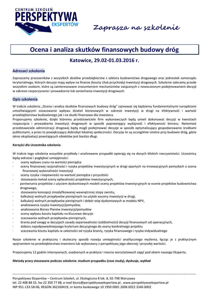 Zaprasza na szkolenie Ocena i analiza skutków finansowych budowy dróg Katowice, 29.02-01.03.2016 r. Adresaci szkolenia Zapraszamy pracowników z wszystkich działów przedsiębiorstw z sektora budownictwa drogowego oraz jednostek samorządu terytorialnego, których decyzje mają wpływ na finanse (koszty i/lub przychody) inwestycji drogowych. Szkolenie zalecamy przede wszystkim osobom, które są zainteresowane zrozumieniem mechanizmów związanych z nowoczesnym podejmowaniem decyzji w zakresie rozpoczynania i prowadzenia lub zaniechania inwestycji drogowych. Opis szkolenia W trakcie szkolenia „Ocena i analiza skutków finansowych budowy dróg” zajmować się będziemy fundamentalnymi narzędziami umożliwiającymi oszacowanie wpływu działań biznesowych w zakresie inwestycji w drogi na efektywność i wartość przedsiębiorstwa budowlanego jak i na skutki finansowe dla inwestora. Proponujemy szkolenie, dzięki któremu przedstawiciele firm wykonawczych będą umieli dokonywać decyzji w kwestiach rozpoczęcia i prowadzenia inwestycji drogowych w sposób poprawiający wydajność i efektywność biznesu. Natomiast przedstawiciele administracji drogowej będą mogli podejmować decyzje w sposób optymalizujący gospodarowanie środkami publicznymi, a przez to powiększający dobrobyt lokalnej społeczności. Decyzje te są szczególnie istotne przy budowie dróg, gdzie okres eksploatacji powstających obiektów jest bardzo długi. Korzyści dla Uczestnika szkolenia W trakcie tego szkolenia wszystkie przykłady i analizowane przypadki opierają się na danych bliskich rzeczywistości. Uczestnicy będą wdrażać i pogłębiać umiejętności: · oceny wpływu czasu na wartości pieniądza · oceny finansowej racjonalności i ryzyka projektów inwestycyjnych w drogi opartych na innowacyjnych pomysłach a ocena finansowej wykonalności inwestycji · oceny ryzyka i niepewności na wartość pieniądza z przyszłości · stosowania metod oceny opłacalności projektów inwestycyjnych, · porównania projektów z użyciem dyskontowych modeli oceny projektów inwestycyjnych w ocenie projektów budownictwa drogowego, · stosowania koncepcji zmodyfikowanej wewnętrznej stopy zwrotu, · kalkulacji wolnych przepływów pieniężnych na użytek wyceny inwestycji w drogi, · kalkulacji wolnych przepływów pieniężnych i dobór stóp dyskontowych w modelu NPV, · analizowania ryzyka inwestycji/pomysłów, · analizowania Biznes Planów inwestycji/pomysłów · oceny wpływu kosztu kapitału na kluczowe decyzje · szacowania wolnych przepływów pieniężnych, · brania pod uwagę w decyzjach zasady separowalności (oddzielności) decyzji finansowych od operacyjnych, · doboru najodpowiedniejszego kryterium decyzyjnego do oceny konkretnego projektu · szacowania kosztu kapitału w zależności od ryzyka branży, ryzyka finansowego i ryzyka indywidualnego Nasze szkolenie w praktyczny i skuteczny sposób rozwija umiejętności analitycznego myślenia, łącząc je z praktycznym spojrzeniem na przedsiębiorstwo inwestora lub wykonawcy z perspektywy jego obecnej i przyszłej wartości. Proponujemy 12 godzin intensywnych, osadzonych w praktyce i mocno warsztatowych zajęć pod okiem naszego Eksperta. Metody pracy stosowane podczas szkolenia: studium przypadku (case study), dyskusje, wykład ----------------------------------------------------------------------------------------------------------------------------------------------------------Perspektywa Ekspertów – Centrum Szkoleń, ul. Ekologiczna 8 lok. 8, 02-798 Warszawa tel. 22 408 88 33, fax 22 350 77 68, e-mail [email protected] , www.perspektywaekspertow.pl NIP 951-133-58-06, REGON 362169419, nr konta bankowego 10 1950 0001 2006 6922 3346 0002 Harmonogram zajęć DZIEŃ PIERWSZY 10:00 – 16:00 1. Wpływ finansowego celu zarządzania na decyzje inwestycyjne • cel podejmowania inwestycji drogowych. • Rozpoznawanie elementów związanych z nowymi działaniami inwestycyjnymi i próba określenia ich wpływu na wielkość gotówkowych przychodów ze sprzedaży (CR), na EBIT, NOPAT, na wielkość wolnych przepływów pieniężnych (FCF), na poziom ryzyka biznesowego, na poziom stopy kosztu kapitału finansującego przedsiębiorstwo oraz na wartość przedsiębiorstwa. 2. Elementy matematyki finansowej - zmiana wartości pieniądza w czasie • wartość przyszła. • kapitalizacja przepływów pieniężnych. • wartość obecna. • dyskontowanie przepływów pieniężnych. • wartość obecna renty. • ilustracje wpływu czynnika czasu na wartość pieniądza. 3. Przegląd metod oceny opłacalności projektów inwestycyjnych. Ocena inwestycji drogowych na podstawie: • okresu zwrotu • zdyskontowanego okresu zwrotu • zaktualizowanej wartości netto projektu – NPV • wewnętrznej stopy zwrotu projektu – IRR • porównanie dyskontowych modeli oceny projektów inwestycyjnych w ocenie projektów drogowych • przykłady ilustrujące kryteria. 4. Zasady kalkulacji wolnych przepływów pieniężnych na użytek wyceny inwestycji drogowej. Szacowanie przepływów pieniężnych generowanych przez projekty drogowe. Kalkulacja wolnych przepływów pieniężnych. • Różnice w szacowaniu: NCF - przepływów pieniężnych netto, szacowaniu OCF - operacyjnych przepływów pieniężnych netto, szacowaniu FCF - wolnych przepływów pieniężnych, • Zasady szacowania wolnych przepływów pieniężnych generowanych przez inwestycje drogowe: zasada dotycząca zysku w sensie księgowym, zasada dotycząca separowalności konsekwencji decyzji operacyjnych od finansowych, zasada dotycząca kosztów utopionych i korzyści utopionych (różnice w sposobie oceny projektów odtworzeniowych i racjonalizatorskich - analizy przypadków), zasada dotycząca kosztów alternatywnych i korzyści alternatywnych, zasada dotycząca efektów zewnętrznymi, zasada dotycząca traktowania zmian w poziomie kapitału operacyjnego • Szacowanie wolnych przepływ