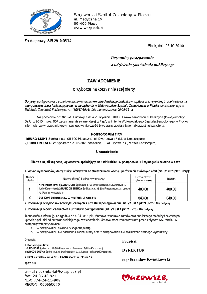 Wojewódzki Szpital Zespolony w Płocku ul. Medyczna 19 09-400 Płock www.wszplock.pl Znak sprawy: SIR 2910-05/14 Płock, dnia 02-10-2014r. Uczestnicy postępowania o udzielenie zamówienia publicznego ZAWIADOMIENIE o wyborze najkorzystniejszej oferty Dotyczy: postępowania o udzielenie zamówienia na termomodernizację budynków szpitala oraz wymianę źródeł światła na energooszczędne z instalacją systemu zarządzania w Wojewódzkim Szpitalu Zespolonym w Płocku zamieszczonego w Biuletynie Zamówień Publicznych nr: 190647-2014; data zamieszczenia: 06-09-2014r Na podstawie art. 92 ust. 1 ustawy z dnia 29 stycznia 2004 r. Prawo zamówień publicznych (tekst jednolity: Dz.U. z 2013 r. poz. 907 ze zmianami) zwanej dalej „uPzp”, w imieniu Wojewódzkiego Szpitala Zespolonego w Płocku informuję, że w przedmiotowym postępowaniu część 6 wybrana została jako najkorzystniejsza oferta: KONSORCJUM FIRM: 1)EURO-LIGHT Spółka z o.o. 05-500 Piaseczno, ul. Dworcowa 17 (Lider Konsorcjum); 2)RUBICON ENERGY Spółka z o.o. 05-502 Piaseczno, ul. Al. Lipowa 73 (Partner Konsorcjum) Uzasadnienie Oferta z najniższą ceną, wykonawca spełniający warunki udziału w postępowaniu i wymagania zawarte w siwz.. 1. Wykaz wykonawców, którzy złożyli oferty wraz ze streszczeniem oceny i porównania złożonych ofert (art. 92 ust.1 pkt 1 uPzp): Numer oferty Nazwa (firma) i adres wykonawcy Liczba pkt w kryterium cena Razem 1. Konsorcjum firm: 1)EURO-LIGHT Spółka z o.o. 05-500 Piaseczno, ul. Dworcowa 17 (Lider Konsorcjum); 2)RUBICON ENERGY Spółka z o.o. 05-502 Piaseczno, ul. Al. Lipowa 73 (Partner Konsorcjum) 400,00 400,00 2. BCS Kamil Balcerzak Sp.J 09-402 Płock, ul. Górna 15 348,80 348,80 2. Informacja o wykonawcach wykluczonych z udziału w postępowaniu (art. 92 ust.1 pkt 3 uPzp): Nie dotyczy. 3. Informacja o odrzuceniu ofert z udziału w postępowaniu (art. 92 ust.1 pkt 2 uPzp): Nie dotyczy. Jednocześnie informuję, że zgodnie z art. 94 ust. 1 pkt. 2 umowa w sprawie zamówienia publicznego może być zawarta po upływie pięciu dni od przesłania niniejszego zawiadomienia. Umowa może zostać zawarta przed upływem ww. terminu w następujących przypadkach: a) w postępowaniu złożono tylko jedną ofertę, b) w postępowaniu nie odrzucona żadnej oferty oraz z postępowania nie wykluczono żadnego wykonawcy. Otrzymują: Podpisał: 1. Konsorcjum firm: 1)EURO-LIGHT Spółka z o.o. 05-500 Piaseczno, ul. Dworcowa 17 (Lider Konsorcjum); 2)RUBICON ENERGY Spółka z o.o. 05-502 Piaseczno, ul. Al. Lipowa 73 (Partner Konsorcjum). 2. BCS Kamil Balcerzak Sp.J 09-402 Płock, ul. Górna 15 3) a/a SIR e-mail: [email protected] fax: 24 36 46 821 NIP: 774-24-11-908 REGON: 000650070 DYREKTOR mgr Stanisław Kwiatkowski