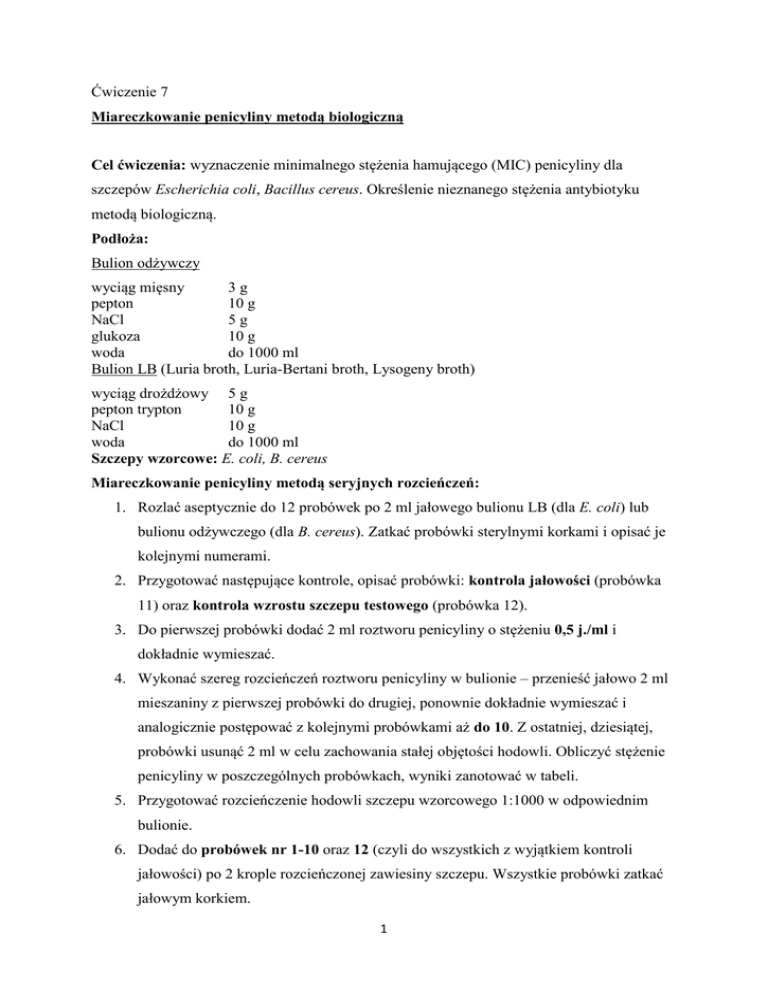 Ćwiczenie 7 Miareczkowanie penicyliny metodą biologiczną Cel ćwiczenia: wyznaczenie minimalnego stężenia hamującego (MIC) penicyliny dla szczepów Escherichia coli, Bacillus cereus. Określenie nieznanego stężenia antybiotyku metodą biologiczną. Podłoża: Bulion odżywczy wyciąg mięsny 3g pepton 10 g NaCl 5g glukoza 10 g woda do 1000 ml Bulion LB (Luria broth, Luria-Bertani broth, Lysogeny broth) wyciąg drożdżowy 5 g pepton trypton 10 g NaCl 10 g woda do 1000 ml Szczepy wzorcowe: E. coli, B. cereus Miareczkowanie penicyliny metodą seryjnych rozcieńczeń: 1. Rozlać aseptycznie do 12 probówek po 2 ml jałowego bulionu LB (dla E. coli) lub bulionu odżywczego (dla B. cereus). Zatkać probówki sterylnymi korkami i opisać je kolejnymi numerami. 2. Przygotować następujące kontrole, opisać probówki: kontrola jałowości (probówka 11) oraz kontrola wzrostu szczepu testowego (probówka 12). 3. Do pierwszej probówki dodać 2 ml roztworu penicyliny o stężeniu 0,5 j./ml i dokładnie wymieszać. 4. Wykonać szereg rozcieńczeń roztworu penicyliny w bulionie – przenieść jałowo 2 ml mieszaniny z pierwszej probówki do drugiej, ponownie dokładnie wymieszać i analogicznie postępować z kolejnymi probówkami aż do 10. Z ostatniej, dziesiątej, probówki usunąć 2 ml w celu zachowania stałej objętości hodowli. Obliczyć stężenie penicyliny w poszczególnych probówkach, wyniki zanotować w tabeli. 5. Przygotować rozcieńczenie hodowli szczepu wzorcowego 1:1000 w odpowiednim bulionie. 6. Dodać do probówek nr 1-10 oraz 12 (czyli do wszystkich z wyjątkiem kontroli jałowości) po 2 krople rozcieńczonej zawiesiny szczepu. Wszystkie probówki zatkać jałowym korkiem. 1 7. Inkubować probówki w cieplarce (temp. 30°C lub 37°C, 24 h). Określić minimalne stężenie hamujące (MIC – minimal inhibitory concentration) dla wybranego szczepu. 8. Analogicznie wykonać szereg rozcieńczeń dla penicyliny o nieznanym stężeniu. Wyznaczyć stężenie roztworu wyjściowego na podstawie otrzymanych wyników. ………. Ryc. Schemat przygotowania rozcieńczeń próbki Wyniki: Tabela. Obserwacja wzrostu w szeregu rozcieńczeń penicyliny o znanym stężeniu nr probówki stężenie penicyliny [j./ml] wzrost szczepu testowego [TAK/NIE] 1 2 3 4 5 6 7 8 9 10 11 12 Minimalne stężenie hamujące wzrost …………………… wynosi: …………………… Tabela. Obserwacja wzrostu w szeregu rozcieńczeń penicyliny o nieznanym stężeniu nr probówki wzrost szczepu testowego [TAK/NIE] 1 2 3 4 5 6 stężenie penicyliny [j./ml] 2 7 8 9 10 11 12 Stężenie penicyliny w próbce ……… wynosiło…………………… Uzasadnienie odpowiedzi: ………………………………………………………………………………………………… ………………………………………………………………………………………………… ………………………………………………………………………………………………… ………………………………………………………………………………………………… ………………………………………………………………………………………………… ………………………………………………………………………………………………… 3