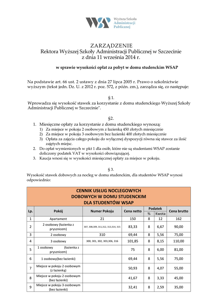 ZARZĄDZENIE Rektora Wyższej Szkoły Administracji Publicznej w Szczecinie z dnia 11 września 2014 r. w sprawie wysokości opłat za pobyt w domu studenckim WSAP Na podstawie art. 66 ust. 2 ustawy z dnia 27 lipca 2005 r. Prawo o szkolnictwie wyższym (tekst jedn. Dz. U. z 2012 r. poz. 572, z późn. zm.), zarządza się, co następuje: § 1. Wprowadza się wysokość stawek za korzystanie z domu studenckiego Wyższej Szkoły Administracji Publicznej w Szczecinie". §2. 1. Miesięczne opłaty za korzystanie z domu studenckiego wynoszą: 1) Za miejsce w pokoju 2 osobowym z łazienką 450 złotych miesięcznie 2) Za miejsce w pokoju 3 osobowym bez łazienki 400 złotych miesięcznie 3) Opłata za zajęcia całego pokoju do wyłącznej dyspozycji równa się stawce za ilość zajętych miejsc. 2. Do opłat wymienionych w pkt 1 dla osób, które nie są studentami WSAP zostanie doliczony podatek VAT w wysokości obowiązującej. 3. Kaucja wnosi się w wysokości miesięcznej opłaty za miejsce w pokoju. § 3. Wysokość stawek dobowych za nocleg w domu studenckim, dla studentów WSAP wynosi odpowiednio: CENNIK USŁUG NOCLEGOWYCH DOBOWYCH W DOMU STUDENCKIM DLA STUDENTÓW WSAP Podatek Cena brutto % Kwota 8 12 162 Lp. Pokój Numer Pokoju Cena netto 1 Apartament 21 150 2 2 osobowy (łazienka z prysznicem) 307, 308,309, 311,312, 313,314, 315 83,33 8 6,67 90,00 3 2 osobowy 310 69,44 8 5,56 75,00 4 3 osobowy 300, 301, 302, 303,306, 316 101,85 8 8,15 110,00 5 1 osobowy (łazienka z prysznicem) 75 8 6,00 81,00 6 1 osobowy(bez łazienki) 69,44 8 5,56 75,00 7 Miejsce w pokoju 2 osobowym (z łazienką) 50,93 8 4,07 55,00 41,67 8 3,33 45,00 32,41 8 2,59 35,00 8 9 Miejsce w pokoju 2 osobowym (bez łazienki) Miejsce w pokoju 3 osobowym (bez łazienki) §4 Wysokość stawek dobowych za nocleg w domu studenckim, dla osób niebędących studentami wynosi odpowiednio: CENNIK USŁUG NOCLEGOWYCH DOBOWYCH W DOMU STUDENCKIM DLA OSÓB NIEBĘDĄCYCH STUDENTAMI Podatek Cena brutto % Kwota 8 12 162,00 Lp. Pokój Numer Pokoju Cena netto 1 Apartament 21 150 2 2 osobowy (łazienka z prysznicem) 307, 308,309, 311,312, 313,314, 315 101,85 8 8,15 110,00 3 2 osobowy 310 78,70 8 6,30 85,00 4 3 osobowy 300, 301, 302, 303,306, 316 115,74 8 9,26 125,00 5 1 osobowy (łazienka z prysznicem) 111,11 8 8,89 120,00 6 1 osobowy(bez łazienki) 74,07 8 5,93 80,00 7 Miejsce w pokoju 2 osobowym (z łazienką) 60,18 8 4,81 65,00 46,30 8 3,70 50,00 41,67 8 3,33 45,00 8 9 Miejsce w pokoju 2 osobowym (bez łazienki) Miejsce w pokoju 3 osobowym (bez łazienki) § 5. Zarządzenie wchodzi w życie z dniem podpisania. Rektor Dr Magdalena Fiternicka - Gorzko
