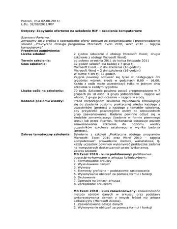 Poznań, dnia 02.08.2011r. L.Dz. 32/08/2011/RIF Dotyczy: Zapytanie ofertowe na szkolenie RIF – szkolenia komputerowe Szanowni Państwo, Zwracamy się z prośbą o sporządzenie oferty cenowej za zorganizowanie i przeprowadzenie szkoleń „Praktyczna obsługa programów Microsoft: Excel 2010, Word 2010 – zajęcia komputerowe” Przedmiot zamówienia: Liczba szkoleń: 2 (jedno szkolenie z obsługi Microsoft Excel; drugie szkolenie z obsługi Microsoft Word) Termin szkolenia: od połowy września 2011 do końca listopada 2011 Czas szkolenia: 32 godzin szkoleń dla każdej z 7 grup tj. Microsoft Excel – 2 dni szkolenia (16 godzin) Microsoft Word – 2 dni szkolenia (16 godzin) W sumie 4 dni tj. 32 godzin. Zajęcia powinny odbywać się tylko w następujące dni tygodnia: wtorek, środa w godzinach 8.00 – 16.00. Każda z osób może uczestniczyć tylko w jednym dniu szkolenia w każdym tygodniu Liczba osób na szkoleniu: 70 osób. Szkolenie powinno zostać przeprowadzone w 7 grupach po 10 osób: 4 grupy jednocześnie – zajęcia we wtorki; 3 grupy jednocześnie – zajęcia w środy. Badanie poziomu wiedzy: Przed rozpoczęciem szkolenia Wykonawca zobowiązuje się do zbadania poziomu praktycznej wiedzy każdego z uczestników (pretest) z każdego z tematów szkolenia, aby przydzielić poszczególne osoby do odpowiednich grup zaawansowania. Badanie powinno odbyć się w siedzibie zamawiającego (badanie w formie pisemnego testu) lub przez internet. Wykonawca dostosuje poziom zaawansowania szkolenia do poziomu wiedzy uczestników szkolenia ustalonego w wyniku badania (pretest). Zakres tematyczny szkolenia: Szkolenie z szkoleń „Praktyczna obsługa programów Microsoft: Excel 2010 oraz Word 2010 – zajęcia komputerowe” prowadzone metodą warsztatową tj. każdy uczestnik powinien wykonywać praktyczne zadania na komputerach dostarczanych przez Wykonawcę. Zakres szkoleń: MS Excel 2010 - kurs podstawowy: podstawowe operacje wykonywane w arkuszu kalkulacyjnym: 1. Formatowanie arkuszy 2. Wyszukiwanie danych 3. Wykresy 4. Elementy graficzne – podstawowe zastosowania 5. Wykonywanie obliczeń za pomocą formuł i funkcji 6. Drukowanie 7. Operacje na oknach arkusza 8. Zarządzanie arkuszami MS Excel 2010 - kurs zaawansowany: zaawansowane metody obróbki danych w arkuszu oraz podstawy wykorzystywania danych z innych źródeł niż arkusz kalkulacyjny (Microsoft Access). 1. Zaawansowana edycja danych 2. Wykonywanie obliczeń za pomocą formuł i funkcji 3. Listy arkuszowe 4. Wyszukiwanie danych 5. Praca z bazami danych 6. Wykorzystywanie makr do automatyzacji zadań w arkuszach 8. Sumy pośrednie 9. Analizowanie danych za pomocą tabel przestawnych 10. Analiza ”co jeśli” 11. Importowanie i eksportowanie danych 12. Elementy graficzne – obrazy danych 13. Zarządzanie zeszytami Microsoft Word 2010 - kurs podstawowy: podstawowe zagadnienia i funkcje edytora tekstu związane z tworzeniem różnego rodzaju dokumentów, tabel. 1. Podstawowe wiadomości o edytorze Word 2. Edycja dokumentu 3. Szablony 4. Style 5. Grafika 6. Tabele 7. Zarządzanie dokumentami Kryteria wyboru: Miejsce szkolenia: Wyżywienie: Microsoft WORD 2010 - kurs zaawansowany: zaawansowane opcje pracy z edytorem tekstu MS Word, które umożliwiają wprowadzenie wysokiego stopnia automatyzacji i efektywności pracy przy tworzeniu i wydruku dokumentów. 1. Szablony 2. Style 3. Zakładki i odsyłacze 4. Spisy treści 5. Wstawianie plików do dokumentu 6. Korespondencja seryjna 7. Makropolecenia 8. Paski narzędzi 9. Podział dokumentu na sekcje 10. Praca z dużymi dokumentami 11. Praca grupowa 12. Zarządzanie dokumentami cena brutto (100%) Miejsce szkolenia zapewnia Wykonawca. Zamawiający wymaga, aby szkolenie odbywało się w centrum Poznania. Sale szkoleniowe powinny być wyposażone w niezbędny sprzęt komputerowy dla uczestników szkolenia oraz krzesła (możliwość korzystania nieodpłatnie z toalety oraz szatni). Wykonawca zapewni również miejsce i warunki do spożywania posiłków, a także 5 miejsc parkingowych w każdym dniu szkolenia. Poczęstunek dla uczestników zapewnia Wykonawca. Ilość uczestników: 70 osób, przy czym zajęcia będą odbywać się w grupach 10 osobowych: we wtorki 4 grupy, w środy 3 grupy. Zamawiający zastrzega sobie prawo do ostatecznego ustalenia liczby uczestników w terminie 3 dni roboczych przed każdym dniem szkolenia. Ilość przerw kawowych: po 2 (30-minutowe) przerwy kawowe w każdym dniu szkolenia. Ilość przerw kanapkowych: 1 (45-minutowa) przerwa kanapkowa w każdym dniu szkolenia. Wymagania dotyczące przerw kawowych: kawa, herbata, cukier, mleko do kawy, woda gazowana, woda niegazowana, ciastka (mieszanka), ciasto, owoce Wymagania dotyczące przerwy kanapkowej: przerwa zostały zaplanowane na ok. 30 min; powinny zostać podane kanapki (minimum 4 rodzaje kanapek np: z wędliną, serem, łososiem). Dodatkowo kawa, herbata, cukier, mleko do kawy, woda gazowana, woda niegazowana, ciastka (mieszanka), ciasto, owoce. Zestawienie posiłków: − Filiżanki świeżo parzonej kawy: ilość osób x 150ml. − Filiżanki świeżo parzonej herbaty: ilość osób x 150 ml, w torebkach, waga torebki 1,5-2g, − Woda gazowana/niegazowana - 0,25l x ilość osób, − Wybór ciastek: minimum 4 rodzaje (w czekoladzie) − Ciasto krojone: jabłecznik, sernik ( z każdego rodzaju po 6 szt. dla każdej grupy szkoleniowej) − Kompozycje owoców: minimum 4 rodzaje np. banany, mandarynki, jabłka, winogrona, 100 g dla każdej osoby − Kanapki: pieczywo jasne i ciemne; masło z minimum 3 składnikami do wyboru: szynka, salami, łosoś, ser żółty, sałata, ogórek zielony surowy, pomidor, szczypiorek. Waga jednej kanapki ok 60g. Ilość: po 10 kanapek dla każdej osoby − Dodatki do kawy/herbaty dla każdej grupy: cukier Materiały szkoleniowe: Certyfikaty ukończenia szkolenia: Dodatkowe informacje: Termin dostarczania ofert: Termin związania ofertą: 10 porcji x 5g, mleko min 2% do