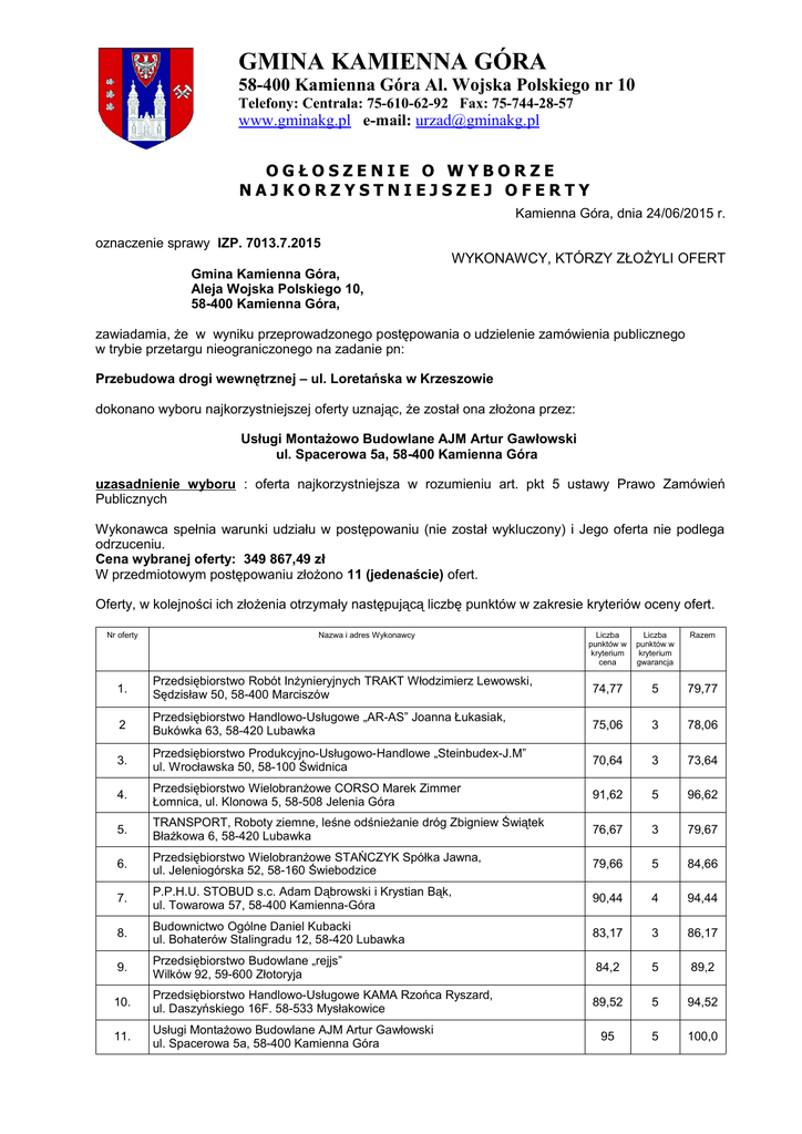 GMINA KAMIENNA GÓRA 58-400 Kamienna Góra Al. Wojska Polskiego nr 10 Telefony: Centrala: 75-610-62-92 Fax: 75-744-28-57 www.gminakg.pl e-mail: [email protected] OGŁOSZENIE O WYBORZE NAJKORZYSTNIEJSZEJ OFERTY Kamienna Góra, dnia 24/06/2015 r. oznaczenie sprawy IZP. 7013.7.2015 WYKONAWCY, KTÓRZY ZŁOŻYLI OFERT Gmina Kamienna Góra, Aleja Wojska Polskiego 10, 58-400 Kamienna Góra, zawiadamia, że w wyniku przeprowadzonego postępowania o udzielenie zamówienia publicznego w trybie przetargu nieograniczonego na zadanie pn: Przebudowa drogi wewnętrznej – ul. Loretańska w Krzeszowie dokonano wyboru najkorzystniejszej oferty uznając, że został ona złożona przez: Usługi Montażowo Budowlane AJM Artur Gawłowski ul. Spacerowa 5a, 58-400 Kamienna Góra uzasadnienie wyboru : oferta najkorzystniejsza w rozumieniu art. pkt 5 ustawy Prawo Zamówień Publicznych Wykonawca spełnia warunki udziału w postępowaniu (nie został wykluczony) i Jego oferta nie podlega odrzuceniu. Cena wybranej oferty: 349 867,49 zł W przedmiotowym postępowaniu złożono 11 (jedenaście) ofert. Oferty, w kolejności ich złożenia otrzymały następującą liczbę punktów w zakresie kryteriów oceny ofert. Nr oferty Nazwa i adres Wykonawcy Liczba punktów w kryterium cena Liczba punktów w kryterium gwarancja Razem 1. Przedsiębiorstwo Robót Inżynieryjnych TRAKT Włodzimierz Lewowski, Sędzisław 50, 58-400 Marciszów 74,77 5 79,77 2 Przedsiębiorstwo Handlowo-Usługowe „AR-AS” Joanna Łukasiak, Bukówka 63, 58-420 Lubawka 75,06 3 78,06 3. Przedsiębiorstwo Produkcyjno-Usługowo-Handlowe „Steinbudex-J.M” ul. Wrocławska 50, 58-100 Świdnica 70,64 3 73,64 4. Przedsiębiorstwo Wielobranżowe CORSO Marek Zimmer Łomnica, ul. Klonowa 5, 58-508 Jelenia Góra 91,62 5 96,62 5. TRANSPORT, Roboty ziemne, leśne odśnieżanie dróg Zbigniew Świątek Błażkowa 6, 58-420 Lubawka 76,67 3 79,67 6. Przedsiębiorstwo Wielobranżowe STAŃCZYK Spółka Jawna, ul. Jeleniogórska 52, 58-160 Świebodzice 79,66 5 84,66 7. P.P.H.U. STOBUD s.c. Adam Dąbrowski i Krystian Bąk, ul. Towarowa 57, 58-400 Kamienna-Góra 90,44 4 94,44 8. Budownictwo Ogólne Daniel Kubacki ul. Bohaterów Stalingradu 12, 58-420 Lubawka 83,17 3 86,17 9. Przedsiębiorstwo Budowlane „rejjs” Wilków 92, 59-600 Złotoryja 84,2 5 89,2 10. Przedsiębiorstwo Handlowo-Usługowe KAMA Rzońca Ryszard, ul. Daszyńskiego 16F. 58-533 Mysłakowice 89,52 5 94,52 11. Usługi Montażowo Budowlane AJM Artur Gawłowski ul. Spacerowa 5a, 58-400 Kamienna Góra 95 5 100,0 Z postępowania nie wykluczono Wykonawcy oraz nie odrzucono oferty. Umowa w sprawie zamówienia publicznego może być zawarta przed upływem terminu określonego w art. 94 ust. 1 ustawy PZP. W postępowaniu nie wykluczono Wykonawcy oraz nie odrzucono ofert. WÓJT /-/ Patryk Straus WÓJT / - Szmajdziński (Imię,nazwisko i podpis osoby uprawnionej)