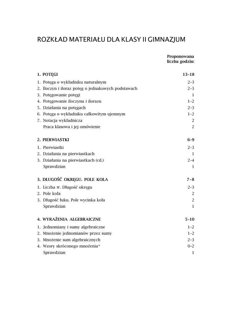 ROZKŁAD MATERIAŁU DLA KLASY II GIMNAZJUM Proponowana liczba godzin: 1. POTĘGI 13–18 1. Potęga o wykładniku naturalnym 2–3 2. Iloczyn i iloraz potęg o jednakowych podstawach 2–3 3. Potęgowanie potęgi 1 4. Potęgowanie iloczynu i ilorazu 1–2 5. Działania na potęgach 2–3 6. Potęga o wykładniku całkowitym ujemnym 1–2 7. Notacja wykładnicza Praca klasowa i jej omówienie 2 2 2. PIERWIASTKI 6–9 1. Pierwiastki 2–3 2. Działania na pierwiastkach 3. Działania na pierwiastkach (cd.) Sprawdzian 1 2–4 1 3. DŁUGOŚĆ OKRĘGU. POLE KOŁA 7–8 1. Liczba π . Długość okręgu 2–3 2. Pole koła 2 3. Długość łuku. Pole wycinka koła 2 Sprawdzian 4. WYRAŻENIA ALGEBRAICZNE 1 5–10 1. Jednomiany i sumy algebraiczne 1–2 2. Mnożenie jednomianów przez sumy 1–2 3. Mnożenie sum algebraicznych 2–3 4. Wzory skróconego mnożenia∗ 0–2 Sprawdzian 1 Rozkład materiału dla klasy II gimnazjum 5. UKŁADY RÓWNAŃ 15–18 1. Do czego służą układy równań? 1 2. Rozwiązywanie układów równań 2 3. Rozwiązywanie układów równań (cd.) 4. Ile rozwiązań może mieć układ równań? Sprawdzian 3–4 1 1 5. Zadania tekstowe 4–5 6. Procenty w zadaniach tekstowych 1–2 Praca klasowa i jej omówienie 6. TRÓJKĄTY PROSTOKĄTNE 1. Twierdzenie Pitagorasa 2. Twierdzenie odwrotne do twierdzenia Pitagorasa 2 14–18 2–3 1 3. Zastosowania twierdzenia Pitagorasa 3–4 4. Twierdzenie Pitagorasa w układzie współrzędnych 1–2 5. Przekątna kwadratu. Wysokość trójkąta równobocznego 6. Trójkąty o kątach 90◦ , 45◦ , 45◦ oraz 90◦ , 30◦ , 60◦ 7. Powtórzenie wiadomości Praca klasowa i jej omówienie 7. WIELOKĄTY I OKRĘGI 2 2–3 1 2 12 1. Okrąg opisany na trójkącie 2 2. Styczna do okręgu 1 3. Okrąg wpisany w trójkąt 2 4. Wielokąty foremne 2 5. Wielokąty foremne — okręgi wpisane i opisane 2 6. Powtórzenie wiadomości 1 Praca klasowa i jej omówienie 8. GRANIASTOSŁUPY 2 11–13 1. Przykłady graniastosłupów 1–2 2. Siatki graniastosłupów. Pole powierzchni 1–2 3. Objętość prostopadłościanu. Jednostki objętości 2 4. Objętość graniastosłupa 2 5. Odcinki w graniastosłupach 2 6. Powtórzenie wiadomości 1 Praca klasowa i jej omówienie 2 Rozkład materiału dla klasy II gimnazjum 9. OSTROSŁUPY 1. Rodzaje ostrosłupów 2. Siatki ostrosłupów. Pole powierzchni 9–15 1–2 2 3. Objętość ostrosłupa 1–2 4. Obliczanie długości odcinków w ostrosłupach 2–3 5. Przekroje graniastosłupów i ostrosłupów∗ 0–3 6. Powtórzenie wiadomości Praca klasowa i jej omówienie 10. STATYSTYKA 1 2 8–11 1. Odczytywanie danych statystycznych 2–3 2. Co to jest średnia? 1–2 3. Zbieranie i opracowywanie danych statystycznych 2–3 4. Zdarzenia losowe Sprawdzian RAZEM Symbolem 2 1 100–132 ∗ oznaczono tematy i działy nieobowiązkowe Przy niektórych tematach podaliśmy propozycje od – do. Nauczyciel powinien sam wybrać odpowiednią liczbę godzin, w zależności od poziomu klasy oraz czasu, którym w rzeczywistości dysponuje. Przy czterech godzinach tygodniowo, po odliczeniu lekcji, które się nie odbędą z powodu absencji, wycieczek, imprez szkolnych itp., na realizację materiału pozostaje zwykle około 125 godzin.