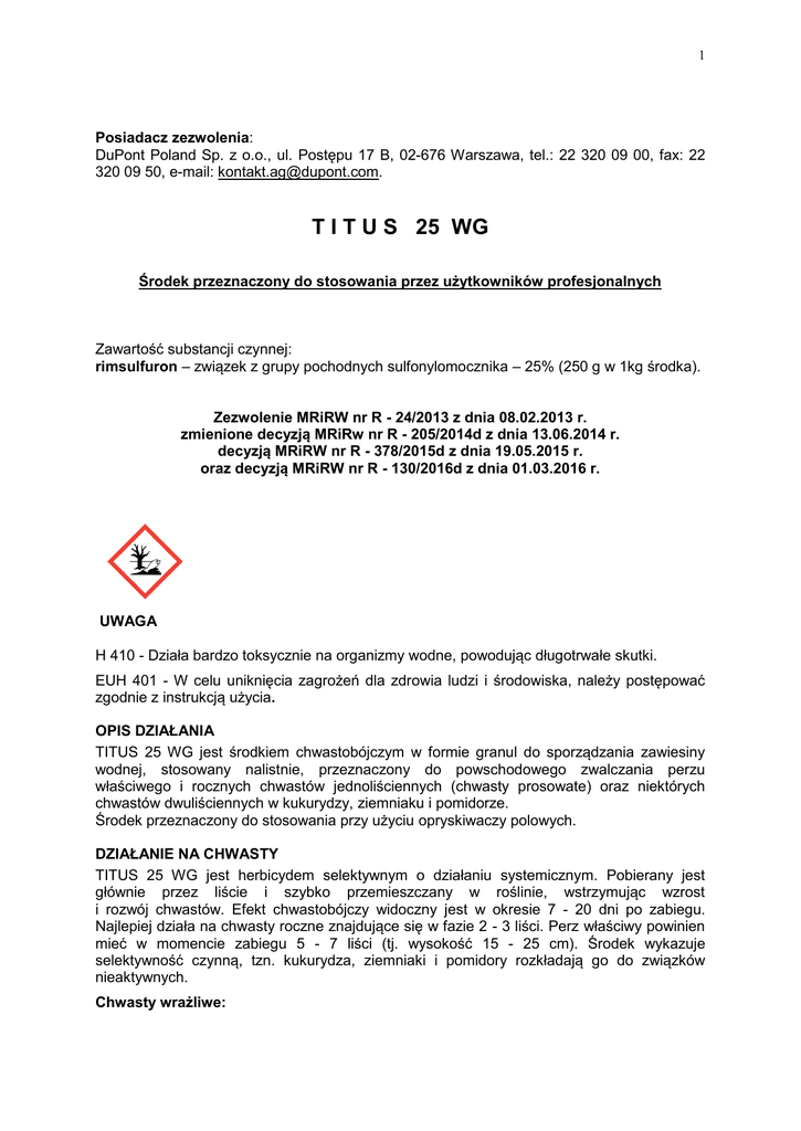 1 Posiadacz zezwolenia: DuPont Poland Sp. z o.o., ul. Postępu 17 B, 02-676 Warszawa, tel.: 22 320 09 00, fax: 22 320 09 50, e-mail: [email protected]. T I T U S 25 WG Środek przeznaczony do stosowania przez użytkowników profesjonalnych Zawartość substancji czynnej: rimsulfuron – związek z grupy pochodnych sulfonylomocznika – 25% (250 g w 1kg środka). Zezwolenie MRiRW nr R - 24/2013 z dnia 08.02.2013 r. zmienione decyzją MRiRw nr R - 205/2014d z dnia 13.06.2014 r. decyzją MRiRW nr R - 378/2015d z dnia 19.05.2015 r. oraz decyzją MRiRW nr R - 130/2016d z dnia 01.03.2016 r. UWAGA H 410 - Działa bardzo toksycznie na organizmy wodne, powodując długotrwałe skutki. EUH 401 - W celu uniknięcia zagrożeń dla zdrowia ludzi i środowiska, należy postępować zgodnie z instrukcją użycia. OPIS DZIAŁANIA TITUS 25 WG jest środkiem chwastobójczym w formie granul do sporządzania zawiesiny wodnej, stosowany nalistnie, przeznaczony do powschodowego zwalczania perzu właściwego i rocznych chwastów jednoliściennych (chwasty prosowate) oraz niektórych chwastów dwuliściennych w kukurydzy, ziemniaku i pomidorze. Środek przeznaczony do stosowania przy użyciu opryskiwaczy polowych. DZIAŁANIE NA CHWASTY TITUS 25 WG jest herbicydem selektywnym o działaniu systemicznym. Pobierany jest głównie przez liście i szybko przemieszczany w roślinie, wstrzymując wzrost i rozwój chwastów. Efekt chwastobójczy widoczny jest w okresie 7 - 20 dni po zabiegu. Najlepiej działa na chwasty roczne znajdujące się w fazie 2 - 3 liści. Perz właściwy powinien mieć w momencie zabiegu 5 - 7 liści (tj. wysokość 15 - 25 cm). Środek wykazuje selektywność czynną, tzn. kukurydza, ziemniaki i pomidory rozkładają go do związków nieaktywnych. Chwasty wrażliwe: 2 blekot pospolity, bodziszek drobny, chwastnica jednostronna, dymnica pospolita, gwiazdnica pospolita, jasnota purpurowa, perz właściwy, przytulia czepna, samosiewy rzepaku, szarłat szorstki, tasznik pospolity, tobołki polne. Chwasty średnio wrażliwe: fiołek polny, komosa biała, rdest powojowy, wilczomlecz obrotny. Chwasty średnioodporne: przetacznik perski. STOSOWANIE ŚRODKA Kukurydza. a) Zwalczanie perzu właściwego, chwastnicy jednostronnej i innych chwastów prosowatych oraz niektórych chwastów jednorocznych jednoliściennych i dwuliściennych. Maksymalna dawka środka dla jednorazowego zastosowania: 60 g/ha. Zalecana dawka środka dla jednorazowego zastosowania: 50 – 60 g/ha. Titus 25 WG 50 - 60 g/ha + Trend 90 EC w stężeniu 0,1% (100 ml /100 l wody). Wyższą dawkę stosować przy dużym występowaniu gatunków chwastów innych niż chwastnica jednostronna. Termin stosowania: Środek stosować w fazie 1 - 7 liści kukurydzy (licząc wszystkie liście). b) Zwalczanie chwastów prosowatych i chwastów dwuliściennych występujących w dużym nasileniu. Maksymalna / zalecana dawka środka dla jednorazowego zastosowania: 50 g/ha. Titus 25 WG 50 g/ha + Refine 75 WG (lub Harmony 75 WG) 10 g/ha + Trend 90 EC w stężeniu 0,1% (100 ml /100 l wody). Termin stosowania: Środek stosować w fazie 3 - 4 liści kukurydzy (licząc wszystkie liście). Zalecana ilość wody: 200-300 l/ha. Zalecane opryskiwania: średniokropliste. Maksymalna liczba zabiegów w sezonie wegetacyjnym: 1. Ziemniak. a) Zwalczanie perzu właściwego oraz chwastów prosowatych i niektórych chwastów dwuliściennych. A. Zabieg jednorazowy Maksymalna / zalecana dawka środka dla jednorazowego zastosowania: 60 g/ha. Titus 25 WG 60 g/ha + Trend 90 EC w stężeniu 0,1%. Termin stosowania: Środek stosować w fazie od pierwszego liścia do fazy widocznego drugiego pędu bocznego ziemniaka. B. Zabieg dwukrotny (dawka dzielona) pierwszy zabieg Maksymalna / zalecana dawka środka dla jednorazowego zastosowania: 30 g/ha. Titus 25 WG 30 g/ha + Trend 90 EC w stężeniu 0,1%. Termin stosowania: Środek stosować w fazie 1 – 7 liści ziemniaka, w fazie 2-3 liści perzu właściwego. drugi zabieg Maksymalna / zalecana dawka środka dla jednorazowego zastosowania: 30 g/ha. Titus 25 WG 30 g/ha + Trend 90 EC w stężeniu 0,1%. 3 Termin stosowania: Środek stosować po upływie 15 dni od pierwszego zabiegu gdy rośliny ziemniaka osiągną wysokość do 15 cm lub w momencie wtórnego odrastania perzu właściwego. Zalecana ilość wody 200-300 l/ha. Zalecane opryskiwania: średniokropliste. b) Silne zachwaszczenia komosą białą i innymi chwastami dwuliściennymi. A. Zabieg jednorazowy Maksymalna dawka środka dla jednorazowego zastosowania: 50 g/ha. Zalecana dawka środka dla jednorazowego zastosowania: 40 – 50 g/ha. Titus 25 WG 40-50 g/ha + Sencor 70 WG 0,3 kg/ha + Trend 90 EC w stężeniu 0,1%. Wyższą z zalecanych dawek środka Titus 25 WG stosować, gdy występuje silne zachwaszczenie. Termin stosowania: Środek stosować gdy rośliny ziemniaka osiągnęły wysokość 15 cm, chwasty jednoliścienne są w fazie 2-3 liści, a chwasty dwuliścienne w fazie 2-6 liści. B. Zabieg dwukrotny (dawka dzielona) pierwszy zabieg Maksymalna / zalecana dawka środka dla jednorazowego zastosowania: 30 g/ha. Titus 25 WG 30g/ha + Sencor 70 WG 0,25 kg/ha + Trend 90 EC w stężeniu 0,1%. Termin stosowania: Środek stosować gdy rośliny ziemniaka osiągnęły wysokość 15 cm, chwasty jednoliścienne są w fazie 1-3 liści; a chwasty dwuliścienne w fazie 2-4 liści. drugi zabieg Maksymalna / zalecana dawka środka dla jednorazowego zastosowania: 20 g/ha. Titus 25 WG 20 g/ha + Trend 90 EC w stężeniu 0,1%. Termin stosowania: Środek stosować po upływie 15 dni od pierwszego zabiegu na ponownie wschodzące chwasty. Zalecana ilość wody: 200-300 l/ha. Zalecane opryskiwania: średniokropliste. W odmianach ziemniaka wrażliwych na Sencor 70 WG środek Titus 25 WG stosować po wschodach ziemniaka. pierwszy zabieg tuż przed wschodami roślin ziemniaka, po uprzednim obredleniu i zabronowaniu plantacji stosować środek Sencor 70 WG w dawce 0,5 kg/ha. drugi zabieg Maksymalna / z