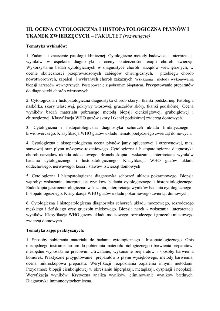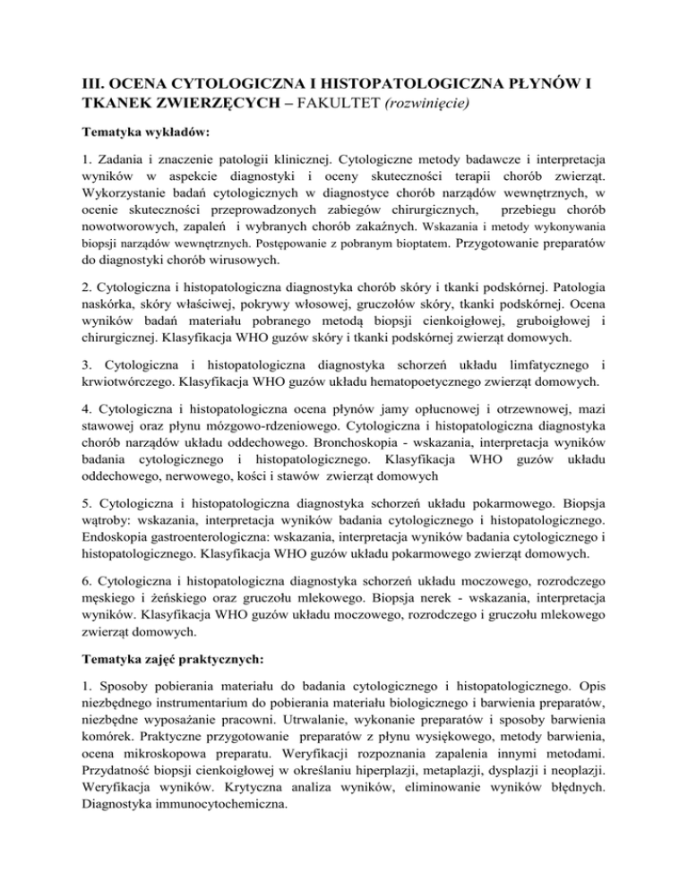 III. OCENA CYTOLOGICZNA I HISTOPATOLOGICZNA PŁYNÓW I TKANEK ZWIERZĘCYCH – FAKULTET (rozwinięcie) Tematyka wykładów: 1. Zadania i znaczenie patologii klinicznej. Cytologiczne metody badawcze i interpretacja wyników w aspekcie diagnostyki i oceny skuteczności terapii chorób zwierząt. Wykorzystanie badań cytologicznych w diagnostyce chorób narządów wewnętrznych, w ocenie skuteczności przeprowadzonych zabiegów chirurgicznych, przebiegu chorób nowotworowych, zapaleń i wybranych chorób zakaźnych. Wskazania i metody wykonywania biopsji narządów wewnętrznych. Postępowanie z pobranym bioptatem. Przygotowanie preparatów do diagnostyki chorób wirusowych. 2. Cytologiczna i histopatologiczna diagnostyka chorób skóry i tkanki podskórnej. Patologia naskórka, skóry właściwej, pokrywy włosowej, gruczołów skóry, tkanki podskórnej. Ocena wyników badań materiału pobranego metodą biopsji cienkoigłowej, gruboigłowej i chirurgicznej. Klasyfikacja WHO guzów skóry i tkanki podskórnej zwierząt domowych. 3. Cytologiczna i histopatologiczna diagnostyka schorzeń układu limfatycznego i krwiotwórczego. Klasyfikacja WHO guzów układu hematopoetycznego zwierząt domowych. 4. Cytologiczna i histopatologiczna ocena płynów jamy opłucnowej i otrzewnowej, mazi stawowej oraz płynu mózgowo-rdzeniowego. Cytologiczna i histopatologiczna diagnostyka chorób narządów układu oddechowego. Bronchoskopia - wskazania, interpretacja wyników badania cytologicznego i histopatologicznego. Klasyfikacja WHO guzów układu oddechowego, nerwowego, kości i stawów zwierząt domowych 5. Cytologiczna i histopatologiczna diagnostyka schorzeń układu pokarmowego. Biopsja wątroby: wskazania, interpretacja wyników badania cytologicznego i histopatologicznego. Endoskopia gastroenterologiczna: wskazania, interpretacja wyników badania cytologicznego i histopatologicznego. Klasyfikacja WHO guzów układu pokarmowego zwierząt domowych. 6. Cytologiczna i histopatologiczna diagnostyka schorzeń układu moczowego, rozrodczego męskiego i żeńskiego oraz gruczołu mlekowego. Biopsja nerek - wskazania, interpretacja wyników. Klasyfikacja WHO guzów układu moczowego, rozrodczego i gruczołu mlekowego zwierząt domowych. Tematyka zajęć praktycznych: 1. Sposoby pobierania materiału do badania cytologicznego i histopatologicznego. Opis niezbędnego instrumentarium do pobierania materiału biologicznego i barwienia preparatów, niezbędne wyposażanie pracowni. Utrwalanie, wykonanie preparatów i sposoby barwienia komórek. Praktyczne przygotowanie preparatów z płynu wysiękowego, metody barwienia, ocena mikroskopowa preparatu. Weryfikacji rozpoznania zapalenia innymi metodami. Przydatność biopsji cienkoigłowej w określaniu hiperplazji, metaplazji, dysplazji i neoplazji. Weryfikacja wyników. Krytyczna analiza wyników, eliminowanie wyników błędnych. Diagnostyka immunocytochemiczna. 2. Diagnostyka cytologiczna zmian zapalnych, niezapalnych i nowotworowych skóry i tkanki podskórnej. Metody pobierania i barwienia materiału. Wykonanie biopsji cienkoigłowej i gruboigłowej. Sporządzanie, barwienie i skanowanie preparatów. Interpretacja wyników. 3.Cytodiagnostyka chłoniaków i innych zmian nowotworowych i nienowotworowych w węzłach chłonnych. Cytodiagnostyka białaczek. Metody utrwalania i barwienia komórek. Wykonanie biopsji cienkoigłowej i gruboigłowej. Biopsja szpiku. Sporządzanie, barwienie i skanowanie preparatów. Interpretacja wyników. 4. Badanie cytologiczne płynów jamy opłucnowej i otrzewnowej, mazi stawowej oraz płynu mózgowo-rdzeniowego. Diagnostyka cytologiczna chorób płuc. Wykonanie punkcji płynu mózgowo-rdzeniowego, jam ciała, jamy stawowej. Bronchoskopia. Sporządzanie, barwienie i skanowanie preparatów. Interpretacja wyników. 5. Diagnostyka cytologiczna chorób przewodu pokarmowego. Biopsja wątroby. Badanie cytologiczne błony śluzowej przewodu pokarmowego. Metody barwienia. Sporządzanie, barwienie i skanowanie preparatów. Interpretacja wyników. 6. Diagnostyka cytologiczna zmian w układzie moczowym, rozrodczym i gruczole mlekowym. Sposoby pobierania materiału. Sporządzanie, barwienie i skanowanie preparatów,. Interpretacja wyników. Literatura: 1. Theory and Practice of Histological Techniques [Hardcover] John D. Bancroft, Marilyn Gamble. Sixth ed. (Churchill Livingstone Elsevier). 2. Pathologic Basis of Veterinary Disease McGavin and Zachary, Fourth ed. (Mosby) 3. WSAVA Standards for Histological and Clinical Diagnosis of Canine and Feline Liver Diseases published by Elsevier 4. Atlas of veterinary hematology: blood and bone marrow of domestic animals. Harvey (Saunders) 5. Atlas of Canine and Feline Cytology, Ruskin and Meyer (Saunders) 6. Canine and Feline Cytology, 2nd Edition - A Color Atlas and Interpretation. Ruskin (Elsevier) 7. Diagnostic cytology and hematology of the dog and cat. Cowell (Mosby) 8. Veterinary comparative hematopathology. Valli ( Blacwell Science) 9. Small Animal Oncology. Withrow and MacEwen's (Elsevier) 10. Tumors in Domestic Animals, Meuten (Hardcover). 11. Diagnostic Cytology and Hematology of the Horse, Cowell and Tyler (Elsevier) 12. Veterinary Cytology: Dog, Cat, Horse and Cow (Self-Assessment Colour Review) [Paperback] Kathleen Freeman , J. Archer, Joan Duncan, Bernard F. Feldman , Corinne Fournel , Kathleen Freeman, K. Gerber , Michael Harter, Heather Holloway , Anne Lanevschi , Hugh Larkin , Sally Lester, Kostas Papasouliotis, Mark Pinches , Shashi K. Ramaiah, Frederico Sacchini, Elizabeth Villiers 13. Atlas of Liver Pathology 3e Kanel G., W.B. Saundres Company . 14. Biopsy interpretation of the liver Geller S., Lippincott Wiliams & Wilkins. 15. Diagnostic pathology kidney diseases Colvin R., Amirsys. 16. Atlas of Canine and Feline Gastrointestinal Endoscopy and Related Pathology, E.J. Hall. 17. Blood and Bone marrow Pathology, Prwit, Churchill Livingstone, 2011. 18. Diagnostic Pathology: Blood and B