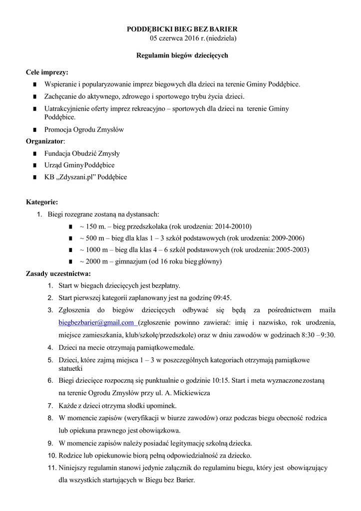 PODDĘBICKI BIEG BEZ BARIER 05 czerwca 2016 r. (niedziela) Regulamin biegów dziecięcych Cele imprezy: ■ Wspieranie i popularyzowanie imprez biegowych dla dzieci na terenie Gminy Poddębice. ■ Zachęcanie do aktywnego, zdrowego i sportowego trybu życia dzieci. ■ Uatrakcyjnienie oferty imprez rekreacyjno – sportowych dla dzieci na terenie Gminy Poddębice. ■ Promocja Ogrodu Zmysłów Organizator: ■ Fundacja Obudzić Zmysły ■ Urząd Gminy Poddębice ■ KB „Zdyszani.pl” Poddębice Kategorie: 1. Biegi rozegrane zostaną na dystansach: ■ ~ 150 m. – bieg przedszkolaka (rok urodzenia: 2014-20010) ■ ~ 500 m – bieg dla klas 1 – 3 szkół podstawowych (rok urodzenia: 2009-2006) ■ ~ 1000 m – bieg dla klas 4 – 6 szkół podstawowych (rok urodzenia: 2005-2003) ■ ~ 2000 m – gimnazjum (od 16 roku bieg główny) Zasady uczestnictwa: 1. Start w biegach dziecięcych jest bezpłatny. 2. Start pierwszej kategorii zaplanowany jest na godzinę 09:45. 3. Zgłoszenia do biegów dziecięcych odbywać się będą za pośrednictwem maila [email protected] (zgłoszenie powinno zawierać: imię i nazwisko, rok urodzenia, miejsce zamieszkania, klub/szkołę/przedszkole) oraz w dniu zawodów w godzinach 8:30 – 9:30. 4. Dzieci na mecie otrzymają pamiątkowe medale. 5. Dzieci, które zajmą miejsca 1 – 3 w poszczególnych kategoriach otrzymają pamiątkowe statuetki 6. Biegi dziecięce rozpoczną się punktualnie o godzinie 10:15. Start i meta wyznaczone zostaną na terenie Ogrodu Zmysłów przy ul. A. Mickiewicza 7. Każde z dzieci otrzyma słodki upominek. 8. W momencie zapisów (weryfikacji w biurze zawodów) oraz podczas biegu obecność rodzica lub opiekuna prawnego jest obowiązkowa. 9. W momencie zapisów należy posiadać legitymację szkolną dziecka. 10. Rodzice lub opiekunowie biorą pełną odpowiedzialność za dziecko. 11. Niniejszy regulamin stanowi jedynie załącznik do regulaminu biegu, który jest obowiązujący dla wszystkich startujących w Biegu bez Barier.