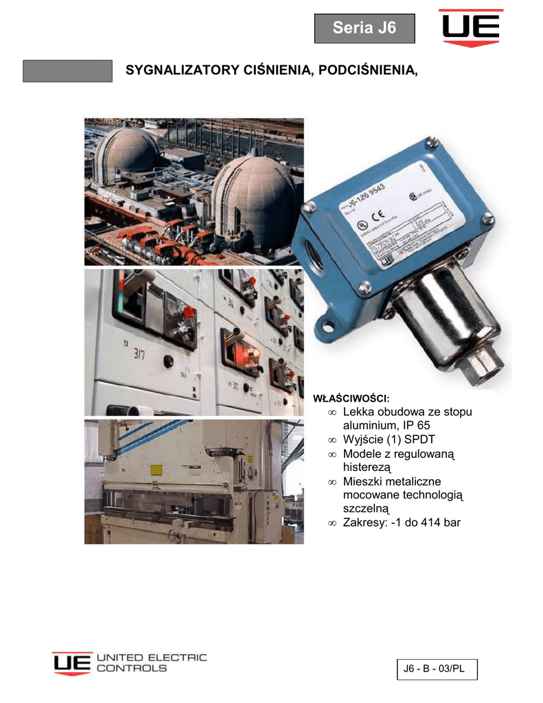 Seria J6 SYGNALIZATORY CIŚNIENIA, PODCIŚNIENIA, WŁAŚCIWOŚCI: • Lekka obudowa ze stopu aluminium, IP 65 • Wyjście (1) SPDT • Modele z regulowaną histerezą • Mieszki metaliczne mocowane technologią szczelną • Zakresy: -1 do 414 bar J6 - B - 03/PL Seria J6 WPROWADZENIE: Seria J6 jest sygnalizatorem ciśnienia zaprojektowanym szczególnie do aplikacji sterowania procesem w przemyśle. Mała i kompaktowa obudowa zawiera sensory mieszkowe o bardzo wysokiej czułości, a przez to wąskiej histerezie jak teŜ moŜe występować w konstrukcji z szeroko regulowaną histerezą. Oprócz szerokich moŜliwości technicznych dodatkowym walorem serii J6 jest bardzo korzystna cena. Seria J6 stanowi znakomitą ofertę dla szerokiej gamy przemysłu w aplikacjach zabezpieczeń i blokad. Bardzo pozytywnym uznaniem seria J6 cieszy się wśród producentów OEM – jako wyposaŜenie seryjne wytwarzanych przez nich maszyn. WŁAŚCIWOSCI: • Certyfikaty: UL, cUL zgodność z dyrektywą CE, niskiego napięcia i dyrektywą ciśnieniową • Opcjonalnie ATEX lub GOST. • Obudowa IP65 do aplikacji na zewnątrz • (1) styk typu SPDT • Wersja z regulowana histerezą do precyzyjnego sterowania zał./wył. 2 • Mieszki z mosiądzu lub SS316 • Opcja z kasowaniem styków ręcznie Seria J6 SPECYFIKACJA: od -54°C do 71°C od -40°C do 71°C, zmiana nastawy <1% zakresu przy z mianie temperatury o 28°C Modele 126-364, 680: ± !% zakresu; modele 610-614: 1.5% Powtarzalność: zakres powtarzalność nastawy po udarze do 15G trwajacym do PrzeciąŜalność: 10 ms powtarzalność nastawy przy amplitudzie do 2,5G w zakresie Drgania: 5-500Hz ciśnieniowy odlew aluminiowy, epoksydowany proszkowo, Obudowa: uszczelniony IP 65, NEMA 4X Klasa obudowy: (1)próg podłączenie styków-normalnie otwarte lub zamknięte; Sygnał wyjściowy: Typ J6D zawiera mikrowyłącznik z regulowana histerezą 15A 125/250/480 VAC obciąŜenie rezystancyjne, styki mają ObciąŜalność styków: ograniczenia dla prądu stałego (DC). NaleŜy skontaktować się z producentem 0.68 kg w zaleŜności od modelu Waga: gwint pod dławik ½” NPT (wew.), dwa miejsca przygotowane Przyłącze elektryczne: do łatwego wykonania dodatkowych otworów o średnicy Ø 22mm (cieńsza ścianka odlewu) wszystkie modele ¼” NPTF (wew.) z wyjątkiem modeli: Przyłącza procesowe: S126B-S160B: ½” NPTF, inne moŜliwe opcyjnie – prosimy o s. ciśnienia kontakt. typy E mają takie same wykonanie jak typy F – jednakŜe Przyłącza procesowe: zakresy są ograniczone z powodu uŜycia mechanizmów s. temperatury nastawczych ze skalą referencyjną czujnik z kapilarą: 1,8m ze stali 304 czujnik obiektowy: modele 120 i 121: mosiądz niklowany, opcjonalnie stal nierdzewna 316L * w/w modele mogą być wyposaŜone dodatkowo w redukcje G ½” oraz M20 x 1,5. W celu ustalenia szczegółów skontaktuj się z dystrybutorem. Temperatura składowania Temperatura otoczenia: 3 Seria J6 SYGNALIZATORY CIŚNIENIA: Model Zakres nastawy progowej Histereza Dopuszczalne Max. ciśnienie max. ciśnienie pracy TYP J6 bar mbar bar bar Mieszek i króciec ze stali SS316L, mieszek przyspawany do króćca, przyłącze ½’’NPTF (wew.) S126B -1 do 0 6,8 do 27,1 0,2 0,3 S134B -1 do 1,4 6,8 do 27,1 1,4 1,7 S136B 0 do 124,5 mbar 7,5 do 14,9 124,5 mbar 0,3 S142B 0 do 1,2 10 do 17,4 1,2 1,7 S148B 0 do 2,8 6,9 do 27,6 2,8 2,8 S152B 0 do 3,4 6,9 do 34,5 3,4 5,2 S156B 0,2 do 6,9 13,8 do 55,2 6,9 8,6 S160B 3,4 do 12,4 20,7 do 68,9 12,4 12,4 Mieszek oraz króciec ze stali SS316L, mieszek przyspawany do króćca; przyłącze ¼ ”NPTF; model 680 nie zalecany na gwałtowne skoki lub pulsacje ciśnienia bar bar bar bar 354 0 do 3,4 0,1 do 0,2 3,4 5,2 356 0 do 6,9 0,1 do 0,3 6,9 10,3 358 0 do 13,8 0,2 do 0,3 13,8 17,2 360 0 do 17,2 0,2 do 0,3 17,2 22,8 362 0 do 24,1 0,1 do 0,6 24,1 29,6 364 0 do 34,5 0,2 do 0,62 34,5 39,6 680 6,9 do 117,2 0,6 do 1,6 117,2 172,4 Tłoczek ze stali SS303: oring z Buna-N: króciec ze stali SS303; przyłącze ¼”NPTF. Czujnik nie zalecany do aplikacji na gazach, poniewaŜ brak zwilŜania powierzchni cylindra i oringu moŜe doprowadzić do jego wytarcia powodując przeciek. 610 5,2 do 68,9 2,1 do 10,3 68,9 689,5 612 8,6 do 206,8 2,8 do 17,2 206,8 689,5 614 34,5 do 413,7 3,4, do 27,6 413,7 689,5 4 Seria J6 SYGNALIZATORY CIŚNIENIA: Model Zakres nastawy progowej Histereza Dopuszczalne max. ciśnienie pracy Max. ciśnienie TYP J6 bar mbar bar bar Mieszek spręŜysty z mosiądzu, króciec z mosiądzu-niklowany, przyłącze ¼ ”NPTF; modele 126 i 134 posiadają zabudowaną cynkowaną stalową spręŜynę, która jest zwilŜana przez medium. 126 -1 do 0 6,8 do 27,1 0,2 0,3 134 -1 do 1,4 6,8 do 27,1 1,4 1,7 136 0 do 124,5 mbar 7,5 do 14,9 124,5 mbar 0,3 142 0 do 1,2 10 do 17,4 1,2 1,7 148 0 do 2,8 6,9 do 27,6 2,8 2,8 152 0 do 3,4 6,9 do 34,5 3,4 5,2 156 0,2 do 6,9 13,8 do 55,2 6,9 8,6 160 3,4 do 12,4 20,7 do 68,9 12,4 12,4 Mieszek spręŜysty z brązu, króciec z mosiądzu - niklowany; przyłącze ¼ ” NPTF 218 - 1do 0 33,9 do 67,7 0 2,1 222 0 do 1,4 34,5 do 68,9 1,4 2,1 224 0 do 2,1 34,5 do 68,9 2,1 3,1 226 0 do 3,4 48,3 do 89,6 3,4 5,2 230 0 do 6,9 68,9 do 100 6,9 7,6 258 0 do 3,4 0,1 do 0,2 bar 3,4 5,2 266 0 do 6,9 0,1 do 0,3 bar 6,9 10,3 270 0 do 13,8 0,2 do 0,3 bar 13,8 17,2 272 0 do 17,2 0,2 do 0,3 bar 17,2 22,8 274 0 do 20,7 0,3 do 0,4 bar 20,7 24,1 TYP J6D Modele z regulowaną histerezą; inne modele z regulowana histerezą teŜ są dostępne, naleŜy dodać do specyfikacji opcje 152- patrz lista opcji strona 6 126 -1 do 0 10,2 do 42,3 0,2 0,3 134 -1 do 1,4 10,2 do 42,3 1,4 1,7 142 0 do 1,2 12,4 do 39,8 1,2 1,7 148 0 do 2,8 6,9 do 55,2 2,8 2,8 156 0,2 do 6,9 34,5 do 137,9 6,9 8,6 5 Seria J6 JAK SPECYFIKOWAĆ ZAMÓWIENIE KOD ZAMÓWIENIA Wybierz TYP Wybierz MODEL Wybierz OPCJE Typ na podstawie poniŜszego zestawienia. Określ numer Typu na podstawie ilości styków, obudowy, nastawy i podziałki. Wybierz numer Typu odpowiadający danemu kodowi. Model 