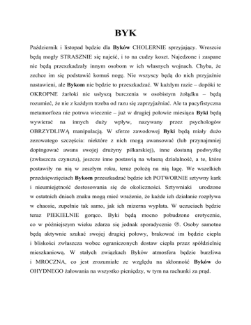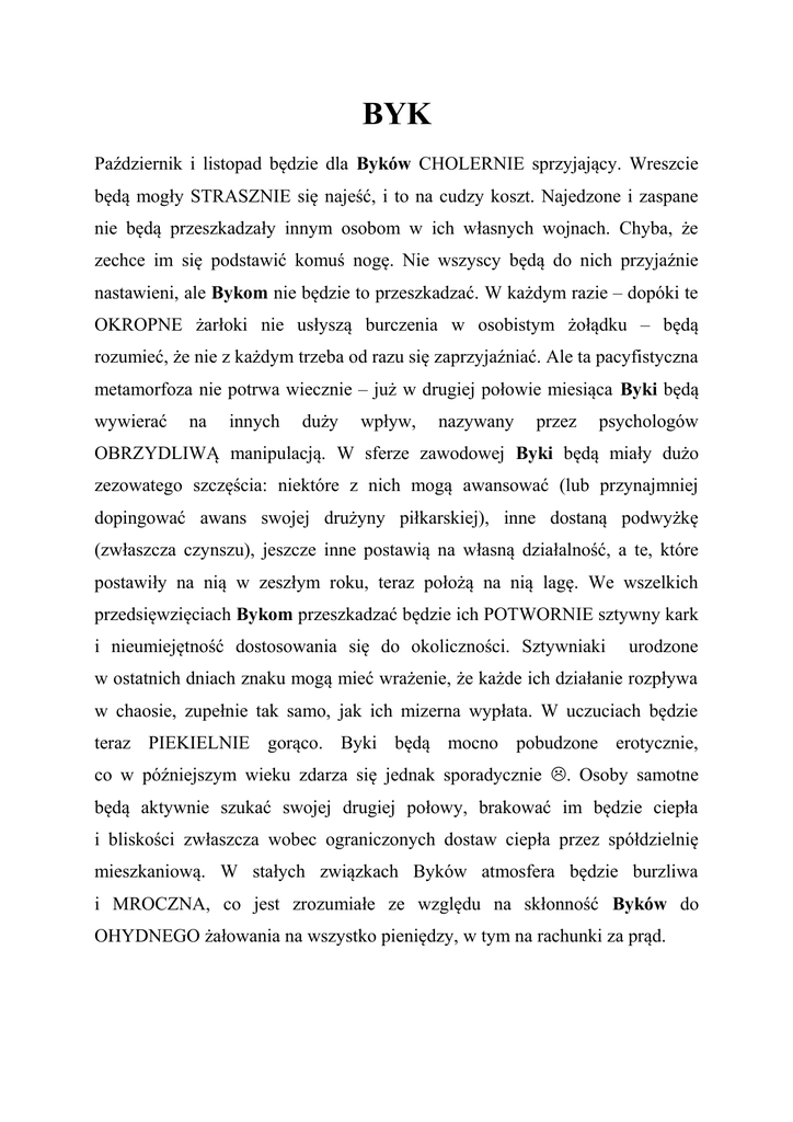 BYK Październik i listopad będzie dla Byków CHOLERNIE sprzyjający. Wreszcie będą mogły STRASZNIE się najeść, i to na cudzy koszt. Najedzone i zaspane nie będą przeszkadzały innym osobom w ich własnych wojnach. Chyba, że zechce im się podstawić komuś nogę. Nie wszyscy będą do nich przyjaźnie nastawieni, ale Bykom nie będzie to przeszkadzać. W każdym razie – dopóki te OKROPNE żarłoki nie usłyszą burczenia w osobistym żołądku – będą rozumieć, że nie z każdym trzeba od razu się zaprzyjaźniać. Ale ta pacyfistyczna metamorfoza nie potrwa wiecznie – już w drugiej połowie miesiąca Byki będą wywierać na innych duży wpływ, nazywany przez psychologów OBRZYDLIWĄ manipulacją. W sferze zawodowej Byki będą miały dużo zezowatego szczęścia: niektóre z nich mogą awansować (lub przynajmniej dopingować awans swojej drużyny piłkarskiej), inne dostaną podwyżkę (zwłaszcza czynszu), jeszcze inne postawią na własną działalność, a te, które postawiły na nią w zeszłym roku, teraz położą na nią lagę. We wszelkich przedsięwzięciach Bykom przeszkadzać będzie ich POTWORNIE sztywny kark i nieumiejętność dostosowania się do okoliczności. Sztywniaki urodzone w ostatnich dniach znaku mogą mieć wrażenie, że każde ich działanie rozpływa w chaosie, zupełnie tak samo, jak ich mizerna wypłata. W uczuciach będzie teraz PIEKIELNIE gorąco. Byki będą mocno pobudzone erotycznie, co w późniejszym wieku zdarza się jednak sporadycznie . Osoby samotne będą aktywnie szukać swojej drugiej połowy, brakować im będzie ciepła i bliskości zwłaszcza wobec ograniczonych dostaw ciepła przez spółdzielnię mieszkaniową. W stałych związkach Byków atmosfera będzie burzliwa i MROCZNA, co jest zrozumiałe ze względu na skłonność Byków do OHYDNEGO żałowania na wszystko pieniędzy, w tym na rachunki za prąd.
