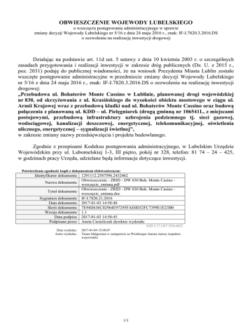 OBWIESZCZENIE WOJEWODY LUBELSKIEGO o wszczęciu postępowania administracyjnego w sprawie zmiany decyzji Wojewody Lubelskiego nr 5/16 z dnia 24 maja 2016 r., znak: IF-I.7820.3.2016.DS o zezwoleniu na realizację inwestycji drogowej: Działając na podstawie art. 11d ust. 5 ustawy z dnia 10 kwietnia 2003 r. o szczególnych zasadach przygotowania i realizacji inwestycji w zakresie dróg publicznych (Dz. U. z 2015 r., poz. 2031) podaję do publicznej wiadomości, że na wniosek Prezydenta Miasta Lublin zostało wszczęte postępowanie administracyjne w przedmiocie zmiany decyzji Wojewody Lubelskiego nr 5/16 z dnia 24 maja 2016 r., znak: IF-I.7820.3.2016.DS o zezwoleniu na realizację inwestycji drogowej: „Przebudowa ul. Bohaterów Monte Cassino w Lublinie, planowanej drogi wojewódzkiej nr 830, od skrzyżowania z ul. Krasińskiego do wysokości obiektu mostowego w ciągu ul. Armii Krajowej wraz z przebudową kładki nad ul. Bohaterów Monte Cassino oraz budową połączenia z planowaną ul. KDD – ul. Pielęgniarek (drogą gminną nr 106541L, z miejscami postojowymi, przebudową infrastruktury uzbrojenia podziemnego tj. sieci gazowej, wodociągowej, kanalizacji deszczowej, energetycznej, telekomunikacyjnej, oświetlenia ulicznego, energetycznej – sygnalizacji świetlnej”, w zakresie zmiany nazwy przedsięwzięcia i projektu budowlanego. Zgodnie z przepisami Kodeksu postępowania administracyjnego, w Lubelskim Urzędzie Wojewódzkim przy ul. Lubomelskiej 1-3, III piętro, pokój nr 328, telefon: 81 74 – 24 – 425, w godzinach pracy Urzędu, udzielane będą informacje dotyczące inwestycji. Potwierdzam zgodność kopii z dokumentem elektronicznym: Identyfikator dokumentu Nazwa dokumentu Tytuł dokumentu Sygnatura dokumentu Data dokumentu Skrót dokumentu Wersja dokumentu Data podpisu Podpisane przez Data wydruku: Autor wydruku: 1291112.2587596.2432462 Obwieszczenie - ZRID - DW 830 Boh. Monte Casino wszczęcie_zmiana.pdf Obwieszczenie - ZRID - DW 830 Boh. Monte Casino wszczęcie_zmiana.doc IF-I.7820.21.2016 2017-01-03 14:58:48 7E94D636C02964E97295FAE0D32FC7399E1E23B0 1.1 2017-01-03 14:58:45 Aneta Ciesielczuk dyrektor wydziału EZD 3.17.1457.1936.6022 2017-01-04 15:08:07 Tatara Małgorzata w zastępstwie za Weinberger Joanna starszy inspektor wojewódzki 1/1