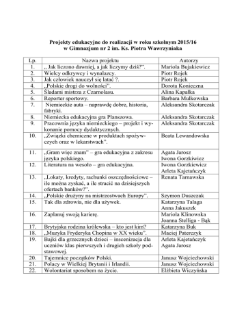 Projekty edukacyjne do realizacji w roku szkolnym 2015/16 w Gimnazjum nr 2 im. Ks. Piotra Wawrzyniaka Lp. 1. 2. 3. 4. 5. 6. 7. 8. 9. 10. 11. 12. Nazwa projektu „ Jak liczono dawniej, a jak liczymy dziś?”. Wielcy odkrywcy i wynalazcy. Jak człowiek nauczył się latać ?. „Polskie drogi do wolności”. Śladami mistrza z Czarnolasu. Reporter sportowy. Niemieckie auta – naprawdę dobre, historia, fabryki. Niemiecka edukacyjna gra Planszowa. Pracownia języka niemieckiego – projekt i wykonanie pomocy dydaktycznych. „Związki chemiczne w produktach spożywczych oraz w lekarstwach”. Autorzy Mariola Bujakiewicz Piotr Rojek Piotr Rojek Dorota Konieczna Alina Kapałka Barbara Mulkowska Aleksandra Skotarczak „Gram więc znam” – gra edukacyjna z zakresu języka polskiego. Literatura na wesoło – gra edukacyjna. Agata Jarosz Iwona Gorzkiwicz Iwona Gorzkiewicz Arleta Kajetańczyk Renata Tarnawska 14. 15. „Lokaty, kredyty, rachunki oszczędnościowe – ile można zyskać, a ile stracić na dzisiejszych ofertach banków?”. „Polskie drużyny na mistrzostwach Europy”. Tak dla zdrowia, nie dla używek. 16. Zaplanuj swoją karierę. 17. 18. 19. Brytyjska rodzina królewska – kto jest kim? „Muzyka Fryderyka Chopina w XX wieku”. Bajki dla grzecznych dzieci – inscenizacja dla uczniów klas pierwszych i drugich szkoły podstawowej. Tajemnice początków Polski. Polacy w Wielkiej Brytanii i Irlandii. Wolontariat sposobem na życie. 13. 20. 21. 22. Aleksandra Skotarczak Aleksandra Skotarczak Beata Lewandowska Szymon Duszczak Katarzyna Talaga Anna Jakuszek Mariola Klinowska Joanna Stelliga - Bąk Katarzyna Buk Maciej Paterczyk Arleta Kajetańczyk Agata Jarosz Janusz Wojciechowski Janusz Wojciechowski Elżbieta Wiczyńska