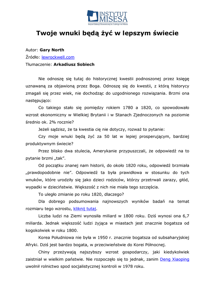 Twoje wnuki będą żyć w lepszym świecie Autor: Gary North Źródło: lewrockwell.com Tłumaczenie: Arkadiusz Sobiech Nie odnoszę się tutaj do historycznej kwestii podnoszonej przez księgę uznawaną za objawioną przez Boga. Odnoszę się do kwestii, z którą historycy zmagali się przez wiek, nie dochodząc do uzgodnionego rozwiązania. Brzmi ona następująco: Co takiego stało się pomiędzy rokiem 1780 a 1820, co spowodowało wzrost ekonomiczny w Wielkiej Brytanii i w Stanach Zjednoczonych na poziomie średnio ok. 2% rocznie? Jeżeli sądzisz, że ta kwestia cię nie dotyczy, rozważ to pytanie: Czy moje wnuki będą żyć za 50 lat w lepiej prosperującym, bardziej produktywnym świecie? Przez blisko dwa stulecia, Amerykanie przypuszczali, że odpowiedź na to pytanie brzmi „tak”. Od początku znanej nam historii, do około 1820 roku, odpowiedź brzmiała „prawdopodobnie nie”. Odpowiedź ta była prawidłowa w stosunku do tych wnuków, które urodziły się jako dzieci rodziców, którzy przetrwali zarazy, głód, wypadki w dzieciństwie. Większość z nich nie miała tego szczęścia. To uległo zmianie po roku 1820, dlaczego? Dla dobrego podsumowania najnowszych wyników badań na temat rozmiaru tego wzrostu, kliknij tutaj. Liczba ludzi na Ziemi wynosiła miliard w 1800 roku. Dziś wynosi ona 6,7 miliarda. Jednak większość ludzi żyjąca w miastach jest znacznie bogatsza od kogokolwiek w roku 1800. Korea Południowa nie była w 1950 r. znacznie bogatsza od subsaharyjskiej Afryki. Dziś jest bardzo bogata, w przeciwieństwie do Korei Północnej. Chiny przeżywają najszybszy wzrost gospodarczy, jaki kiedykolwiek zaistniał w wielkim państwie. Nie rozpoczęło się to jednak, zanim Deng Xiaoping uwolnił rolnictwo spod socjalistycznej kontroli w 1978 roku. Era Burżuazji Historycy gospodarki przedstawiali wiele wyjaśnień tej przemiany, wszystkie one jednak zostały zakwestionowane przez historyka gospodarki Dierdre McCloskey, która rozpoczęła badania nad tą kwestią jeszcze jako Donald McCloskey trzy dekady wcześniej. W sześciotomowej pracy, The Bourgeois Era („Era burżuazji”), McCloskey wyjaśnia tę kwestię w szczegółach. Dwa tomy są już dostępne. Przedstawiły one problem. W tomie drugim, Bourgeois Dignity (Burżuazyjna godność), McCloskey odrzuca dominujące wyjaśnienia jedno po drugim. Co więc wywołało te przemiany? Teoria McCloskey, jak dotąd niepotwierdzona, brzmi: wywołała je zmiana w podejściu do uzasadnienia bogactwa. Rozpoczęło się to w XVII wieku w Holandii (McCloskey mówi po niderlandzku) i następnie przeniknęło do Szkocji i Anglii. Jestem przychylny tej tezie. Wierzyłem w nią przez ostatnie 25 lat. Ale jest jeden problem. Co skłoniło ludzi do zmiany z dawna utrwalonych poglądów? W XVII wieku były to społeczności kalwińskie. Co zmieniło się w teologii kalwińskiej na wiek po Kalwinie? XVII-wieczne wyznania wiary nie zmieniły teologii. Kanony z Dort (1619) i konfesja westminsterska (1643-1647) nie zmieniły kalwinizmu. Co było więc czynnikiem kluczowym? Mam co do tego propozycję: ich koncepcja natury Królestwa Bożego na Ziemi. Nastąpiła zmiana na to, co dzisiaj zwane jest postmilenializmem — wiarą, że sąd ostateczny nadejdzie dopiero po nastaniu Królestwa Bożego na Ziemi. Transformacja ta obejmuje liczne błogosławieństwa (Pwt: 28:1-15), także w odniesieniu do gospodarki. Nie głosili tego luteranie, ani XVI-wieczni kalwiniści. Teolodzy postmilenialni żyli zarówno w Holandii, jak i w Szkocji. Lecz wyzwaniem dla badań McCloskey będzie sprawdzenie, czy rzekoma zmiana w podejściu do bogactwa pochodzącego z przedsiębiorczości była związana z tą zmianą w eschatologii. Jeżeli nie było związku, to gdzie należy szukać przyczyny? Bogactwo Narodów (1776) Adama Smitha opiewało dobrobyt. Smith był Szkotem i liberalnym prezbiterianinem. Jednak McCloskey uważa, że zmiana w myśleniu o bogactwie wyprzedzała Smitha o 150 lat. Dowód na to ma być przedstawiony w tomie trzecim. Czekam z wielką niecierpliwością. McCloskey została redaktorem amerykańskiego czasopisma naukowego „The Journal of Economic History” wiosną 1982 r. 15 lat wcześniej redaktorem tego pisma był mój profesor Hugh Aitken. Pamiętam wieczór, w trakcie którego odbyło się seminarium magisterskie, prawdopodobnie w 1966 r., kiedy Aitken zadał to najważniejsze pytanie. Jak dokonała się ta przemiana? Odpowiedział, że uczeni nie mają pojęcia. Wedle mojej wiedzy, nadal nic się nie zmieniło. Wielka dywergencja Harvardzki historyk Niall Ferguson określił wielką przemianę Zachodu mianem wielkiej dywergencji (great divergence). W państwach azjatyckich bogactwo przypadające na jednego mieszkańca w roku 1800 było niemal takie samo jak w państwach Zachodu. Do roku 1900 obie społeczności znacznie się pod tym względem różniły. Trwało to według niego do 1970 roku. W powyższym filmie Ferguson przypisuje to sześciu czynnikom: 1. konkurencji (tak politycznej jak i ekonomicznej) 2. rewolucji naukowej 3. prawom własności (nie demokracji) 4. współczesnej medycynie 5. społeczeństwu konsumenckiemu 6. zachodniej etyce pracy Nie wierzę w żaden z tych czynników, a to dlatego, że przeczytałem dwukrotnie dwa tomy autorstwa McCloskey. McCloskey obala wszystkie te argumenty, a także masę innych. Późnośredniowieczny świat znał konkurencję polityczną. Był wysoce zdecentralizowany. Znał także konkurencję rynków. Starannie zdefiniował prawa własności. Rewolucja naukowa nie wywarła niemal żadnego wpływu na Zachód do roku 1900. Zmiany, które dokonały się przed rokiem 1900, wiązały się z technologią, która nie opierała się na metodzie naukowej. Pierwsze poważne zastosowanie metody naukowej w produkcji dokonało się w niemieckim przemyśle chemicznym pod koniec wieku XIX. Wcześniejszy rozwój technologii był dziełem niezależnych rzemieślników i wynalazcó