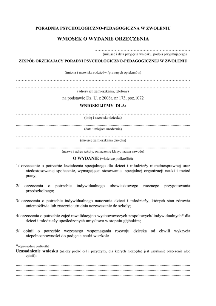 PORADNIA PSYCHOLOGICZNO-PEDAGOGICZNA W ZWOLENIU WNIOSEK O WYDANIE ORZECZENIA ………………………………………………………… (miejsce i data przyjęcia wniosku, podpis przyjmującego) ZESPÓŁ ORZEKAJĄCY PORADNI PSYCHOLOGICZNO-PEDAGOGICZNEJ W ZWOLENIU ………………………………………………………………………………………………………… (imiona i nazwiska rodziców /prawnych opiekunów) ………………………………………………………………………………………………………… ………………………………………………………………………………………………………… (adresy ich zamieszkania, telefony) na podstawie Dz. U. z 2008r. nr 173, poz.1072 WNIOSKUJEMY DLA: ………………………………………………………………………………………………………… (imię i nazwisko dziecka) ................................................................................................................................................................ (data i miejsce urodzenia) ………………………………………………………………………………………………………… (miejsce zamieszkania dziecka) ................................................................................................................................................................ (nazwa i adres szkoły, oznaczenie klasy; nazwa zawodu) O WYDANIE (właściwe podkreślić): 1/ orzeczenie o potrzebie kształcenia specjalnego dla dzieci i młodzieży niepełnosprawnej oraz niedostosowanej społecznie, wymagającej stosowania specjalnej organizacji nauki i metod pracy; 2/ orzeczenia o potrzebie przedszkolnego; indywidualnego obowiązkowego rocznego przygotowania 3/ orzeczenia o potrzebie indywidualnego nauczania dzieci i młodzieży, których stan zdrowia uniemożliwia lub znacznie utrudnia uczęszczanie do szkoły; 4/ orzeczenia o potrzebie zajęć rewalidacyjno-wychowawczych zespołowych/ indywidualnych* dla dzieci i młodzieży upośledzonych umysłowo w stopniu głębokim; 5/ opinii o potrzebie wczesnego wspomagania rozwoju dziecka od chwili wykrycia niepełnosprawności do podjęcia nauki w szkole. *odpowiednie podkreślić Uzasadnienie wniosku (należy podać cel i przyczyny, dla których niezbędne jest uzyskanie orzeczenia albo opinii): ................................................................................................................................................................ ................................................................................................................................................................ ................................................................................................................................................................ ................................................................................................................................................................ ................................................................................................................................................................ ................................................................................................................................................................ ................................................................................................................................................................ ................................................................................................................................................................ ................................................................................................................................................................ ………………………………… (data wystawienia wniosku) …………………………………… (podpis wnioskodawców) W załączeniu dokumentacja uzasadniająca wniosek (właściwe podkreślić): 1. Zaświadczenie lekarskie o stanie zdrowia dziecka w przypadku wnioskowania o indywidualne nauczania; 2. W przypadku ucznia szkoły prowadzącej kształcenie w zawodzie zaświadczenie określające możliwość dalszej realizacji nauki zawodu, wydane przez lekarza medycyny pracy; 3. Karta informacyjna leczenia szpitalnego; 4. Wyniki badań psychologicznych/ pedagogicznych /logopedycznych/ innych (jeśli były wykonywane w innej niż tutejsza placówce); 5. Opinia wychowawcy klasy; 6. Opinia nauczyciela uczącego; 7. Opinia pedagoga/ psychologa zatrudnionego w szkole; 8. Inne informacje. Wyrażam zgodę na przetwarzanie danych osobowych moich i mojego dziecka, wyłącznie w celu udzielenia pomocy psychologiczno-pedagogicznej, zgodnie z przepisami ustawy z 29 sierpnia 1997r. o ochronie danych osobowych (tekst jednolity Dz. U. z 2002r. nr 101, poz. 926 z późniejszymi zmianami). …………………………….. (data) …………………………………… (podpis wnioskodawców)