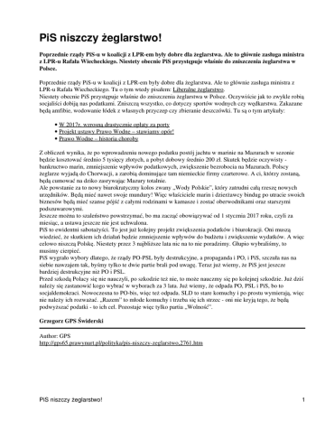 PiS niszczy żeglarstwo! Poprzednie rządy PiS-u w koalicji z LPR-em były dobre dla żeglarstwa. Ale to głównie zasługa ministra z LPR-u Rafała Wiecheckiego. Niestety obecnie PiS przystępuje właśnie do zniszczenia żeglarstwa w Polsce. Poprzednie rządy PiS-u w koalicji z LPR-em były dobre dla żeglarstwa. Ale to głównie zasługa ministra z LPR-u Rafała Wiecheckiego. Tu o tym wtedy pisałem: Liberalne żeglarstwo. Niestety obecnie PiS przystępuje właśnie do zniszczenia żeglarstwa w Polsce. Oczywiście jak to zwykle robią socjaliści dobiją nas podatkami. Zniszczą wszystko, co dotyczy sportów wodnych czy wędkarstwa. Zakazane będą amfibie, wodowanie łódek z własnych przyczep czy zbieranie deszczówki. Tu są o tym artykuły: • W 2017r. wzrosną drastycznie opłaty za porty • Projekt ustawy Prawo Wodne – stawiamy opór! • Prawo Wodne – historia choroby Z obliczeń wynika, że po wprowadzeniu nowego podatku postój jachtu w marinie na Mazurach w sezonie będzie kosztować średnio 5 tysięcy złotych, a pobyt dobowy średnio 200 zł. Skutek będzie oczywisty bankructwo marin, zmniejszenie wpływów podatkowych, zwiększenie bezrobocia na Mazurach. Polscy żeglarze wyjadą do Chorwacji, a zarobią dominujące tam niemieckie firmy czarterowe. A ci, którzy zostaną, będą cumować na dziko zasrywając Mazury totalnie. Ale powstanie za to nowy biurokratyczny kolos zwany „Wody Polskie”, który zatrudni całą rzeszę nowych urzędników. Będą mieć nawet swoje mundury! Więc właściciele marin i dzierżawcy bindug po utracie swoich biznesów będą mieć szanse pójść z całymi rodzinami w kamasze i zostać oberwodnikami oraz starszymi podszuwarowymi. Jeszcze można to szaleństwo powstrzymać, bo ma zacząć obowiązywać od 1 stycznia 2017 roku, czyli za miesiąc, a ustawa jeszcze nie jest uchwalona. PiS to ewidentni sabotażyści. To jest już kolejny projekt zwiększenia podatków i biurokracji. Oni muszą wiedzieć, że skutkiem ich działań będzie zmniejszenie wpływów do budżetu i zwiększenie wydatków. A więc celowo niszczą Polskę. Niestety przez 3 najbliższe lata nic na to nie poradzimy. Głupio wybraliśmy, to musimy cierpieć. PiS wygrało wybory dlatego, że rządy PO-PSL były destrukcyjne, a propaganda i PO, i PiS, szczuła nas na siebie nawzajem tak, byśmy tylko te dwie partie brali pod uwagę. Teraz już wiemy, że PiS jest jeszcze bardziej destrukcyjne niż PO i PSL. Przed szkodą Polacy się nie nauczyli, po szkodzie też nie, to może nauczmy się po kolejnej szkodzie. Już dziś należy się zastanowić kogo wybrać w wyborach za 3 lata. Już wiemy, że odpada PO, PSL i PiS, bo to socjaldemokraci. Nowoczesna to PO-bis, więc też odpada. SLD to stare komuchy i po prostu wymierają, więc nie należy ich rozważać. „Razem” to młode komuchy i trzeba się ich strzec - oni nie kryją tego, że będą podwyższać podatki - to ich cel. Pozostaje więc tylko partia „Wolność”. Grzegorz GPS Świderski Author: GPS http://gps65.prawynurt.pl/polityka/pis-niszczy-zeglarstwo,2761.htm PiS niszczy żeglarstwo! 1
