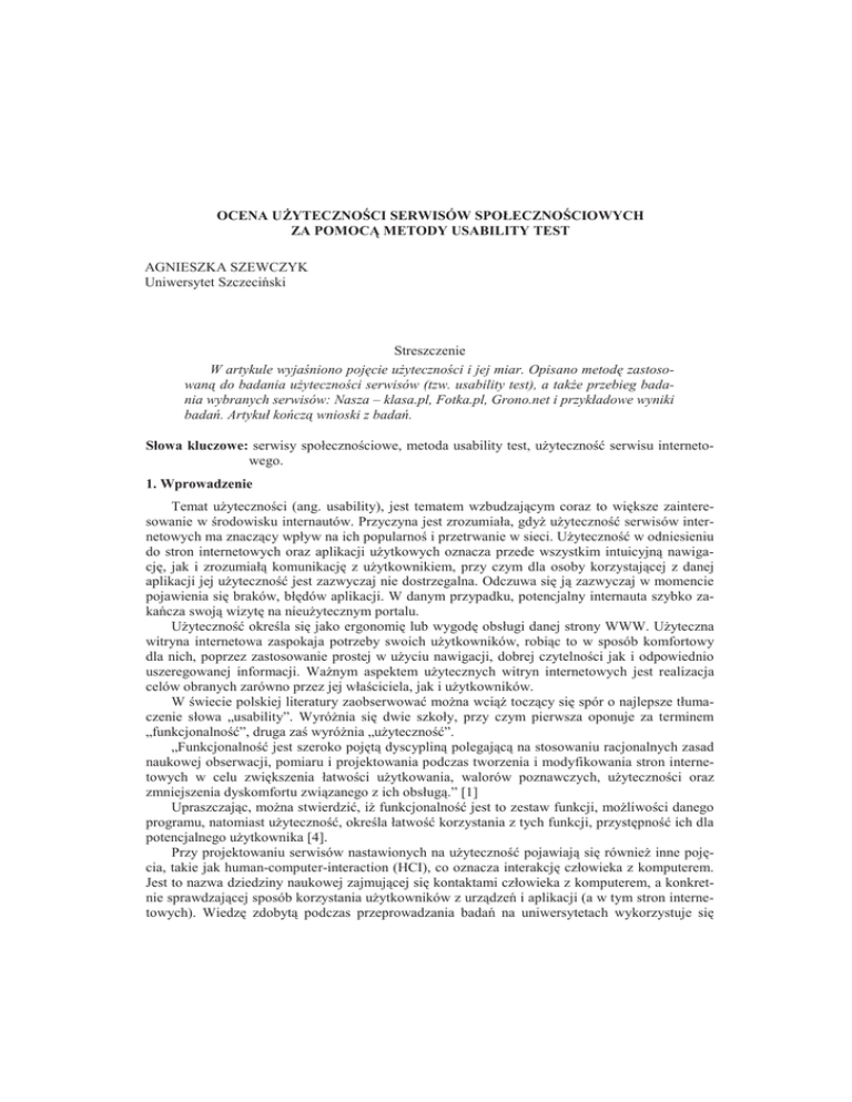 OCENA U YTECZNOCI SERWISÓW SPOŁECZNOCIOWYCH ZA POMOC METODY USABILITY TEST AGNIESZKA SZEWCZYK Uniwersytet Szczeciski Streszczenie W artykule wyjaĞniono pojĊcie uĪytecznoĞci i jej miar. Opisano metodĊ zastosowaną do badania uĪytecznoĞci serwisów (tzw. usability test), a takĪe przebieg badania wybranych serwisów: Nasza – klasa.pl, Fotka.pl, Grono.net i przykładowe wyniki badaĔ. Artykuł koĔczą wnioski z badaĔ. Słowa kluczowe: serwisy społecznociowe, metoda usability test, uyteczno serwisu internetowego. 1. Wprowadzenie Temat uytecznoci (ang. usability), jest tematem wzbudzajcym coraz to wiksze zainteresowanie w rodowisku internautów. Przyczyna jest zrozumiała, gdy uyteczno serwisów internetowych ma znaczcy wpływ na ich popularno i przetrwanie w sieci. Uyteczno w odniesieniu do stron internetowych oraz aplikacji uytkowych oznacza przede wszystkim intuicyjn nawigacj, jak i zrozumiał komunikacj z uytkownikiem, przy czym dla osoby korzystajcej z danej aplikacji jej uyteczno jest zazwyczaj nie dostrzegalna. Odczuwa si j zazwyczaj w momencie pojawienia si braków, błdów aplikacji. W danym przypadku, potencjalny internauta szybko zakacza swoj wizyt na nieuytecznym portalu. Uyteczno okrela si jako ergonomi lub wygod obsługi danej strony WWW. Uyteczna witryna internetowa zaspokaja potrzeby swoich uytkowników, robic to w sposób komfortowy dla nich, poprzez zastosowanie prostej w uyciu nawigacji, dobrej czytelnoci jak i odpowiednio uszeregowanej informacji. Wanym aspektem uytecznych witryn internetowych jest realizacja celów obranych zarówno przez jej właciciela, jak i uytkowników. W wiecie polskiej literatury zaobserwowa mona wci toczcy si spór o najlepsze tłumaczenie słowa „usability”. Wyrónia si dwie szkoły, przy czym pierwsza oponuje za terminem „funkcjonalno”, druga za wyrónia „uyteczno”. „Funkcjonalno jest szeroko pojt dyscyplin polegajc na stosowaniu racjonalnych zasad naukowej obserwacji, pomiaru i projektowania podczas tworzenia i modyfikowania stron internetowych w celu zwikszenia łatwoci uytkowania, walorów poznawczych, uytecznoci oraz zmniejszenia dyskomfortu zwizanego z ich obsług.” [1] Upraszczajc, mona stwierdzi, i funkcjonalno jest to zestaw funkcji, moliwoci danego programu, natomiast uyteczno, okrela łatwo korzystania z tych funkcji, przystpno ich dla potencjalnego uytkownika [4]. Przy projektowaniu serwisów nastawionych na uyteczno pojawiaj si równie inne pojcia, takie jak human-computer-interaction (HCI), co oznacza interakcj człowieka z komputerem. Jest to nazwa dziedziny naukowej zajmujcej si kontaktami człowieka z komputerem, a konkretnie sprawdzajcej sposób korzystania uytkowników z urzdze i aplikacji (a w tym stron internetowych). Wiedz zdobyt podczas przeprowadzania bada na uniwersytetach wykorzystuje si 156 POLSKIE STOWARZYSZENIE ZARZĄDZANIA WIEDZĄ Seria: Studia i Materiały, nr 32, 2010 podczas ulepszania uytecznoci zwykłych serwisów internetowych [1]. HCI dotyczy równie zagadnie zwizanych z graficznym interfejsem uytkownika (GUI, ang. Graphic User Interface), funkcjonalnoci parametrów oprogramowania, jak i logik, oraz sposobem w jaki uytkownicy wykorzystuj urzdzenia wejcia i wyjcia. Inna dziedzina – HCI – jest zwizana ze szczególnymi przyzwyczajeniami, na których skutki człowiek jest naraony w zwizku z uytkowaniem komputerów. Jest to dziedzina zwana ergonomi. Uczy ona poszczególnych uytkowników jak unika przyzwyczaje o negatywnym charakterze [4]. 2. Miary uytecznoci Uyteczno jest miar jakoci dowiadczenia uytkowników, gdy chodzi o produkt, system, bd te stron internetow, aplikacj internetow, technologie mobilne, czy te inne urzdzenia operowane przez uytkowników. Istotnym elementem bada nad uytecznoci jest uwiadomienie sobie faktu, i nie s to pojedyncze, jedno wymiarowe właciwoci, cechy interfejsu uytkownika. Uyteczno jest kombinacj współczynników, wród których mona wyróni: • łatwo uczenia si – stwierdza jak szybko uytkownik, który nie miał nigdy stycznoci z dan aplikacj jest w stanie si jej nauczy, w celu wykonania podstawowych zada; • wydajno – okrela czas w jakim uytkownik zaznajomiony z danym systemem jest w stanie wykona powierzone mu zadanie; • łatwo zapamitania – okrela moliwo zapamitywania funkcji aplikacji, gdy uytkownik miał ju kontakt z aplikacj, to czy bdzie w stanie efektywnie z niej skorzysta nastpnym razem, czy niezbdna bdzie ponowna nauka od podstaw; • błdy – okrela czstotliwo wystpowania błdów podczas uytkowania systemu, aplikacji, definiuje powag tych błdów, oraz sposoby radzenia sobie z nimi przez potencjalnych uytkowników; • subiektywna satysfakcja – definiuje stopie zadowolenia uytkownika podczas uytkowania danego systemu [3]. Natomiast wród zasadniczych braków uytecznoci w serwisach internetowych wyrónia si: • Złamanie pierwszego prawa UCD – poznaj swojego uytkownika. Twórcy witryn internetowych bardzo czsto skupiaj si jedynie na aspektach technicznych projektowanej witryny, czsto przesycajc powstajcy projekt nowinkami, pomysłami, które mog si okaza nie atrakcyjne, bd utrudniajce dotarcie do celu uytkownikowi. • Specjalistyczne podejcie projektantów stron. S oni zazwyczaj ekspertami w dziedzinie programowania, co czsto doprowadza do niecisłoci na poziomie uytkowników. Zasady przyjmowane przez projektantów nie sprawdzaj si w rodowisku uytkowników stron. • Uycie nowszej technologii kosztem uytecznoci stron. Czsto stosowane w celu zwikszenia atrakcyjnoci serwisu przynosi przeciwny efekt, uytkownicy wybieraj serwisy mniej atrakcyjne, lecz łatwe w obsłudze [4]. Wród mierzalnych elementów strony internetowej wymagajcych poprawy mona wyróni: • nawigacj – wane jest skrócenie czasu dotarcia do szukanej informacji, oraz jak najmniejsza liczba kroków (klikni) niezbdnych do osignicia celu; • teksty – bez zbdnych słów, krótkie, zwizłe; Agnieszka Szewczyk Ocena uĪytecznoĞci serwisów społecznoĞciowych 