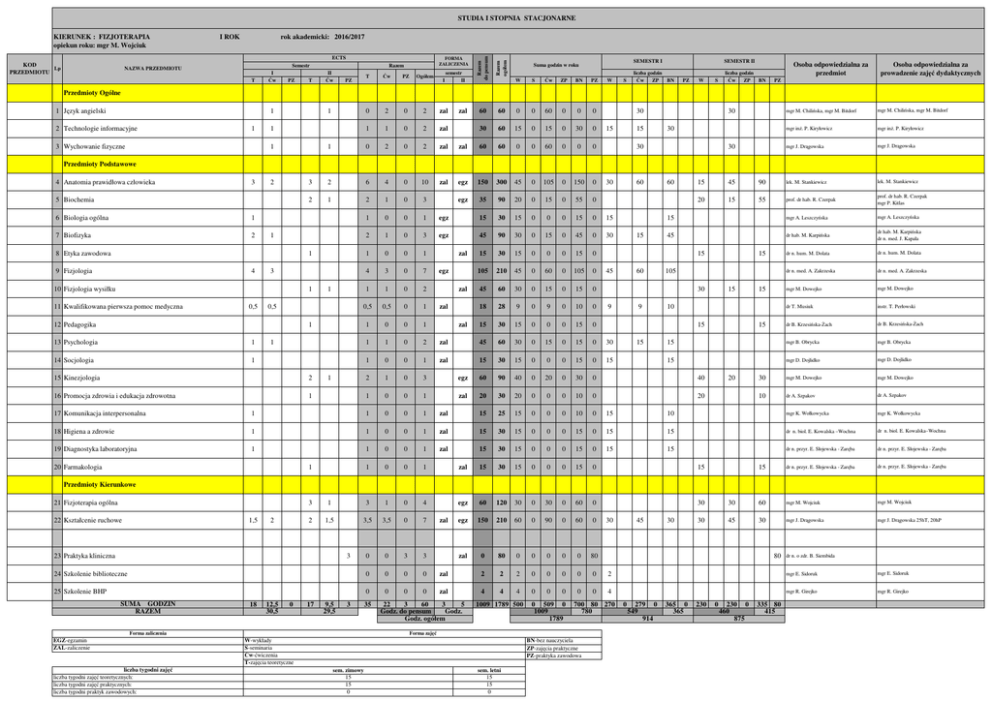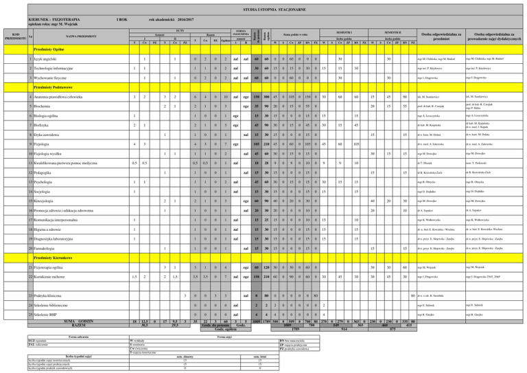 STUDIA I STOPNIA STACJONARNE rok akademicki: 2016/2017 ECTS KOD Lp PRZEDMIOTU Semestr NAZWA PRZEDMIOTU T I Ćw PZ 60 60 0 0 60 0 0 0 30 60 15 0 15 0 30 0 zal 60 60 0 0 60 0 0 0 egz 150 300 45 0 105 0 150 0 egz 35 90 20 0 15 0 55 0 egz 15 30 15 0 0 0 15 0 15 egz 45 90 30 0 15 0 45 0 30 15 30 15 0 0 0 15 0 105 210 45 0 60 0 105 0 45 60 30 0 15 0 15 0 18 28 9 0 9 0 10 0 15 30 15 0 0 0 15 0 zal 45 60 30 0 15 0 15 0 30 zal 15 30 15 0 0 0 15 0 15 egz 60 90 40 0 20 0 30 0 40 zal 20 30 20 0 0 0 10 0 20 FORMA ZALICZENIA Razem II Ćw Razem ogółem I ROK Razem do pensum KIERUNEK : FIZJOTERAPIA opiekun roku: mgr M. Wojciuk semestr I II T Ćw PZ Ogółem 0 2 0 2 zal 1 1 0 2 zal 1 0 2 0 2 zal 3 2 6 4 0 10 zal 2 1 2 1 0 3 1 0 0 1 2 1 0 3 1 0 0 1 4 3 0 7 1 1 0 2 0,5 0,5 0 1 1 0 0 1 1 1 0 2 1 0 0 1 2 1 0 3 1 0 0 1 T PZ SEMESTR I Suma godzin w roku W S Ćw ZP BN PZ W S SEMESTR II liczba godzin Ćw ZP BN PZ W S liczba godzin Ćw ZP BN Osoba odpowiedzialna za przedmiot Osoba odpowiedzialna za prowadzenie zajęć dydaktycznych PZ Przedmioty Ogólne 1 Język angielski 1 2 Technologie informacyjne 1 3 Wychowanie fizyczne 1 1 1 zal 30 15 15 30 30 30 30 mgr M. Chilińska, mgr M. Bitdorf mgr M. Chilińska, mgr M. Bitdorf mgr inż. P. Kiryłowicz mgr inż. P. Kiryłowicz mgr J. Drągowska mgr J. Drągowska Przedmioty Podstawowe 4 Anatomia prawidłowa człowieka 3 2 5 Biochemia 6 Biologia ogólna 1 7 Biofizyka 2 1 8 Etyka zawodowa 1 9 Fizjologia 4 3 10 Fizjologia wysiłku 1 11 Kwalifikowana pierwsza pomoc medyczna 0,5 1 0,5 12 Pedagogika 1 13 Psychologia 1 14 Socjologia 1 1 15 Kinezjologia 2 16 Promocja zdrowia i edukacja zdrowotna 1 1 zal egz zal zal zal 30 60 15 60 15 45 90 lek. M. Stankiewicz lek. M. Stankiewicz 20 15 55 prof. dr hab. R. Czerpak prof. dr hab. R. Czerpak mgr P. Kitlas 15 mgr A. Leszczyńska mgr A. Leszczyńska 45 dr hab. M. Karpińska dr hab. M. Karpińska dr n. med. J. Kapała dr n. hum. M. Dolata dr n. hum. M. Dolata dr n. med. A. Zakrzeska dr n. med. A. Zakrzeska mgr M. Dowejko mgr M. Dowejko dr T. Musiuk instr. T. Perłowski dr B. Krzesińska-Żach dr B. Krzesińska-Żach 15 mgr B. Obrycka mgr B. Obrycka 15 mgr D. Dojlidko mgr D. Dojlidko 30 mgr M. Dowejko mgr M. Dowejko 10 dr A. Szpakov dr A. Szpakov 15 45 60 15 105 30 9 9 15 10 15 15 15 15 20 17 Komunikacja interpersonalna 1 1 0 0 1 zal 15 25 15 0 0 0 10 0 15 10 mgr K. Wołkowycka mgr K. Wołkowycka 18 Higiena a zdrowie 1 1 0 0 1 zal 15 30 15 0 0 0 15 0 15 15 dr n. biol. E. Kowalska –Wochna dr n. biol. E. Kowalska–Wochna 19 Diagnostyka laboratoryjna 1 1 0 0 1 zal 15 30 15 0 0 0 15 0 15 15 dr n. przyr. E. Słojewska - Zaręba dr n. przyr. E. Słojewska - Zaręba 1 0 0 1 15 30 15 0 0 0 15 0 15 dr n. przyr. E. Słojewska - Zaręba dr n. przyr. E. Słojewska - Zaręba egz 60 120 30 0 30 0 60 0 egz 150 210 60 0 90 0 60 0 zal 0 80 0 0 0 0 0 80 20 Farmakologia 1 zal 15 Przedmioty Kierunkowe 21 Fizjoterapia ogólna 3 1 3 1 0 4 2 1,5 3,5 3,5 0 7 0 0 3 3 24 Szkolenie biblioteczne 0 0 0 0 zal 2 2 2 0 0 0 0 0 2 mgr E. Sidoruk mgr E. Sidoruk 25 Szkolenie BHP 0 0 0 0 zal 4 4 4 0 0 0 0 0 4 mgr R. Girejko mgr R. Girejko 22 Kształcenie ruchowe 1,5 2 23 Praktyka kliniczna 3 SUMA GODZIN RAZEM 18 12,5 30,5 0 17 9,5 29,5 3 Forma zaliczenia EGZ-egzamin ZAL-zaliczenie liczba tygodni zajęć liczba tygodni zajęć teoretycznych: liczba tygodni zajęć praktycznych: liczba tygodni praktyk zawodowych: 35 zal 22 3 60 3 5 Godz. do pensum Godz. Godz. ogółem 1009 1789 500 0 509 0 1009 1789 BN-bez nauczyciela ZP-zajęcia praktyczne PZ-praktyka zawodowa sem. zimowy 15 15 0 sem. letni 15 15 0 45 30 30 30 60 mgr M. Wojciuk mgr M. Wojciuk 30 45 30 mgr J. Drągowska mgr J. Drągowska 25hT, 20hP 80 700 80 270 780 Forma zajęć W-wykłady S-seminaria Ćw-ćwiczenia T-zajęcia teoretyczne 30 0 279 0 549 914 365 0 365 230 0 230 0 460 875 335 80 415 dr n. o zdr. B. Siembida STUDIA I STOPNIA STACJONARNE rok akademicki: 2016/2017 ECTS KOD Lp PRZEDMIOTU T III Ćw PZ T IV Ćw PZ egz 60 90 egz 45 60 30 0 15 0 15 0 15 30 15 0 0 0 15 0 FORMA ZALICZENIA Razem Semestr NAZWA PRZEDMIOTU Razem ogółem II ROK Razem do pensum KIERUNEK : FIZJOTERAPIA opiekun roku: mgr M. Wojciuk T Ćw PZ Ogółe m 0 3 0 3 semestr III IV SEMESTR III Suma godzin w roku W S Ćw ZP BN PZ 0 0 60 0 30 0 W S SEMESTR IV liczba godzin Ćw ZP BN PZ W S liczba godzin Ćw ZP BN Osoba odpowiedzialna za przedmiot Osoba odpowiedzialna za prowadzenie zajęć dydaktycznych PZ Przedmioty Ogólne 1 Język angielski 1 2 zal 30 30 30 mgr M. Chilińska, mgr M. Bitdorf mgr M. Chilińska, mgr M. Bitdorf 15 15 dr n. med. R. Santorek dr n. med. R. Santorek dr E. Arciszewska dr E. Arciszewska Przedmioty Podstawowe 2 Biomechanika 1 3 Patologia ogólna 1 1 1 1 0 2 1 0 0 1 zal 30 15 15 Przedmioty Kierunkowe 4 Fizykoterapia 1 2 2 2 3 4 0 7 zal egz 165 210 35 0 130 0 45 0 20 70 15 15 60 30 dr n. o zdr. B. Siembida dr n. o zdr. B. Siembida 5 Kinezyterapia 1 2,5 2 3 3 5,5 0 8,5 zal egz 210 255 60 0 150 0 45 0 30 75 15 30 75 30 dr J. Samusik dr J. Samusik, mgr M. Wojciuk 1 1,5 1 1,5 0 2,5 egz 60 75 15 0 45 0 15 0 15 45 15 mgr J.Drągowska mgr J.Drągowska 6 Metodyka nauczania ruchu 7 Anatomia topograficzna 0,5 1,5 0,5 1,5 0 2 zal 45 60 10 0 35 0 15 0 10 35 15 mgr E. Kamińska mgr E. Kamińska 8 Zaopatrzenie ortopedyczne 0,5 0,5 0,5 0,5 0 1 egz 20 30 12 0 8 0 10 0 12 8 10 dr n. med. R. Santorek dr n. med. R. Santorek 9 Podstawy fizjoterapii klinicznej w Neurologii 0,5 1 0,5 1 0 1,5 zal 29 44 9 0 20 0 15 0 9 20 15 dr H. Chowańska dr H. Chowańska, mgr J. Wojtkowska 10 Podstawy fizjoterapii klinicznej w Kardiologii 0,5 0,5 0,5 0,5 0 1 zal 24 29 9 0 15 0 5 0 9 15 5 dr H. Chowańska dr H. Chowańska, mgr E. Kamińska 11 Podstawy fizjoterapii klinicznej w Pediatrii 0,5 1 0,5 1 0 1,5 zal 29 44 9 0 20 0 15 0 9 20 15 dr H. Chowańska dr H. Chowańska, Vita Med. 12 Podstawy fizjoterapii klinicznej w Chirurgii 0,5 0,5 0,5 0,5 0 1 zal 24 29 9 0 15 0 5 0 9 15 5 dr H. Chowańska dr H. Chowańska, mgr E. Dąbrowa 13 Podstawy fizjoterapii klinicznej w 
