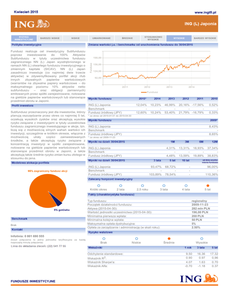 www.ingtfi.pl RYZYKO INWESTYCYJNE BARDZO NISKIE NISKIE UMIARKOWANE STOSUNKOWO WYSOKIE ŚREDNIE WYSOKIE BARDZO WYSOKIE Fundusz realizuje cel inwestycyjny Subfunduszu poprzez inwestowanie do 100% Aktywów Subfunduszu w tytuły uczestnictwa funduszu zagranicznego NN (L) Japan wyodrębnionego w ramach NN (L) otwartego funduszu inwestycyjnego o zmiennym kapitale (SICAV). NN (L) Japan zasadniczo inwestuje (co najmniej dwie trzecie aktywów) w zdywersyfikowany portfel akcji i/lub innych zbywalnych papierów wartościowych (warrantów na zbywalne papiery wartościowe – do maksymalnego poziomu 10% aktywów netto subfunduszu – oraz obligacji zamiennych) emitowanych przez spółki zarejestrowane, notowane na giełdzie papierów wartościowych lub stanowiące przedmiot obrotu w Japonii. ING (L) Japonia Benchmark Subfundusz przeznaczony jest dla inwestorów, którzy Fundusz źródłowy (JPY) planują oszczędzanie przez okres co najmniej 5 lat, * za okres od 2015-01-01 do 2015-04-30 oczekują wysokich zysków oraz akceptują wysokie ryzyko związane z inwestycjami w tytuły uczestnictwa funduszu zagranicznego inwestującego w akcje, tzn. ING (L) Japonia liczą się z możliwością silnych wahań wartości ich Benchmark inwestycji, szczególnie w krótkim okresie, włącznie z Fundusz źródłowy (JPY) możliwością utraty części zainwestowanych * za okres od 2009-11-23 środków, a także akceptują ryzyko związane z koncentracją inwestycji w spółki zarejestrowane, notowane na giełdzie papierów wartościowych lub ING (L) Japonia stanowiące przedmiot obrotu w Japonii, a także Benchmark akceptują także średnie ryzyko zmian kursu złotego w Fundusz źródłowy (JPY) stosunku do jena. 12,04% 12,60% Brak 2 lata 46,99% 53,40% 20,16% -17,56% 21,79% -16,79% 0,52% 0,33% 8,43% 8,65% 4,31% 4,48% 13,31% 13,59% 18,93% 19,89% 37,34% 38,83% od dnia uruchomienia funduszu ING (L) Japonia Benchmark Fundusz źródłowy (JPY) Krótki okres 10,23% 10,24% 93,47% 103,89% 2,5 roku 68,72% 78,54% 3 lata Typ funduszu: Początek działalności funduszu: Aktywa (2015-04-30): Wartość jednostki uczestnictwa (2015-04-30): Minimalna pierwsza wpłata: Minimalna kolejna wpłata: Maksymalna opłata dystrybucyjna: Opłata za zarządzanie i administrację (w skali roku): - 96,00% 110,36% 4 lata 5 lat regionalny 2009-11-23 282 mln PLN 196,00 PLN 200 PLN 50 PLN 5% 2.50% Infolinia: 0 801 690 555 (koszt połączenia to jedna jednostka taryfikacyjna za każdą rozpoczętą minutę połączenia) Brak Odchylenie standardowe: Wskaźnik R2 : Wskaźnik Sharpe'a: Wskaźnik Alfa: FUNDUSZE INWESTYCYJNE Niskie Średnie Wysokie 9.50 0.90 16.36 0.97 17.32 0,96 4.07 -0.70 1.63 -1.18 0.70 0.37 www.ingtfi.pl Wskaźnik Beta: Information Ratio: Tracking Error: Wskaźniki ryzyka obliczone dla funduszu źródłowego (JPY) i jego wolną od ryzyka przyjęto EURIBOR 3M. FUNDUSZE INWESTYCYJNE 0.94 0.95 0.95 -0.23 -0.38 0.10 3.00 3.11 3.75 benchmarku. Za stopę www.ingtfi.pl Toyota Motor Corp 4,39% Mitsubishi Ufj Financial Group 3,96% Nippon Telegraph & Telephone 2,85% Sumitomo Electric Ind 2,42% Mitsubishi Heavy Ind 2,18% Tokio Marine Holdings Inc 1,93% Seven & I Holdings Co Ltd 1,92% Aisin Seiki Co Ltd 1,73% Hitachi Ltd 1,68% Bridgestone Corp 1,47% Spółki sektora przemysłowego Spółki konsumenckie Spółki sektora finansowego Surowce IT Telekomunikacja Dobra codziennego użytku Spółki użyteczności publicznej Spółki sektora energii Spółki z sektora farmacji i usług medycznych 25,63% 21,61% 17,34% 11,74% 11,55% 4,49% 3,78% 1,53% 1,38% 0,95% Niniejszy materiał został przygotowany przez ING Towarzystwo Funduszy Inwestycyjnych S.A. i posiada charakter reklamowy. ING TFI posiada zezwolenie Komisji Nadzoru Finansowego na prowadzenie działalności. Podany w niniejszym dokumencie profil ryzyka funduszu jest oparty na metodologii stosowanej w Kluczowych Informacjach dla Inwestorów. Największe pozycje, alokacja sektorowa, geograficzna i walutowa - dane dotyczą funduszu źródłowego NN (L) Japan (dane na dzień 30/04/2015). Podane wskaźniki ryzyka dotyczą funduszu źródłowego NN (L) Japan (dane na dzień 30/04/2015). Przedstawione wyniki mają charakter historyczny (źródło: ING TFI) i dotyczą jednostek uczestnictwa kategorii A. ING TFI i Fundusze Inwestycyjne ING nie gwarantują osiągnięcia celów inwestycyjnych funduszy i subfunduszy ani uzyskania podobnych wyników w przyszłości. Inwestycje w Fundusze Inwestycyjne ING są obarczone ryzykiem inwestycyjnym, a Uczestnik musi liczyć się z istnieniem możliwości utraty części zainwestowanych środków. Indywidualna stopa zwrotu z inwestycji nie jest tożsama z wynikiem inwestycyjnym Funduszu i jest uzależniona od wartości jednostki uczestnictwa w momencie jej zbycia i odkupienia przez Fundusz oraz od wysokości pobranych opłat manipulacyjnych i należnych podatków. Tabele Opłat znajdują się na stronie www.ingtfi.pl. Informacje o Funduszach Inwestycyjnych ING oraz o ich ryzyku inwestycyjnym zawarte są w Prospektach Informacyjnych dostępnych w siedzibie ING TFI i na stronie www.ingtfi.pl oraz w Kluczowych Informacjach dla Inwestorów dostępnych w siedzibie ING TFI, u Dystrybutorów i na stronie www.ingtfi.pl. Wartość aktywów netto wszystkich subfunduszy ING SFIO może się cechować dużą zmiennością, ze względu na inwestowanie aktywów subfunduszy w jednostki uczestnictwa funduszy inwestycyjnych otwartych lub w tytuły uczestnictwa funduszy zagranicznych lokujących w akcje lub instrumenty dłużne o podwyższonym ryzyku. Subfundusze ING SFIO lokują wszystkie swoje aktywa w tytuły uczestnictwa funduszy zagranicznych zarządzanych przez podmiot z grupy kapitałowej ING TFI oraz w jednostki uczestnictwa funduszy inwestycyjnych otwartych zarządzanych przez ING TFI. Po rozpoczęciu działalności fundusze i subfundusze dostosowywały strukturę swojego portfela do wymagań określonych w statucie, co mogło wpłynąć na ich wynik inwestycyjny w tym okresi