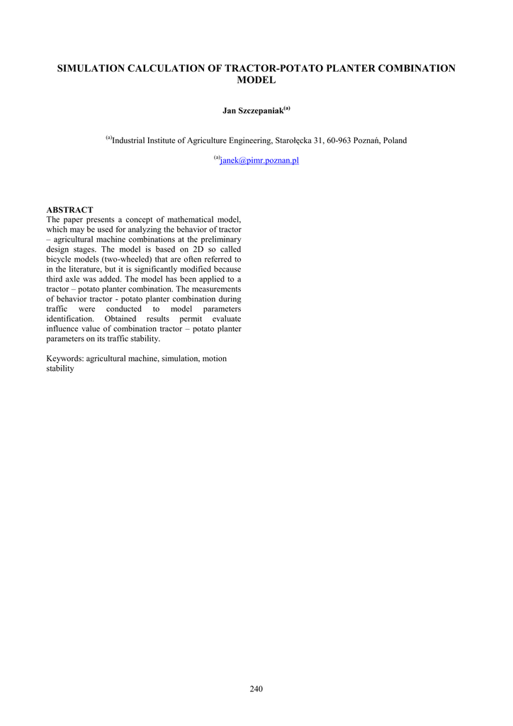 SIMULATION CALCULATION OF TRACTOR-POTATO PLANTER COMBINATION MODEL Jan Szczepaniak(a) (a) Industrial Institute of Agriculture Engineering, Starołęcka 31, 60-963 Poznań, Poland (a) [email protected] ABSTRACT The paper presents a concept of mathematical model, which may be used for analyzing the behavior of tractor – agricultural machine combinations at the preliminary design stages. The model is based on 2D so called bicycle models (two-wheeled) that are often referred to in the literature, but it is significantly modified because third axle was added. The model has been applied to a tractor – potato planter combination. The measurements of behavior tractor - potato planter combination during traffic were conducted to model parameters identification. Obtained results permit evaluate influence value of combination tractor – potato planter parameters on its traffic stability. Keywords: agricultural machine, simulation, motion stability 240 REFERENCES Börner, M., Isermann, R., 2006. Model-based detection of critical driving situations with fuzzy logic decision making. Control Engineering Practice, 14,527-536. Chatschaturov, A.A., 1976. Dinamika sistiemy dorogaszina-awtomobil-woditiel. Moscow: Mashinostroienie. Coleman, T., Branch, M. A., Grace, A., 1999: Optimization Toolbox For Use with Matlab. User Guide version 2. Natick: The Math Works Inc. Feng, L. He, Y.;2005. Study on dynamic model of tractor system for automated navigation applications. Journal of Zheijang University Science, 6A(4), 270-275. GrzegoŜek, W., 2000. Modelowanie dynamiki samochodu przy stabilizującym sterowaniu siłami hamowania. Kraków: Wydawnictwo Politechniki Krakowskiej. Harada, M., Harada, H., 1999. Analysis of lateral stability with integrated control of suspension and steering system. Society of Automotive Engineers of Japan Review, 20(4), 465-470. Karnopp, D., 2004. Vehicle Stability, New York: Marcel Dekker, Inc. 244 Lugner, P., Pacejka, H. B., Plöchl, M. 2005. Recent advances in tyre models and testing procedures. Vehicle System Dynamics, 43, 413-436. Pacejka, H. B. 2006. Tyre and Vehicle Dynamics. Amsterdam: Butterworth Heinemann. Saarilahti, M., 2002. Soil Interaction Model. Quality of Life and Management of Living Resources. Quality of Life and Management of Living Resources Contract No. QLK5-1999-00991. Available from: http://ethesis.helsinki.fi/ julkaisut/maa/mvaro/publications/31/soilinte.html [accesed 20 September 2005] Sparrer. B. 2003. TurboLab 5. User Manual. MDZ Bührer & Partner GbR. Available from: http://www.corrsys-datron.com/Support/Manuals/ c_Software/cds-m_Turbolab_Analysis_e.pdf [accessed 10 February 2008] Szczepaniak, J., 2008. Identyfikacja parametrów modelu agregatu rolniczego ciągnik – sadzarka do ziemniaków. Journal of Research and Application in Agricultural Engineering, 53(2), 16-20. Szczepaniak, J., Grzechowiak, R., 2006. Modelling of a Tractor – Potarto Planter Combination for Use in Traffic Simulation. Machine Dynamics Problems, vol. 30(4), 140-145. Ślaski, G., Mac, J., Szczepaniak, J., 2000. Komputerowa analiza obciąŜeń dynamicznych elementów zawieszenia i ramy nośnej na przykładzie wielozadaniowej naczepy rolniczej. Problemy Budowy oraz Eksploatacji Maszyn i Urządzeń Rolniczych, 2, 251-258. AUTHORS BIOGRAPHY Jan Szczepaniak received his MS (1977) and the Ph.D. (1999) in Engineering from Poznan University of Technology. He is head of Modern Method of Designing and Testing Department in Industrial Institute of Agriculture Engineering. His main research areas include agricultural engineering, modelling, simulation, signal processing and finite element modeling. During his career, Dr. Szczepaniak is author or co-author over 100 technical papers. He is also a designer of agricultural machines awarded in international fairs. For example, for device for opening the pair of side arms of the multi-segment land of roller he achieved a gold medal of The Belgian and International Trade Fair for Technological Innovation in 2007 and a silver medal of The 107th International Invention Salon “Concours – Lepine” in 2008. 245