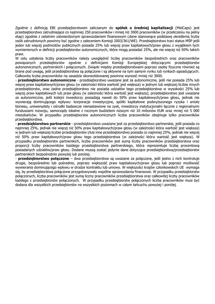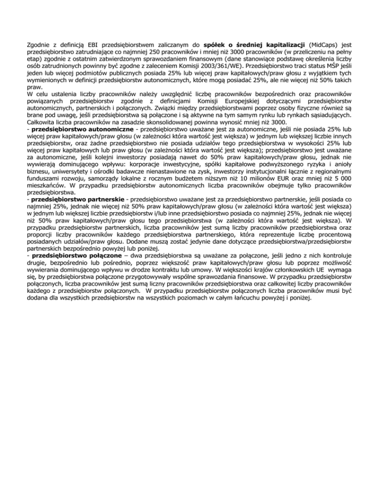 Zgodnie z definicją EBI przedsiębiorstwem zaliczanym do spółek o średniej kapitalizacji (MidCaps) jest przedsiębiorstwo zatrudniające co najmniej 250 pracowników i mniej niż 3000 pracowników (w przeliczeniu na pełny etap) zgodnie z ostatnim zatwierdzonym sprawozdaniem finansowym (dane stanowiące podstawę określenia liczby osób zatrudnionych powinny być zgodne z zaleceniem Komisji 2003/361/WE). Przedsiębiorstwo traci status MŚP jeśli jeden lub więcej podmiotów publicznych posiada 25% lub więcej praw kapitałowych/praw głosu z wyjątkiem tych wymienionych w definicji przedsiębiorstw autonomicznych, które mogą posiadać 25%, ale nie więcej niż 50% takich praw. W celu ustalenia liczby pracowników należy uwzględnić liczbę pracowników bezpośrednich oraz pracowników powiązanych przedsiębiorstw zgodnie z definicjami Komisji Europejskiej dotyczącymi przedsiębiorstw autonomicznych, partnerskich i połączonych. Związki między przedsiębiorstwami poprzez osoby fizyczne również są brane pod uwagę, jeśli przedsiębiorstwa są połączone i są aktywne na tym samym rynku lub rynkach sąsiadujących. Całkowita liczba pracowników na zasadzie skonsolidowanej powinna wynosić mniej niż 3000. - przedsiębiorstwo autonomiczne - przedsiębiorstwo uważane jest za autonomiczne, jeśli nie posiada 25% lub więcej praw kapitałowych/praw głosu (w zależności która wartość jest większa) w jednym lub większej liczbie innych przedsiębiorstw, oraz żadne przedsiębiorstwo nie posiada udziałów tego przedsiębiorstwa w wysokości 25% lub więcej praw kapitałowych lub praw głosu (w zależności która wartość jest większa); przedsiębiorstwo jest uważane za autonomiczne, jeśli kolejni inwestorzy posiadają nawet do 50% praw kapitałowych/praw głosu, jednak nie wywierają dominującego wpływu: korporacje inwestycyjne, spółki kapitałowe podwyższonego ryzyka i anioły biznesu, uniwersytety i ośrodki badawcze nienastawione na zysk, inwestorzy instytucjonalni łącznie z regionalnymi funduszami rozwoju, samorządy lokalne z rocznym budżetem niższym niż 10 milionów EUR oraz mniej niż 5 000 mieszkańców. W przypadku przedsiębiorstw autonomicznych liczba pracowników obejmuje tylko pracowników przedsiębiorstwa. - przedsiębiorstwo partnerskie - przedsiębiorstwo uważane jest za przedsiębiorstwo partnerskie, jeśli posiada co najmniej 25%, jednak nie więcej niż 50% praw kapitałowych/praw głosu (w zależności która wartość jest większa) w jednym lub większej liczbie przedsiębiorstw i/lub inne przedsiębiorstwo posiada co najmniej 25%, jednak nie więcej niż 50% praw kapitałowych/praw głosu tego przedsiębiorstwa (w zależności która wartość jest większa). W przypadku przedsiębiorstw partnerskich, liczba pracowników jest sumą liczby pracowników przedsiębiorstwa oraz proporcji liczby pracowników każdego przedsiębiorstwa partnerskiego, która reprezentuje liczbę procentową posiadanych udziałów/praw głosu. Dodane muszą zostać jedynie dane dotyczące przedsiębiorstwa/przedsiębiorstw partnerskich bezpośrednio powyżej lub poniżej. - przedsiębiorstwo połączone – dwa przedsiębiorstwa są uważane za połączone, jeśli jedno z nich kontroluje drugie, bezpośrednio lub pośrednio, poprzez większość praw kapitałowych/praw głosu lub poprzez możliwość wywierania dominującego wpływu w drodze kontraktu lub umowy. W większości krajów członkowskich UE wymaga się, by przedsiębiorstwa połączone przygotowywały wspólne sprawozdania finansowe. W przypadku przedsiębiorstw połączonych, liczba pracowników jest sumą liczny pracowników przedsiębiorstwa oraz całkowitej liczby pracowników każdego z przedsiębiorstw połączonych. W przypadku przedsiębiorstw połączonych liczba pracowników musi być dodana dla wszystkich przedsiębiorstw na wszystkich poziomach w całym łańcuchu powyżej i poniżej.