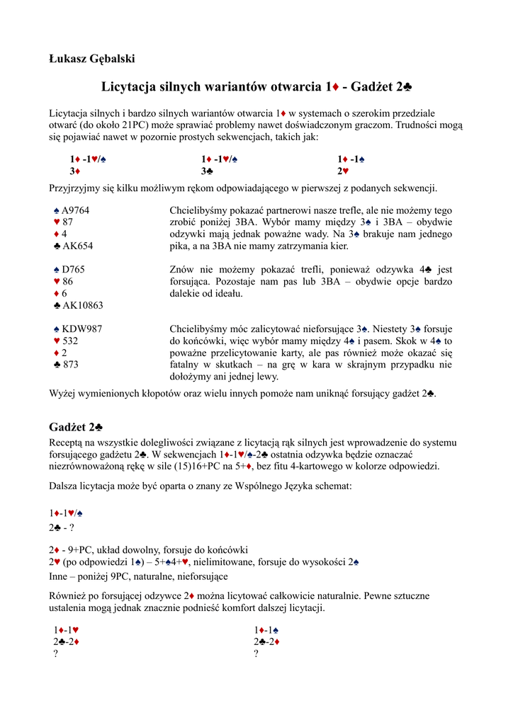 Łukasz Gębalski Licytacja silnych wariantów otwarcia 1♦ - Gadżet 2♣ Licytacja silnych i bardzo silnych wariantów otwarcia 1♦ w systemach o szerokim przedziale otwarć (do około 21PC) może sprawiać problemy nawet doświadczonym graczom. Trudności mogą się pojawiać nawet w pozornie prostych sekwencjach, takich jak: 1♦ -1♥/♠ 3♦ 1♦ -1♥/♠ 3♣ 1♦ -1♠ 2♥ Przyjrzyjmy się kilku możliwym rękom odpowiadającego w pierwszej z podanych sekwencji. ♠ A9764 ♥ 87 ♦4 ♣ AK654 Chcielibyśmy pokazać partnerowi nasze trefle, ale nie możemy tego zrobić poniżej 3BA. Wybór mamy między 3♠ i 3BA – obydwie odzywki mają jednak poważne wady. Na 3♠ brakuje nam jednego pika, a na 3BA nie mamy zatrzymania kier. ♠ D765 ♥ 86 ♦6 ♣ AK10863 Znów nie możemy pokazać trefli, ponieważ odzywka 4♣ jest forsująca. Pozostaje nam pas lub 3BA – obydwie opcje bardzo dalekie od ideału. ♠ KDW987 ♥ 532 ♦2 ♣ 873 Chcielibyśmy móc zalicytować nieforsujące 3♠. Niestety 3♠ forsuje do końcówki, więc wybór mamy między 4♠ i pasem. Skok w 4♠ to poważne przelicytowanie karty, ale pas również może okazać się fatalny w skutkach – na grę w kara w skrajnym przypadku nie dołożymy ani jednej lewy. Wyżej wymienionych kłopotów oraz wielu innych pomoże nam uniknąć forsujący gadżet 2♣. Gadżet 2♣ Receptą na wszystkie dolegliwości związane z licytacją rąk silnych jest wprowadzenie do systemu forsującego gadżetu 2♣. W sekwencjach 1♦-1♥/♠-2♣ ostatnia odzywka będzie oznaczać niezrównoważoną rękę w sile (15)16+PC na 5+♦, bez fitu 4-kartowego w kolorze odpowiedzi. Dalsza licytacja może być oparta o znany ze Wspólnego Języka schemat: 1♦-1♥/♠ 2♣ - ? 2♦ - 9+PC, układ dowolny, forsuje do końcówki 2♥ (po odpowiedzi 1♠) – 5+♠4+♥, nielimitowane, forsuje do wysokości 2♠ Inne – poniżej 9PC, naturalne, nieforsujące Również po forsującej odzywce 2♦ można licytować całkowicie naturalnie. Pewne sztuczne ustalenia mogą jednak znacznie podnieść komfort dalszej licytacji. 1♦-1♥ 2♣-2♦ ? 1♦-1♠ 2♣-2♦ ? 2♥ - sztuczne, (15)16+PC, 5+♦4+♣ 2♥ - (15)16+PC, 5+♦4♥ 2♠ - (15)16+PC, 5+♦4♠ 2♠ - sztuczne, (15)16+PC, 5+♦4+♣ 2BA – 15-16PC, 6♦, ręka dobra do zajęcia BA 2BA – 15-16PC, 6♦, ręka dobra do zajęcia BA 3♣ - sztuczne, 16-17PC, 6+♦, transfer na ♦ 3♦ - 18+PC, 6+♦, bez 3♠ 3♦ - 18+PC, 6+♦, bez 3♥ 3♥ - 18+PC, 6+♦3♠, krótkość ♥ 3♥ - 18+PC, 6+♦, 3♥ 3♠ - 18+PC, 6+♦3♠ 3♠ - 18+PC, 6+♦3♥, krótkość ♠ 3BA – 18+PC, 6+♦, bez 3♠, ręka dobra do BA 3♣ - sztuczne, 16-17PC, 6+♦, transfer na ♦ 3BA – 18+PC, 6+♦, bez 3♥, ręka dobra do BA Sztuczne dwa w kolor odpowiedzi pomoże nam precyzyjniej licytować z rękami karowotreflowymi, transfer na 6+♦ pozwoli zaś dokładniej bilansować ręce monokolorowe oraz oddaje do naszej dyspozycji dodatkową odzywkę 3♦, którą możemy wykorzystać w charakterze odzywki wyczekującej (tzw. waitingu). Uzbrojeni w powyższe ustalenia spróbujmy przelicytować kilka problemowych rozdań. Ręka W Ręka E Gadżet 2♣ Licytacja klasyczna ♠7 ♥ AD8 ♦ KW8764 ♣ AD8 ♠ KDW1098 ♥ 743 ♦3 ♣ 653 1♦-1♠ 2♣-2♠ 3♦-3♠ Pas… 1♦-1♠ 3♦-4♠ Pas… ♠ A7 ♥ AD84 ♦ AD1076 ♣ 84 ♠ 8654 ♥ K3 ♦3 ♣ K109765 1♦-1♠ 2♣-3♣ Pas… 1♦-1♠ 2♥-3BA Pas… ♠ AK5 ♥ 74 ♦ ADW754 ♣ D5 ♠ D7653 ♥ 86 ♦6 ♣ AKW108 1♦-1♠ 2♣-2♦ 3♣-3♦ 3♠-4♠ Pas… 1♦-1♠ 3♦-3BA Pas… Stosowanie gadżetu 2♣ zmusza nas do licytowania rąk na kolorach młodszych w sile 11-14PC w jakiś inny sposób. Jak skutecznie radzić sobie z tym problemem przedstawię w drugiej części artykułu.