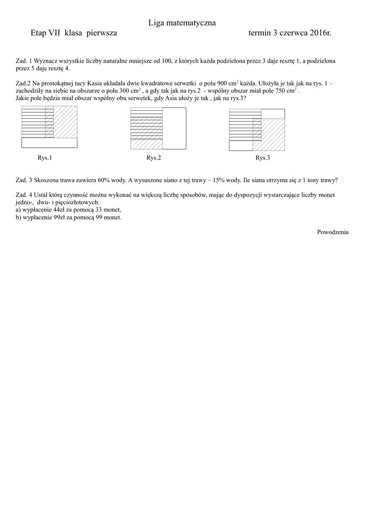 Liga matematyczna Etap VII klasa pierwsza termin 3 czerwca 2016r. Zad. 1 Wyznacz wszystkie liczby naturalne mniejsze od 100, z których każda podzielona przez 3 daje resztę 1, a podzielona przez 5 daje resztę 4. Zad.2 Na prostokątnej tacy Kasia układała dwie kwadratowe serwetki o polu 900 cm2 każda. Ułożyła je tak jak na rys. 1 – zachodziły na siebie na obszarze o polu 300 cm2 , a gdy tak jak na rys.2 - wspólny obszar miał pole 750 cm2 . Jakie pole będzie miał obszar wspólny obu serwetek, gdy Asia ułoży je tak , jak na rys.3? Rys.1 Rys.2 Rys.3 Zad. 3 Skoszona trawa zawiera 60% wody. A wysuszone siano z tej trawy – 15% wody. Ile siana otrzyma się z 1 tony trawy? Zad. 4 Ustal którą czynność można wykonać na większą liczbę sposobów, mając do dyspozycji wystarczające liczby monet jedno-, dwu- i pięciozłotowych: a) wypłacenie 44zł za pomocą 33 monet, b) wypłacenie 99zł za pomocą 99 monet. Powodzenia