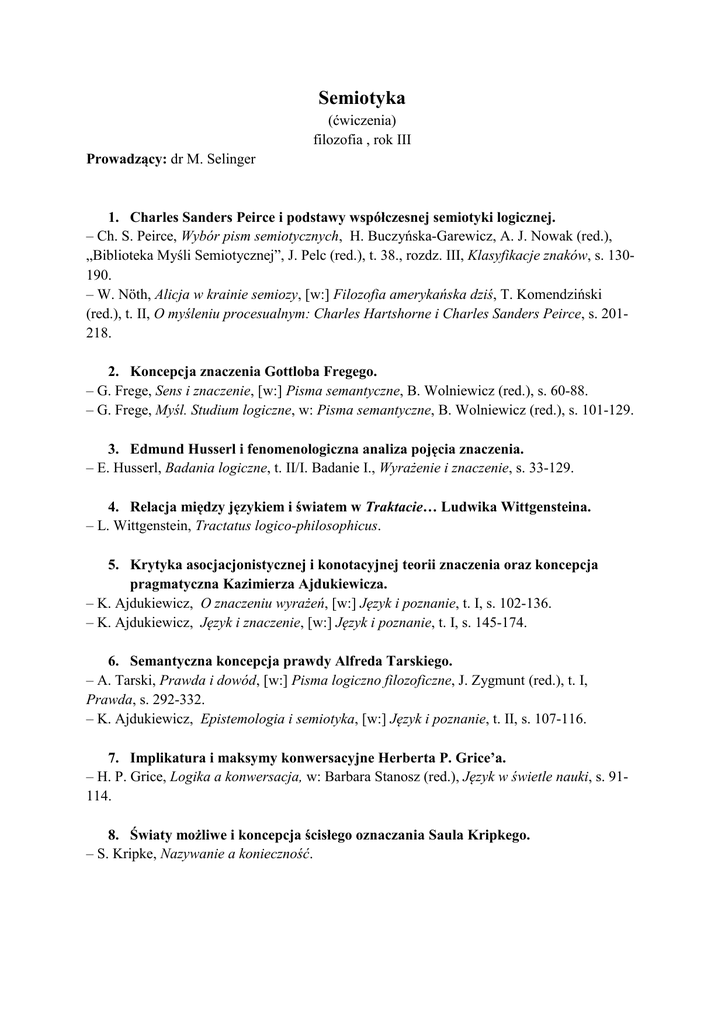 Semiotyka (ćwiczenia) filozofia , rok III Prowadzący: dr M. Selinger 1. Charles Sanders Peirce i podstawy współczesnej semiotyki logicznej. – Ch. S. Peirce, Wybór pism semiotycznych, H. Buczyńska-Garewicz, A. J. Nowak (red.), „Biblioteka Myśli Semiotycznej”, J. Pelc (red.), t. 38., rozdz. III, Klasyfikacje znaków, s. 130190. – W. Nöth, Alicja w krainie semiozy, [w:] Filozofia amerykańska dziś, T. Komendziński (red.), t. II, O myśleniu procesualnym: Charles Hartshorne i Charles Sanders Peirce, s. 201218. 2. Koncepcja znaczenia Gottloba Fregego. – G. Frege, Sens i znaczenie, [w:] Pisma semantyczne, B. Wolniewicz (red.), s. 60-88. – G. Frege, Myśl. Studium logiczne, w: Pisma semantyczne, B. Wolniewicz (red.), s. 101-129. 3. Edmund Husserl i fenomenologiczna analiza pojęcia znaczenia. – E. Husserl, Badania logiczne, t. II/I. Badanie I., Wyrażenie i znaczenie, s. 33-129. 4. Relacja między językiem i światem w Traktacie… Ludwika Wittgensteina. – L. Wittgenstein, Tractatus logico-philosophicus. 5. Krytyka asocjacjonistycznej i konotacyjnej teorii znaczenia oraz koncepcja pragmatyczna Kazimierza Ajdukiewicza. – K. Ajdukiewicz, O znaczeniu wyrażeń, [w:] Język i poznanie, t. I, s. 102-136. – K. Ajdukiewicz, Język i znaczenie, [w:] Język i poznanie, t. I, s. 145-174. 6. Semantyczna koncepcja prawdy Alfreda Tarskiego. – A. Tarski, Prawda i dowód, [w:] Pisma logiczno filozoficzne, J. Zygmunt (red.), t. I, Prawda, s. 292-332. – K. Ajdukiewicz, Epistemologia i semiotyka, [w:] Język i poznanie, t. II, s. 107-116. 7. Implikatura i maksymy konwersacyjne Herberta P. Grice’a. – H. P. Grice, Logika a konwersacja, w: Barbara Stanosz (red.), Język w świetle nauki, s. 91114. 8. Światy możliwe i koncepcja ścisłego oznaczania Saula Kripkego. – S. Kripke, Nazywanie a konieczność.