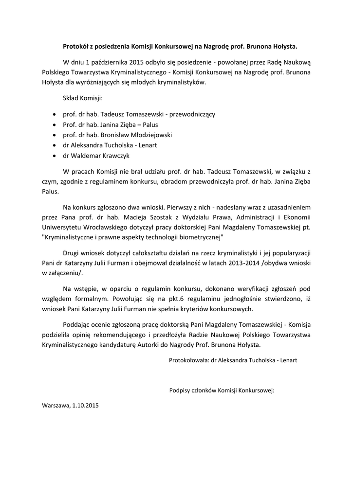 Protokół z posiedzenia Komisji Konkursowej na Nagrodę prof. Brunona Hołysta. W dniu 1 października 2015 odbyło się posiedzenie - powołanej przez Radę Naukową Polskiego Towarzystwa Kryminalistycznego - Komisji Konkursowej na Nagrodę prof. Brunona Hołysta dla wyróżniających się młodych kryminalistyków. Skład Komisji: prof. dr hab. Tadeusz Tomaszewski - przewodniczący Prof. dr hab. Janina Zięba – Palus prof. dr hab. Bronisław Młodziejowski dr Aleksandra Tucholska - Lenart dr Waldemar Krawczyk W pracach Komisji nie brał udziału prof. dr hab. Tadeusz Tomaszewski, w związku z czym, zgodnie z regulaminem konkursu, obradom przewodniczyła prof. dr hab. Janina Zięba Palus. Na konkurs zgłoszono dwa wnioski. Pierwszy z nich - nadesłany wraz z uzasadnieniem przez Pana prof. dr hab. Macieja Szostak z Wydziału Prawa, Administracji i Ekonomii Uniwersytetu Wrocławskiego dotyczył pracy doktorskiej Pani Magdaleny Tomaszewskiej pt. "Kryminalistyczne i prawne aspekty technologii biometrycznej" Drugi wniosek dotyczył całokształtu działań na rzecz kryminalistyki i jej popularyzacji Pani dr Katarzyny Julii Furman i obejmował działalność w latach 2013-2014 /obydwa wnioski w załączeniu/. Na wstępie, w oparciu o regulamin konkursu, dokonano weryfikacji zgłoszeń pod względem formalnym. Powołując się na pkt.6 regulaminu jednogłośnie stwierdzono, iż wniosek Pani Katarzyny Julii Furman nie spełnia kryteriów konkursowych. Poddając ocenie zgłoszoną pracę doktorską Pani Magdaleny Tomaszewskiej - Komisja podzieliła opinię rekomendującego i przedłożyła Radzie Naukowej Polskiego Towarzystwa Kryminalistycznego kandydaturę Autorki do Nagrody Prof. Brunona Hołysta. Protokołowała: dr Aleksandra Tucholska - Lenart Podpisy członków Komisji Konkursowej: Warszawa, 1.10.2015