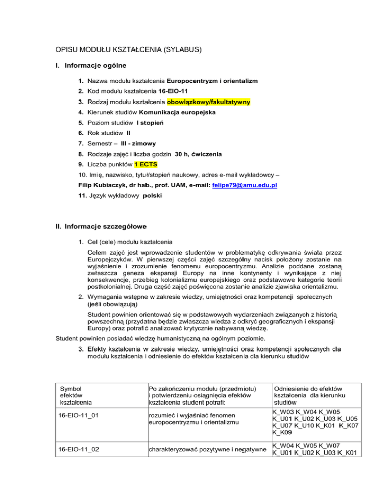 OPISU MODUŁU KSZTAŁCENIA (SYLABUS) I. Informacje ogólne 1. Nazwa modułu kształcenia Europocentryzm i orientalizm 2. Kod modułu kształcenia 16-EIO-11 3. Rodzaj modułu kształcenia obowiązkowy/fakultatywny 4. Kierunek studiów Komunikacja europejska 5. Poziom studiów I stopień 6. Rok studiów II 7. Semestr – III - zimowy 8. Rodzaje zajęć i liczba godzin 30 h, ćwiczenia 9. Liczba punktów 1 ECTS 10. Imię, nazwisko, tytuł/stopień naukowy, adres e-mail wykładowcy – Filip Kubiaczyk, dr hab., prof. UAM, e-mail: [email protected] 11. Język wykładowy polski II. Informacje szczegółowe 1. Cel (cele) modułu kształcenia Celem zajęć jest wprowadzenie studentów w problematykę odkrywania świata przez Europejczyków. W pierwszej części zajęć szczególny nacisk położony zostanie na wyjaśnienie i zrozumienie fenomenu europocentryzmu. Analizie poddane zostaną zwłaszcza geneza ekspansji Europy na inne kontynenty i wynikające z niej konsekwencje, przebieg kolonializmu europejskiego oraz podstawowe kategorie teorii postkolonialnej. Druga część zajęć poświęcona zostanie analizie zjawiska orientalizmu. 2. Wymagania wstępne w zakresie wiedzy, umiejętności oraz kompetencji społecznych (jeśli obowiązują) Student powinien orientować się w podstawowych wydarzeniach związanych z historią powszechną (przydatna będzie zwłaszcza wiedza z odkryć geograficznych i ekspansji Europy) oraz potrafić analizować krytycznie nabywaną wiedzę. Student powinien posiadać wiedzę humanistyczną na ogólnym poziomie. 3. Efekty kształcenia w zakresie wiedzy, umiejętności oraz kompetencji społecznych dla modułu kształcenia i odniesienie do efektów kształcenia dla kierunku studiów Symbol efektów kształcenia Po zakończeniu modułu (przedmiotu) i potwierdzeniu osiągnięcia efektów kształcenia student potrafi: Odniesienie do efektów kształcenia dla kierunku studiów 16-EIO-11_01 rozumieć i wyjaśniać fenomen europocentryzmu i orientalizmu K_W03 K_W04 K_W05 K_U01 K_U02 K_U03 K_U05 K_U07 K_U10 K_K01 K_K07 K_K09 16-EIO-11_02 charakteryzować pozytywne i negatywne K_W04 K_W05 K_W07 K_U01 K_U02 K_U03 K_K01 skutki zetknięcia się Europejczyków z innymi kulturami i cywilizacjami K_K07 K_K09 16-EIO-11_03 omawiać uwarunkowania i poszczególne K_W07 K_W08 K_U01 K_U02 etapy ekspansji Europy na inne K_U03 K_K01 K_K07 K_K09 kontynenty 16-EIO-11_04 charakteryzować wybrane modele kolonializmu (portugalski, hiszpański, angielski, francuski) 16-EIO-11_05 K_W07 K_W08 K_W10 K_U01 K_U02 K_U03 K_U07 K_U10 K_K01 K_K07 K_K09 K_W05 K_W07 K_W09 formułować pytania i problemy badawcze K_U01 K_U02 K_U03 K_U05 związane z wpływem dziedzictwa K_U07 K_U10 K_K01 K_K07 kolonializmu na współczesne relacje K_K09 K_K12 K_K13 międzynarodowe 4. Treści kształcenia Nazwa modułu kształcenia: Europocentryzm i orientalizm Symbol treści kształcenia Opis treści kształcenia Odniesienie do efektów kształcenia modułu TK_01 Europocentryzm – próba definicji 16-EIO-11_01 16-EIO-11_04 TK_02 Uwarunkowania odkryć geograficznych 16-EIO-11_02 16-EIO-11_03 16-EIO-11_04 16-EIO-11_01 16-EIO-11_02 TK_03 Rok 1492: odkrycie, zakrycie czy wynalezienie Ameryki? TK_04 Portugalski i hiszpański model kolonializmu 16-EIO-11_04 16-EIO-11_05 TK_05 Wschód wykreowany czy rzeczywisty? Wokół Orientalizmu E. Saida. 16-EIO-11_01 16-EIO-11_05 16-EIO-11_04 16-EIO-11_05 5. Zalecana literatura 1. D. Chakrabarty, Prowincjonalizacja Europy. Myśl postkolonialna i różnica kolonialna, Poznań 2011. 2. A. Loomba, Kolonializm/postkolonializm, Poznań 2011. 3. I. Buruma, A. Margalit, Okcydentalizm. Zachód w oczach wrogów, Kraków 2005. 4. F. Kubiaczyk, Nowoczesność, kolonialność i tożsamość: perspektywa latynoamerykańska, Poznań 2013. 5. G. Spivak, Strategie postkolonialne, Warszawa 2011. 6. J. Ziegler, Nienawiść do Zachodu, Warszawa 2010. 7. I.C. Schick, Seksualność Orientu. Przestrzeń i Eros, Warszawa 2012. 8. M.F. Gawrycki, A. Szeptycki, Podporządkowanie-niedorozwój-wyobcowanie. Postkolonializm a stosunki międzynarodowe, Warszawa 2011. 9. M.L. Pratt, Imperialne spojrzenie. Pisarstwo podróżnicze a transkulturacja, Kraków 2011. 10. E. Said, Orientalizm, Warszawa 2005. 6. Informacja o przewidywanej możliwości wykorzystania b-learningu – nie dotyczy. 7. Informacja o tym, gdzie można zapoznać się z materiałami do zajęć, instrukcjami do laboratorium, itp. Materiały będą dostępne w Bibliotece Instytutu Kultury Europejskiej UAM oraz w Bibliotekach UAM III. Informacje dodatkowe 1.Odniesienie efektów kształcenia i treści kształcenia do sposobów prowadzenia zajęć i metod oceniania Nazwa modułu (przedmiotu): Europocentryzm i orientalizm Sposoby prowadzenia zajęć Symbol efektu Symbol treści kształcenia umożliwiające osiągnięcie kształcenia dla realizowanych w trakcie założonych efektów modułu zajęć kształcenia Metody oceniania stopnia osiągnięcia założonego efektu kształcenia Formująca, podsumowująca 16-EIO-11_01 TK_01 TK_02 TK_05 1,2 16-EIO-11_02 TK_02 TK_03 1,2 formująca 16-EIO-11_03 TK_02 1,2 formująca 16-EIO-11_04 TK_01 TK_02 TK_03 TK_04 1,2 16-EIO-11_05 TK_03 TK_04 TK_05 1,2 Formująca, podsumowująca Formująca, podsumowująca 1. Ćwiczenia połączone z interpretacją tekstów historyczno-kulturowych 2. Ćwiczenia połączone z prezentacją multimedialną oraz końcową dyskusją ze studentami Przykładowe pytania: Ad 16-EIO-11_01: Wymień najważniejsze uwarunkowania odkryć geograficznych przełomu XV i XVI w. Ad 16-EIO-11_02: Jak rozumiesz termin europocentryzm? Ad 16-EIO-11_03: Wymień i omów kategorie kulturowe opisujące to, co wydarzyło się na kontynencie amerykańskim w 1492 roku. Ad 16-EIO-11_04: Scharakteryzuj hiszpański model kolonializmu. Ad 16-EIO-11_05: Podaj definicję orientalizmu. 1. Kryteria oceniania Oceny Na ocenę 2 Na ocenę 3 Na ocenę 4 Na ocenę 5 16-EIO-11_01 Europocentryzm – próba definicji Student zupełnie nie