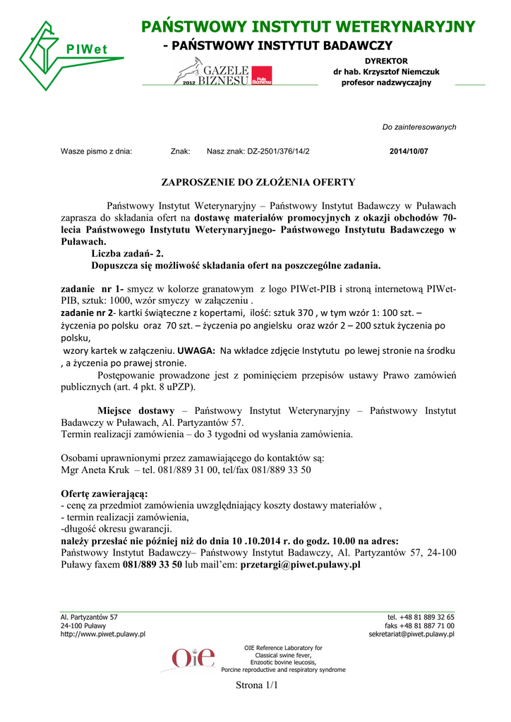 PAŃSTWOWY INSTYTUT WETERYNARYJNY - PAŃSTWOWY INSTYTUT BADAWCZY DYREKTOR dr hab. Krzysztof Niemczuk profesor nadzwyczajny Do zainteresowanych Wasze pismo z dnia: Znak: Nasz znak: DZ-2501/376/14/2 2014/10/07 ZAPROSZENIE DO ZŁOśENIA OFERTY Państwowy Instytut Weterynaryjny – Państwowy Instytut Badawczy w Puławach zaprasza do składania ofert na dostawę materiałów promocyjnych z okazji obchodów 70lecia Państwowego Instytutu Weterynaryjnego- Państwowego Instytutu Badawczego w Puławach. Liczba zadań- 2. Dopuszcza się moŜliwość składania ofert na poszczególne zadania. zadanie nr 1- smycz w kolorze granatowym z logo PIWet-PIB i stroną internetową PIWetPIB, sztuk: 1000, wzór smyczy w załączeniu . zadanie nr 2- kartki świąteczne z kopertami, ilość: sztuk 370 , w tym wzór 1: 100 szt. – życzenia po polsku oraz 70 szt. – życzenia po angielsku oraz wzór 2 – 200 sztuk życzenia po polsku, wzory kartek w załączeniu. UWAGA: Na wkładce zdjęcie Instytutu po lewej stronie na środku , a życzenia po prawej stronie. Postępowanie prowadzone jest z pominięciem przepisów ustawy Prawo zamówień publicznych (art. 4 pkt. 8 uPZP). Miejsce dostawy – Państwowy Instytut Weterynaryjny – Państwowy Instytut Badawczy w Puławach, Al. Partyzantów 57. Termin realizacji zamówienia – do 3 tygodni od wysłania zamówienia. Osobami uprawnionymi przez zamawiającego do kontaktów są: Mgr Aneta Kruk – tel. 081/889 31 00, tel/fax 081/889 33 50 Ofertę zawierającą: - cenę za przedmiot zamówienia uwzględniający koszty dostawy materiałów , - termin realizacji zamówienia, -długość okresu gwarancji. naleŜy przesłać nie później niŜ do dnia 10 .10.2014 r. do godz. 10.00 na adres: Państwowy Instytut Badawczy– Państwowy Instytut Badawczy, Al. Partyzantów 57, 24-100 Puławy faxem 081/889 33 50 lub mail’em: [email protected] Al. Partyzantów 57 24-100 Puławy http://www.piwet.pulawy.pl tel. +48 81 889 32 65 faks +48 81 887 71 00 [email protected] OIE Reference Laboratory for Classical swine fever, Enzootic bovine leucosis, Porcine reproductive and respiratory syndrome Strona 1/1