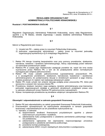 Załącznik do Zarządzenia nr 17 Rektora PK z dnia 16 kwietnia 2013 r. REGULAMIN ORGANIZACYJNY ADMINISTRACJI POLITECHNIKI KRAKOWSKIEJ Rozdział I. POSTANOWIENIA OGÓLNE §1 Regulamin Organizacyjny Administracji Politechniki Krakowskiej, zwany dalej Regulaminem, zgodnie z § 78 Statutu, określa organizację i zasady działania administracji Politechniki Krakowskiej. §2 Ilekroć w Regulaminie jest mowa o: 1) Uczelni lub PK – należy przez to rozumieć Politechnikę Krakowską, 2) jednostce organizacyjnej administracji – należy przez to rozumieć jednostkę organizacyjną wymienioną w § 6 niniejszego Regulaminu. §3 1. Rektor PK kieruje Uczelnią bezpośrednio oraz przy pomocy prorektorów, dziekanów, kanclerza, kwestora i dyrektora administracyjnego, którzy odpowiadają przed rektorem za wykonanie powierzonych zadań. 2. Rektora PK w czasie jego nieobecności zastępuje prorektor ds. nauki lub inna osoba wyznaczona przez Rektora PK, z tym że do podpisywania aktów normatywnych wymagane jest odrębne pełnomocnictwo. 3. Rektor PK może udzielić pełnomocnictwa (upoważnienia) pracownikom PK, a w szczególności prorektorom, dziekanom, kanclerzowi, kwestorowi i dyrektorowi administracyjnemu do podejmowania decyzji w określonych sprawach w jego imieniu, a także powierzyć im nadzór nad realizacją wskazanych zadań. 4. Rektor PK może uchylić lub zmienić decyzję podjętą przez pracownika PK, która jest sprzeczna z prawem lub narusza interes PK. 5. Prorektorzy, dziekani, kanclerz i jego zastępcy, dyrektor administracyjny oraz kierownicy jednostek organizacyjnych działają w granicach określonych przepisami prawa oraz w zakresie udzielonych przez Rektora PK pełnomocnictw (upoważnień). 6. Wykaz i kompetencje prorektorów są określane odrębnym zarządzeniem Rektora PK. §4 Obowiązki i odpowiedzialność w zakresie gospodarki finansowej 1. Rektor PK jest odpowiedzialny za całość gospodarki finansowej Politechniki Krakowskiej. 2. Pracownikami upoważnionymi do wykonywania obowiązków w ramach gospodarki finansowej i odpowiedzialnymi za ich prawidłowe wykonywanie są: 1) kanclerz, w zakresie: a) dysponowania środkami finansowymi przydzielonymi zgodnie z planem wykonawczym przychodów i wydatków, b) zatwierdzenia trybu postępowania o udzielenia zamówienia publicznego innego niż podstawowy, c) zatwierdzenia ogłoszenia lub zaproszenia rozpoczynającego procedurę postępowania o udzielenie zamówienia publicznego, d) powołania komisji przetargowej, e) zatwierdzania SIWZ i innych niezbędnych dokumentów w postępowaniu, f) g) h) i) j) wykluczenia wykonawcy, odrzucenia ofert, wyboru oferty najkorzystniejszej, unieważniania postępowania, zawierania umowy lub aneksu, reklamacji, naliczania kar umownych, zgodnie z ustawą Prawo zamówień publicznych. 2) prorektorzy, dyrektor administracyjny, dyrektor techniczny, dziekani, kierownicy jednostek pozawydziałowych, w zakresie: a) dysponowania środkami finansowymi przydzielonymi zgodnie z planem wykonawczym przychodów i wydatków, b) zawierania umowy lub aneksu dla zamówień publicznych poniżej progu ustawowego, reklamacji, naliczania kar umownych, zgodnie z ustawą Prawo zamówień publicznych. 3) kierownicy jednostek organizacyjnych, w zakresie: a) opisywania przedmiotu zamówienia publicznego, b) ustalania wartości zamówienia publicznego lub jego części, c) opisywania sposobu dokonania oceny spełniania warunków udziału w postępowaniu o udzielenie zamówienia publicznego, d) określania kryteriów oceny ofert, e) właściwego zakwalifikowania zamówienia do zwolnienia ze stosowania ustawy Prawo zamówień publicznych na podstawie art. 4 pkt 3 lit. e (badania naukowe, prace rozwojowe, świadczenia usług badawczych). 3. Rektor PK może przekazać obowiązki i odpowiedzialność w zakresie gospodarki finansowej również innym pracownikom, w formie odrębnego imiennego upoważnienia. 4. Pracownicy Politechniki Krakowskiej, o których mowa w ust. 2 i 3, ponoszą odpowiedzialność na zasadach określonych w ustawie o odpowiedzialności za naruszenie dyscypliny finansów publicznych z dnia 17 grudnia 2004 r. (Dz.U. z 2013 r. poz. 168). 5. Szczegółowe zasady gospodarki finansowej PK określa odrębne zarządzenie Rektora PK. §5 1. Uczelnia działa w oparciu o zasady jednoosobowego kierownictwa, służbowego podporządkowania i indywidualnej odpowiedzialności za wykonanie powierzonych zadań. 2. Do zadań administracji PK należą czynności administracyjne, finansowe, organizacyjne, gospodarcze, techniczne i usługowe wynikające z obowiązujących przepisów dotyczących poszczególnych obszarów działalności uczelni. 3. Sposób realizacji zadań, mogą określać procedury, zawarte w wykazie procedur opublikowanych w Serwisie Informacyjnym Pracowników PK (SIP), opracowane zgodnie z następującymi zasadami: 1) właściwym do opracowania i aktualizacji procedury jest kierownik jednostki organizacyjnej, wiodącej w danym działaniu (procesie), 2) procedurę zatwierdza osoba kierująca danym pionem administracji, 3) podpisaną i zatwierdzoną procedurę, w wersji papierowej i elektronicznej, należy przekazać do Działu Organizacyjnego, który przechowuje wersję papierową procedury, a wersję elektroniczną umieszcza w SIP, 4) procedury zatwierdzone i umieszczone w SIP są obowiązujące na PK. 4. Administracja PK obejmuje: 1) administrację centralną, która realizuje zadania na rzecz całej Uczelni, 2) administrację wydziałów i innych jednostek organizacyjnych, o których mowa w § 7 ust. 1 i 2 oraz § 11 niniejszego Regulaminu, realizującą zadania związane bezpośrednio z działalnością tych jednostek. 5. Pracą administracji centralnej, z wyłączeniem jednostek organizacyjnych podporządkowanych bezpośrednio Rektorowi PK i prorektorom, kierują kanclerz oraz dyrektor administracyjny w zakresie określonym w niniejszym regulaminie. 6. Pracą administracji wydziałów i jednostek poza