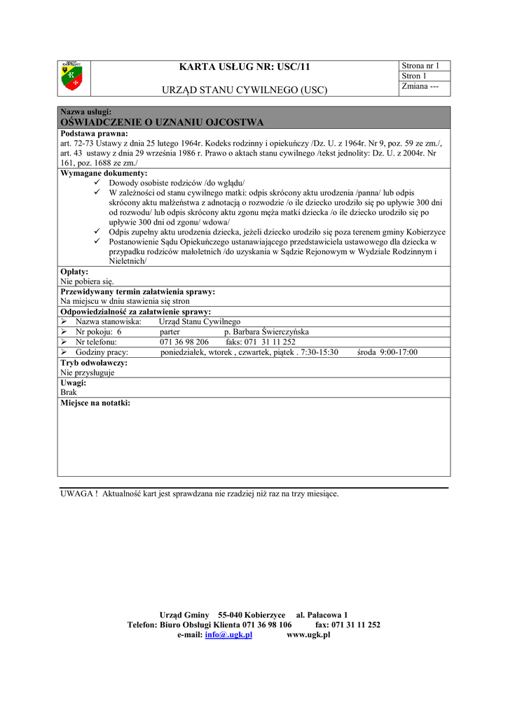 KARTA USŁUG NR: USC/11 URZĄD STANU CYWILNEGO (USC) Strona nr 1 Stron 1 Zmiana --- Nazwa usługi: OŚWIADCZENIE O UZNANIU OJCOSTWA Podstawa prawna: art. 72-73 Ustawy z dnia 25 lutego 1964r. Kodeks rodzinny i opiekuńczy /Dz. U. z 1964r. Nr 9, poz. 59 ze zm./, art. 43 ustawy z dnia 29 września 1986 r. Prawo o aktach stanu cywilnego /tekst jednolity: Dz. U. z 2004r. Nr 161, poz. 1688 ze zm./ Wymagane dokumenty: Dowody osobiste rodziców /do wglądu/ W zależności od stanu cywilnego matki: odpis skrócony aktu urodzenia /panna/ lub odpis skrócony aktu małżeństwa z adnotacją o rozwodzie /o ile dziecko urodziło się po upływie 300 dni od rozwodu/ lub odpis skrócony aktu zgonu męża matki dziecka /o ile dziecko urodziło się po upływie 300 dni od zgonu/ wdowa/ Odpis zupełny aktu urodzenia dziecka, jeżeli dziecko urodziło się poza terenem gminy Kobierzyce Postanowienie Sądu Opiekuńczego ustanawiającego przedstawiciela ustawowego dla dziecka w przypadku rodziców małoletnich /do uzyskania w Sądzie Rejonowym w Wydziale Rodzinnym i Nieletnich/ Opłaty: Nie pobiera się. Przewidywany termin załatwienia sprawy: Na miejscu w dniu stawienia się stron Odpowiedzialność za załatwienie sprawy: Nazwa stanowiska: Urząd Stanu Cywilnego Nr pokoju: 6 parter p. Barbara Świerczyńska Nr telefonu: 071 36 98 206 faks: 071 31 11 252 Godziny pracy: poniedziałek, wtorek , czwartek, piątek . 7:30-15:30 środa 9:00-17:00 Tryb odwoławczy: Nie przysługuje Uwagi: Brak Miejsce na notatki: UWAGA ! Aktualność kart jest sprawdzana nie rzadziej niż raz na trzy miesiące. Urząd Gminy 55-040 Kobierzyce al. Pałacowa 1 Telefon: Biuro Obsługi Klienta 071 36 98 106 fax: 071 31 11 252 e-mail: [email protected] www.ugk.pl