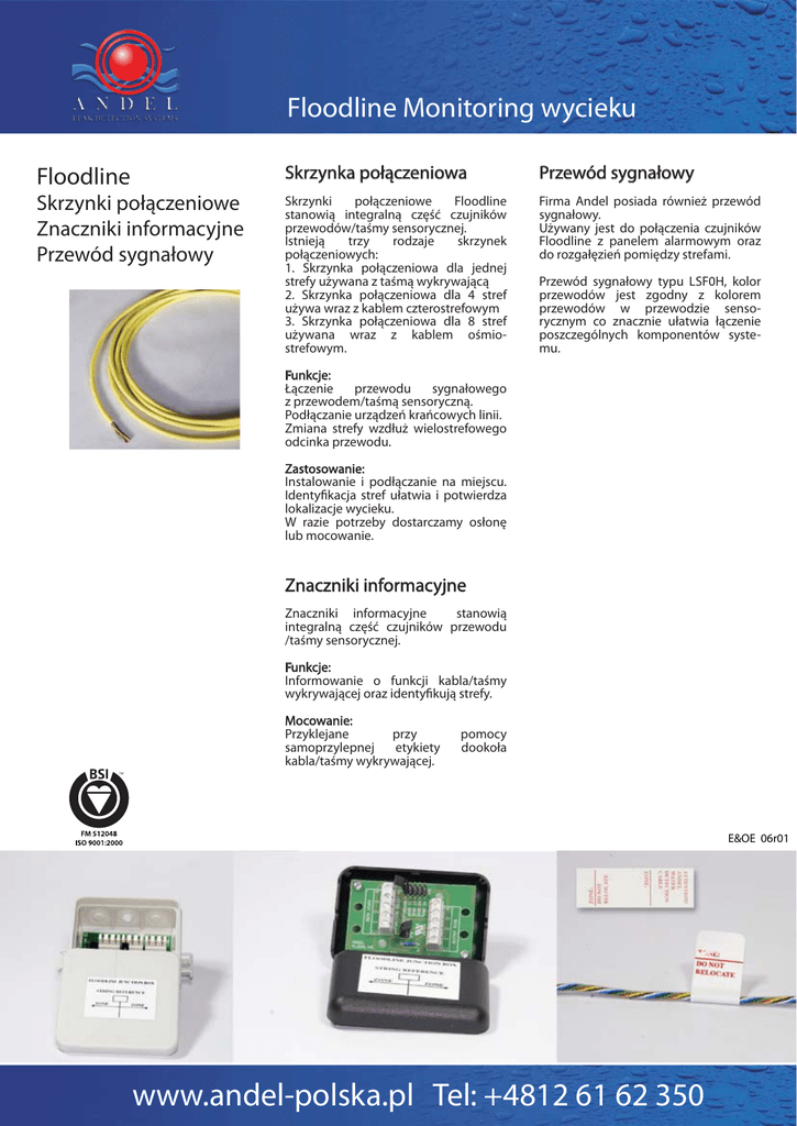 Floodline Monitoring wycieku Floodline Skrzynki połączeniowe Znaczniki informacyjne Przewód sygnałowy Skrzynka połączeniowa Przewód sygnałowy Skrzynki połączeniowe Floodline stanowią integralną część czujników przewodów/taśmy sensorycznej. Istnieją trzy rodzaje skrzynek połączeniowych: 1. Skrzynka połączeniowa dla jednej strefy używana z taśmą wykrywającą 2. Skrzynka połączeniowa dla 4 stref używa wraz z kablem czterostrefowym 3. Skrzynka połączeniowa dla 8 stref używana wraz z kablem ośmiostrefowym. Firma Andel posiada również przewód sygnałowy. Używany jest do połączenia czujników Floodline z panelem alarmowym oraz do rozgałęzień pomiędzy strefami. Przewód sygnałowy typu LSF0H, kolor przewodów jest zgodny z kolorem przewodów w przewodzie sensorycznym co znacznie ułatwia łączenie poszczególnych komponentów systemu. Funkcje: Łączenie przewodu sygnałowego z przewodem/taśmą sensoryczną. Podłączanie urządzeń krańcowych linii. Zmiana strefy wzdłuż wielostrefowego odcinka przewodu. Zastosowanie: Instalowanie i podłączanie na miejscu. Identyfikacja stref ułatwia i potwierdza lokalizacje wycieku. W razie potrzeby dostarczamy osłonę lub mocowanie. Znaczniki informacyjne Znaczniki informacyjne stanowią integralną część czujników przewodu /taśmy sensorycznej. Funkcje: Informowanie o funkcji kabla/taśmy wykrywającej oraz identyfikują strefy. Mocowanie: Przyklejane przy samoprzylepnej etykiety kabla/taśmy wykrywającej. pomocy dookoła E&OE 06r01 www.andel-polska.pl Tel: +4812 61 62 350