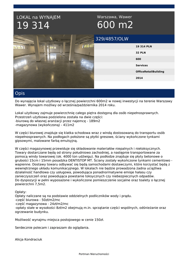 Warszawa, Wawer LOKAL na WYNAJEM 600 m2 19 314 329/4857/OLW 19 314 PLN 32 PLN 600 Services OfficeRetailBuilding 2014 Opis Do wynajęcia lokal użytkowy o łącznej powierzchni 600m2 w nowej inwestycji na terenie Warszawy Wawer. Wynajem możliwy od września/października 2014 roku. Lokal użytkowy zajmuje powierzchnię całego piętra dostępną dla osób niepełnosprawnych. Przestrzeń użytkowa podzielona została na dwie części: -biurową do własnej aranżacji przez najemcę - 189m2 -magazynowa (wykończoną) - 411m2 W części biurowej znajduje się klatka schodowa wraz z windą dostosowaną do transportu osób niepełnosprawnych. Na podłogach położone są płytki gresowe, ściany wykończone tynkami gipsowymi, malowane farbą emulsyjną. W części magazynowej przewiduje się składowanie materiałów niepalnych i nietoksycznych. Towary dostarczane będą od strony południowo zachodniej, a następnie transportowane za pomocą windy towarowej (ok. 4000 ton udźwigu). Na podłodze znajduje się płyty betonowe o grubości 15cm i 15mm posadzka DENTISTOP MT. Ściany zostały wykończone tynkami cementowo wapienne. Dostawy towaru odbywać się będą samochodami dostawczymi, które korzystać będą z wewnętrznego układu komunikacyjnego. W lokalach nie będzie prowadzona żadna uciążliwa działalność handlowa czy usługowa, powodująca ponadnormatywne emisje hałasu czy zanieczyszczeń oraz powodująca powstanie toksycznych czy niebezpiecznych odpadów. Do dyspozycji w pełni wyposażone i wykończone pomieszczenie socjalne oraz toalety o łącznej powierzchni 7,5m2. Opłaty: Opłaty naliczane są na podstawie oddzielnych podliczników wody i prądu. -część biurowa - 50zł/m2/mc -część magazynowa - 24zł/m2/mc -opłaty stałe w wysokości 8zł/m2 obejmują m.in. sprzątanie części wspólnych, odśnieżanie oraz ogrzewanie budynku. Możliwość wynajmu miejsca postojowego w cenie 150zł. Serdecznie polecam i zapraszam do oglądania. Alicja Kondraciuk Portman Nieruchomości PORTMAN Nieruchomości tel.: 517 445 776 e-mail: [email protected] Alicja Kondraciuk tel. 517 445 776 email: [email protected] Portman Nieruchomości Powered by TCPDF (www.tcpdf.org)