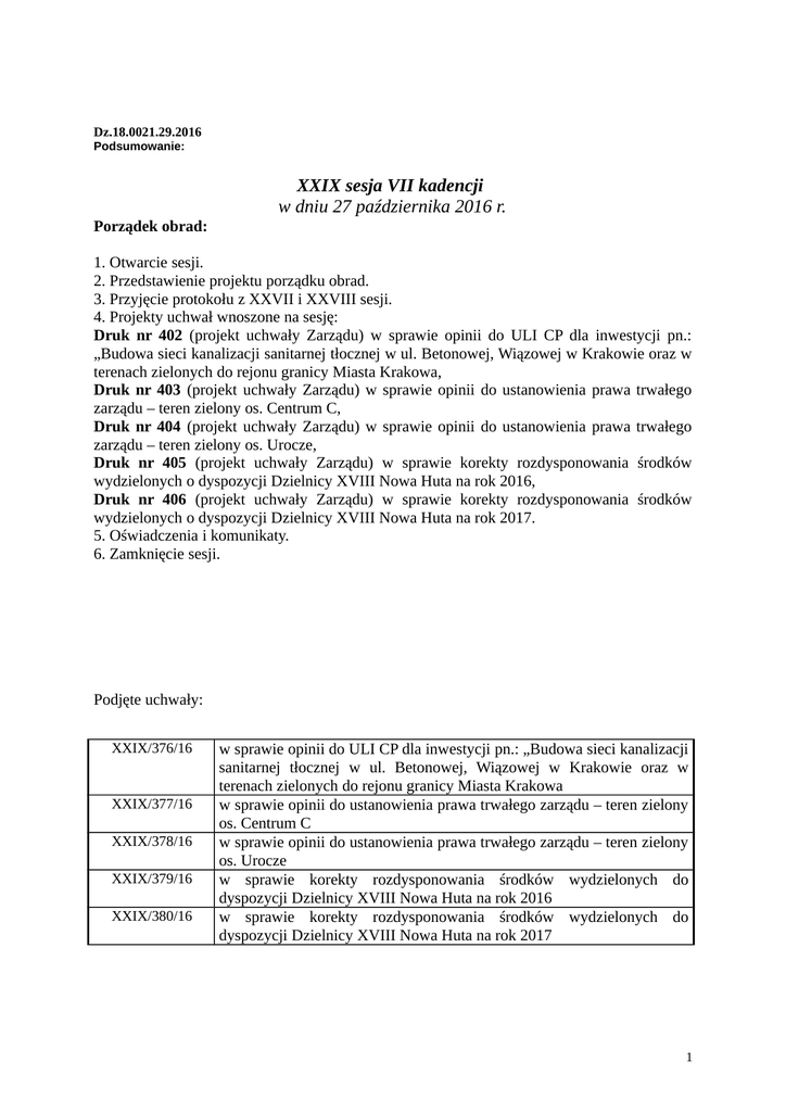 Dz.18.0021.29.2016 Podsumowanie: XXIX sesja VII kadencji w dniu 27 października 2016 r. Porządek obrad: 1. Otwarcie sesji. 2. Przedstawienie projektu porządku obrad. 3. Przyjęcie protokołu z XXVII i XXVIII sesji. 4. Projekty uchwał wnoszone na sesję: Druk nr 402 (projekt uchwały Zarządu) w sprawie opinii do ULI CP dla inwestycji pn.: „Budowa sieci kanalizacji sanitarnej tłocznej w ul. Betonowej, Wiązowej w Krakowie oraz w terenach zielonych do rejonu granicy Miasta Krakowa, Druk nr 403 (projekt uchwały Zarządu) w sprawie opinii do ustanowienia prawa trwałego zarządu – teren zielony os. Centrum C, Druk nr 404 (projekt uchwały Zarządu) w sprawie opinii do ustanowienia prawa trwałego zarządu – teren zielony os. Urocze, Druk nr 405 (projekt uchwały Zarządu) w sprawie korekty rozdysponowania środków wydzielonych o dyspozycji Dzielnicy XVIII Nowa Huta na rok 2016, Druk nr 406 (projekt uchwały Zarządu) w sprawie korekty rozdysponowania środków wydzielonych o dyspozycji Dzielnicy XVIII Nowa Huta na rok 2017. 5. Oświadczenia i komunikaty. 6. Zamknięcie sesji. Podjęte uchwały: XXIX/376/16 XXIX/377/16 XXIX/378/16 XXIX/379/16 XXIX/380/16 w sprawie opinii do ULI CP dla inwestycji pn.: „Budowa sieci kanalizacji sanitarnej tłocznej w ul. Betonowej, Wiązowej w Krakowie oraz w terenach zielonych do rejonu granicy Miasta Krakowa w sprawie opinii do ustanowienia prawa trwałego zarządu – teren zielony os. Centrum C w sprawie opinii do ustanowienia prawa trwałego zarządu – teren zielony os. Urocze w sprawie korekty rozdysponowania środków wydzielonych do dyspozycji Dzielnicy XVIII Nowa Huta na rok 2016 w sprawie korekty rozdysponowania środków wydzielonych do dyspozycji Dzielnicy XVIII Nowa Huta na rok 2017 1 Dz-18.0021.29.2016 PROTOKÓŁ XXIX SESJI RADY DZIELNICY XVIII Nowa Huta XXIX sesja Rady Dzielnicy XVIII Nowa Huta odbyła się 27 października 2016 r. w siedzibie Dzielnicy XVIII os. Centrum B 6. W załączeniu: 1) Lista obecności radnych – zał. nr 1, 2) Autopoprawka do Druku Nr 405 – zał. nr 2. 3) Autopoprawka 2 do Druku Nr 405 – zał. nr 3. 4) Autopoprawka do Druku Nr 406 – zał. nr 4. 5) Oryginały uchwał – zał. nr 5. XXIX sesję Rady Dzielnicy XVIII Nowa Huta otworzył o godz. 18.00 Przewodniczący Rady i Zarządu Dzielnicy XVIII, Pan Stanisław Moryc, który serdecznie przywitał obecnych na sali i stwierdził quorum. Na prośbę Mieszkańców Przewodniczący udzielił głosu Sekretarzowi Duszpasterskiej Rady Parafialnej – Parafia pw. Św. Bartłomieja Apostoła, który podziękował za zaangażowanie Rady Dzielnicy i zadeklarował pomoc Rady Parafialnej w rozwiązanie problemu dotyczącego przeniesienia kapliczki. Mieszkanka bloku 17 z os. Willowego poinformowała, że zdecydowana większość Wspólnoty wyraziła zgodę na przyjęcie kapliczki przy ich bloku. Zwróciła się z prośbą o ponowne wystąpienie do Prokuratury o ochronę uczuć religijnych i zakłócanie miru społecznego. Przewodniczący Stanisław Moryc oświadczył, że skieruje wniosek do Prokuratury dotyczący ochronę uczuć religijnych i zakłócanie miru społecznego. W związku z powyższym stwierdził, że procedowanie nad lokalizacją kapliczki do czasu wyjaśnienia sprawy przez Prokuraturę wydaje się bezcelowe. Obecnie Kapliczka została zabrana do renowacji przez ZZM, po renowacji będzie złożona w godnym miejscu w Opactwie do czasu poczynienia niezbędnych ustaleń. 2. Przedstawienie projektu porządku obrad. Przewodniczący przystąpił do zatwierdzenia porządku obrad. Projekt porządku został przesłany pocztą elektroniczną lub doręczony do skrytek wraz z zaproszeniem na sesję. Projekt porządku obrad obejmował: 1. Otwarcie sesji. 2. Przedstawienie projektu porządku obrad. 3. Przyjęcie protokołu z XXVII i XXVIII sesji. 4. Projekty uchwał wnoszone na sesję: Druk nr 402 (projekt uchwały Zarządu) w sprawie opinii do ULI CP dla inwestycji pn.: „Budowa sieci kanalizacji sanitarnej tłocznej w ul. Betonowej, Wiązowe w Krakowie oraz w terenach zielonych do rejonu granicy Miasta Krakowa, Druk nr 403 (projekt uchwały Zarządu) w sprawie opinii do ustanowienia prawa trwałego zarządu – teren zielony os. Centrum C, Druk nr 404 (projekt uchwały Zarządu) w sprawie opinii do ustanowienia prawa trwałego zarządu – teren zielony os. Urocze, Druk nr 405 (projekt uchwały Zarządu) w sprawie korekty rozdysponowania środków wydzielonych o dyspozycji Dzielnicy XVIII Nowa Huta na rok 2016, 2 Druk nr 406 (projekt uchwały Zarządu) w sprawie korekty rozdysponowania środków wydzielonych o dyspozycji Dzielnicy XVIII Nowa Huta na rok 2017, Druk nr 407 (projekt uchwały Zarządu) w sprawie lokalizacji kapliczki umiejscowionej pierwotnie w os. Willowe 17 i 21. 5. Oświadczenia i komunikaty. 6. Zamknięcie sesji. Prowadzący wycofał Druk nr 407 w sprawie lokalizacji kapliczki umiejscowionej pierwotnie w os. Willowe 17 i 21 z pod obrad sesji. Nie wpłynęły żadne propozycje zmiany dotyczące porządku obrad. Prowadzący poddał pod głosowanie przyjęcie porządku obrad ze zmianą. Wyniki głosowania: Głosowało: 20 radnych Za głosowało – 20 radnych Przeciw 0 Wstrzymało się 0 Wniosek uzyskał wymaganą większość. Prowadzący stwierdził, że zgodnie z § 18 ust. 6 Statutu Dzielnicy XVIII projekt porządku obrad wraz z wprowadzonymi zmianami stanowi porządek obrad XXIX sesji. 3. Przyjęcie protokołu z XXVII i XXVIII sesji. Przewodniczący Stanisław Moryc poinformował radnych, że do protokołu z XXVII sesji została przekazana informacja Zarządu dla radnego Edwarda Wursta wyjaśniająca ilość głosów jakie zostały policzone w zakresie wniosku o sprostowanie. Przewodniczący stwierdził, że przyjmuje protokół z XXVII i XXVIII sesji bez wniesionych uwag. 4. Projekty uchwał wnoszone na sesję. Przystąpiono do procedowania uchwał: Druk nr 402 - projekt Zarządu – referent Marek Kurzydło, pozytywna opinia Komisji Plano