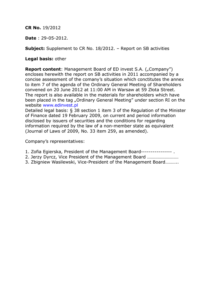 CR No. 19/2012 Date : 29-05-2012. Subject: Supplement to CR No. 18/2012. – Report on SB activities Legal basis: other Report content: Management Board of ED invest S.A. („Company”) encloses herewith the report on SB activities in 2011 accompanied by a concise assessment of the comany’s situation which conctitutes the annex to item 7 of the agenda of the Ordinary General Meeting of Shareholders convened on 20 June 2012 at 11:00 AM in Warsaw at 59 Złota Street. The report is also available in the materials for shareholders which have been placed in the tag „Ordinary General Meeting” under section RI on the website www.edinvest.pl Detailed legal basis: § 38 section 1 item 3 of the Regulation of the Minister of Finance dated 19 February 2009, on current and period information disclosed by issuers of securities and the conditions for regarding information required by the law of a non-member state as equivalent (Journal of Laws of 2009, No. 33 item 259, as amended). Company’s representatives: 1. Zofia Egierska, President of the Management Board---------------- . 2. Jerzy Dyrcz, Vice President of the Management Board ……………………… 3. Zbigniew Wasilewski, Vice-President of the Management Board……….. Sprawozdanie Rady Nadzorczej ED invest S.A. z działalności za 2011 rok W trakcie całego 2011 roku Rada Nadzorcza działała w następującym, niezmienionym, składzie: Bohdan Brym - Przewodniczący Henryk Kacprzak - Z-ca Przewodniczącego Edyta Rytel - Sekretarz Bartłomiej Bieleninnik - Członek Krzysztof Mikołajczyk - Członek Zwyczajne Walne Zgromadzenie Społki, ktore odbyło sie w dniu 22.06.2011 roku powołało Radę Nadzorczą w powyŜszym składzie na nową kadencję. Rada Nadzorcza ukonstytuowała się tego samego dnia w niezmienionym, wyŜej podanym składzie. Pełniąc swoje statutowe i regulaminowe obowiązki Rada Nadzorcza pełniła funkcję Komitetu Audytu i w ramach tej funkcji: - dokonała wyboru Biegłego Rewidenta do badania sprawozdań Społki powierzając tę funkcję ponownie firmie HLB Sarnowski & Wiśniewski Sp. z o.o. z siedzibą w Poznaniu, - analizowała i oceniała pracę Biegłego Rewidenta na spotkaniach z jego udziałem w trakcie analizy sprawozdań finansowych, - analizowała poprawność przyjętych przez Społkę metod rachunkowości, - analizowała sprawozdania finansowe i sprawozdania okresowe Zarządu Społki. Uchwałą Zwyczajnego Walnego Zgromadzenia nr 20 z dnia 22.06.2011 roku Społka zdecydowała o zastosowaniu MSR/MSSF od 01.01.2011 r. do prowadzenia ksiąg rachunkowych i prezentowania sprawozdań finansowych. W związku z przejściem na standardy MSR/MSSF, celem doprowadzenia do porownywalności danych Społka dokonała odpowiednich przeliczeń sprawozdań za okresy poprzednie w taki sposob jak gdyby standardy te były stosowane juŜ wcześniej. Poprawność przeliczenia sprawozdań za okresy poprzednie badał i analizował biegły rewident. Rada Nadzorcza na co kwartalnych posiedzeniach analizowała i oceniała poprawność okresowych sprawozdań finansowych i sprawozdań Zarządu oraz sprawozdania rocznego za rok 2011. Sprawozdania okresowe i sprawozdanie roczne za rok 2011 zostały zaopiniowane pozytywnie i niniejszym Rada Nadzorcza rekomenduje Walnemu Zgromadzeniu zatwierdzenie sprawozdania finansowego i sprawozdania zarządu z działalności społki za rok 2011. W trakcie roku Rada Nadzorcza podejmowała uchwały w sprawie: - zatwierdzenia Regulaminu Organizacyjnego Społki uchwała z dnia 23.03.2011 r. - wyraŜenie zgodny na nabycie nieruchomości, połoŜonej w Warszawie przy ul. Dywizjonu 303, przeznaczonej pod budownictwo mieszkaniowe o powierzchni 0,2539 ha. z dnia 23.03.2011r. - w sprawie zaopiniowania propozycji podziału zysku za rok 2010 uchwała z dnia 19.05.2011 r. - w sprawie wyraŜenia zgody na zawarcie umowy przeniesienia praw dotyczących nieruchomości przy ulicy Dywizjonu 303 na Plano Sp. z o.o., oraz zawarcia z tą Społką umowy powierniczej. Uchwała z dnia 17.06.2011 r.. - uchwała w sprawie powołania Zarządu Społki na nową kadencję oraz ustalenia wynagrodzenia dla członkow Zarządu, uchwały dnia 22.06.2011 r - uchwała w sprawie przedłuŜenia wspołpracy z biegłym rewidentem na rok 2011, uchwała z dnia 21.07.2011 r. - uchwała w sprawie wyraŜenia zgody na zawarcie umowy z Przedsiębiorstwem Budowlanym WARSKOP na kompleksową budowę 9 budynkow mieszkalnych wraz z infrastrukturą w Nowej Woli. Uchwała z dnia 16.08.2011. - uchwała w sprawie zaopiniowania ceny skupu akcji własnych Społki. Uchwała z dnia 29.09.2011 r. - uchwała w sprawie wyraŜenia zgody na zawarcie umowy inwestycyjnej z firmą ARKINWEST sp.z o.o., dotyczącej przyrzeczenia sprzedaŜy gruntu w Nowej Woli. Uchwała z dnia 02.11.2011 r. - uchwała w sprawie wyraŜenia zgody na zbycie nieruchomości w miejscowości Zamienie. Uchwała z dnia 09.01.2012 r. Ponadto Zarząd Społki konsultował z Radą szereg decyzji dotyczących składania ofert oraz podpisywania listow intencyjnych dotyczących pozyskiwania nieruchomości bądź partnerow dla kontynuowania podstawowej działalności Społki. Oceniając pracę Zarządu Rada Nadzorcza wyraŜa opinię, Ŝe działania podejmowane przez Zarząd w trakcie minionego roku były racjonalne i dobrze przygotowane. Zarząd unikał zbędnego ryzyka i koncentrował się na działaniach, ktore były dla Społki opłacalne. NaleŜy podkreślić, iŜ rok 2011 na rynku deweloperskim charakteryzował się narastającą konkurencją oraz spadkiem popytu na rynku lokali mieszkalnych. Szczegolnego podkreślenia wymaga sprawne zakończenie realizacji zadania Wilga VII, ktore przyniosło Społce znaczące korzyści finansowe. Przedstawiając niniejsze sprawozdanie Rada Nadzorcza wnioskuje do Walnego Zgromadzenia o: - zatwierdzenie sprawozdania Zarządu z działalności Społki za rok 2011, - zatwierdzenia sprawozdania finansowego Społki, - udzielenia absolutorium Prezesowi i Wiceprezesom Zar